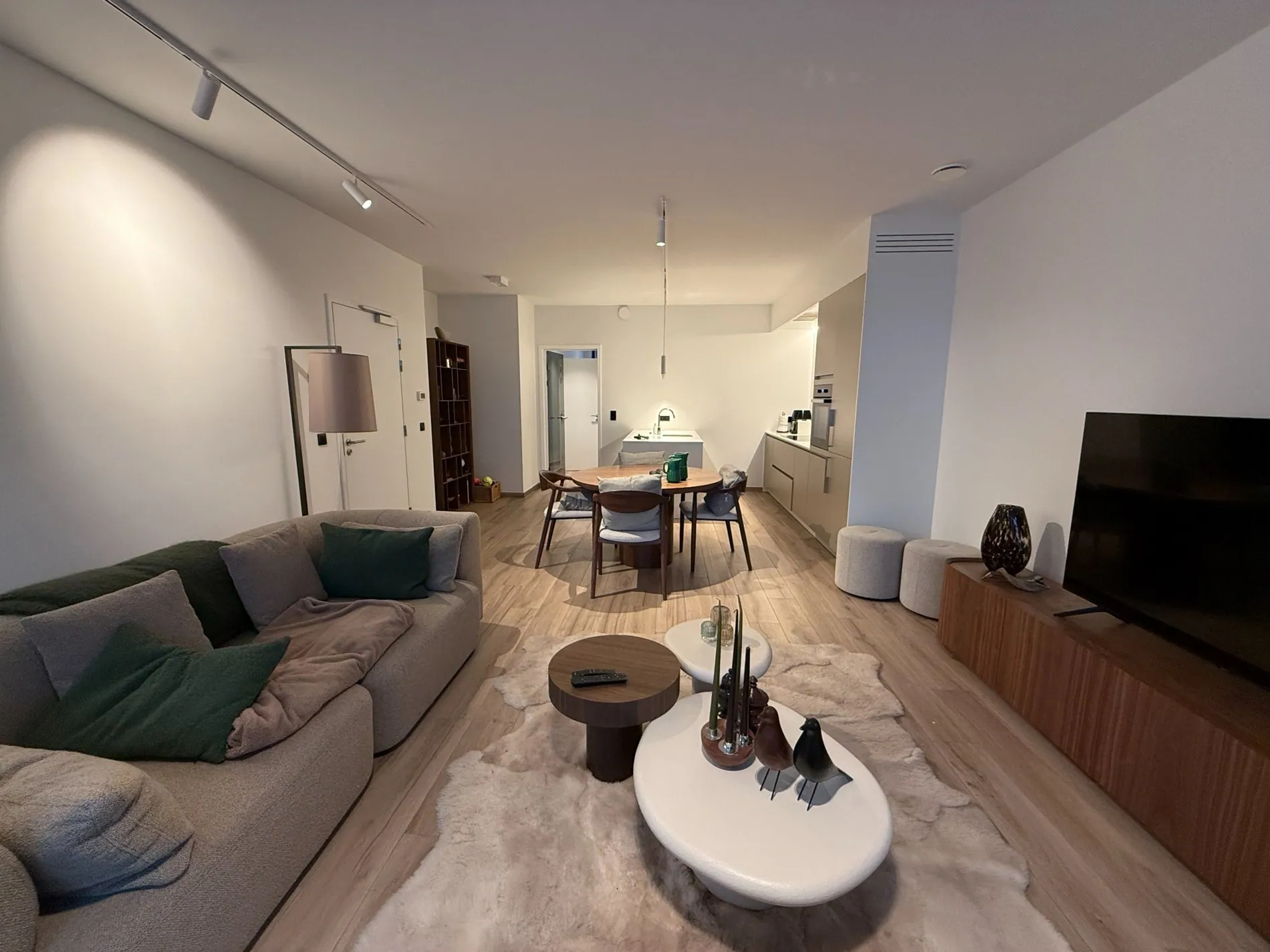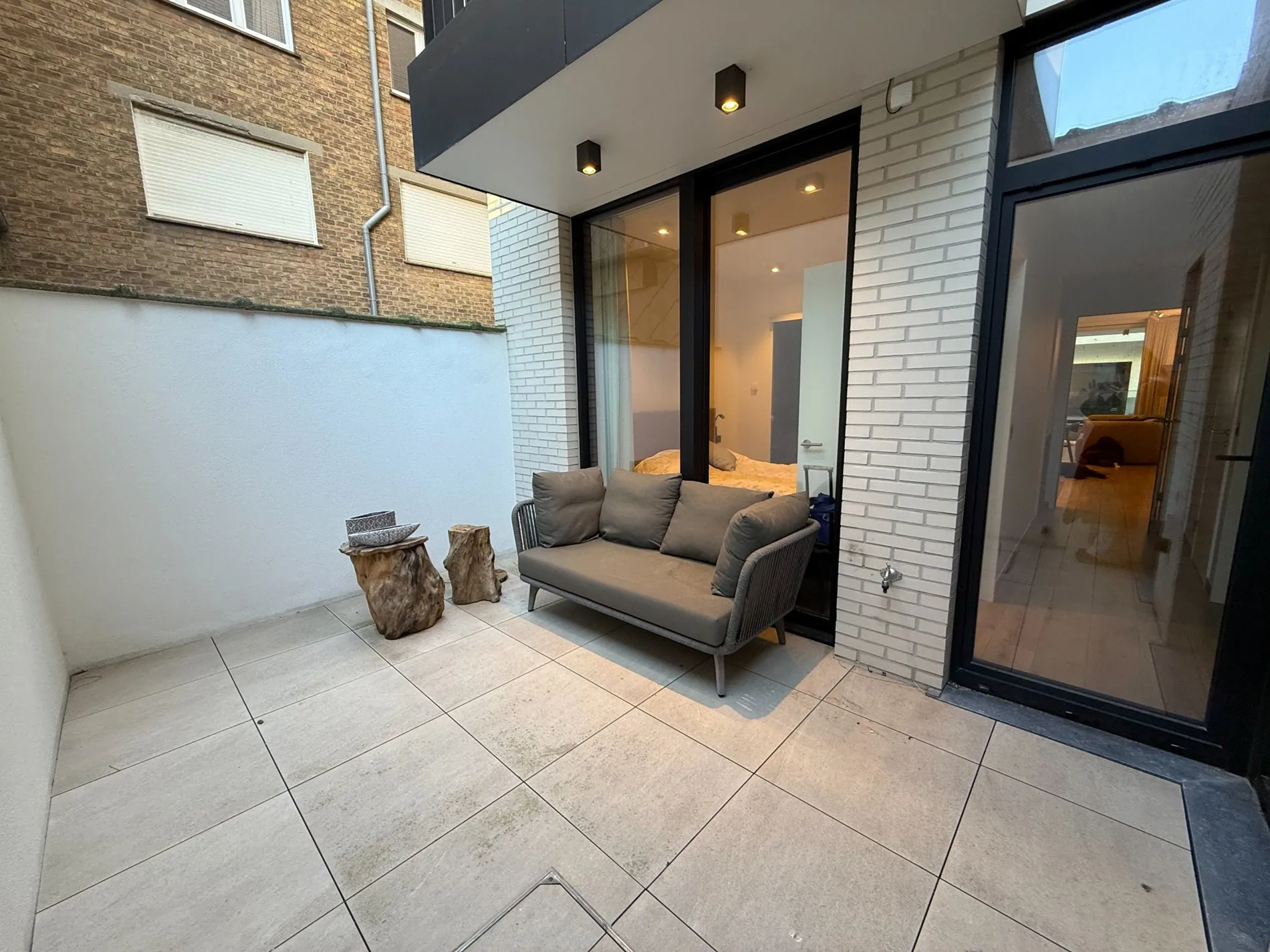 - Bij het betreden van het gelijkvloers appartement komen we in de open leefruimte met bijzonder veel lichtinval, op de vloer werd een Belgisch/Italiaans keramisch designparket gelegd.