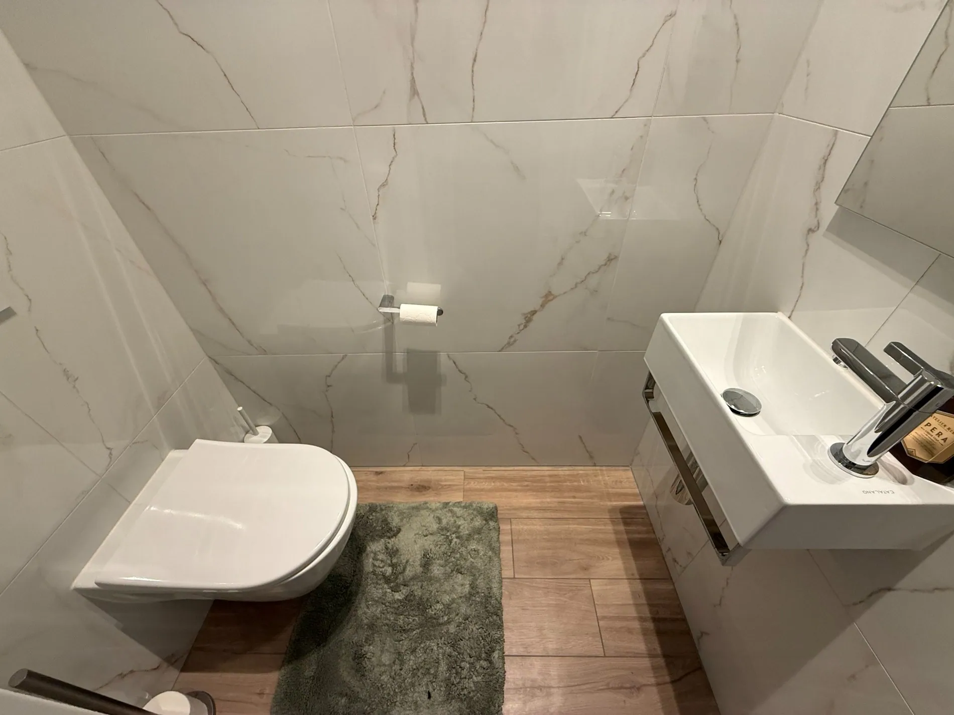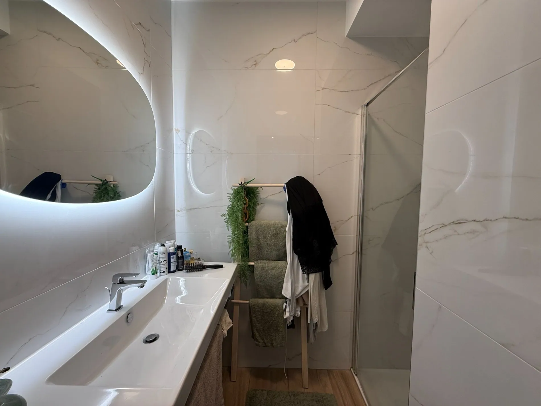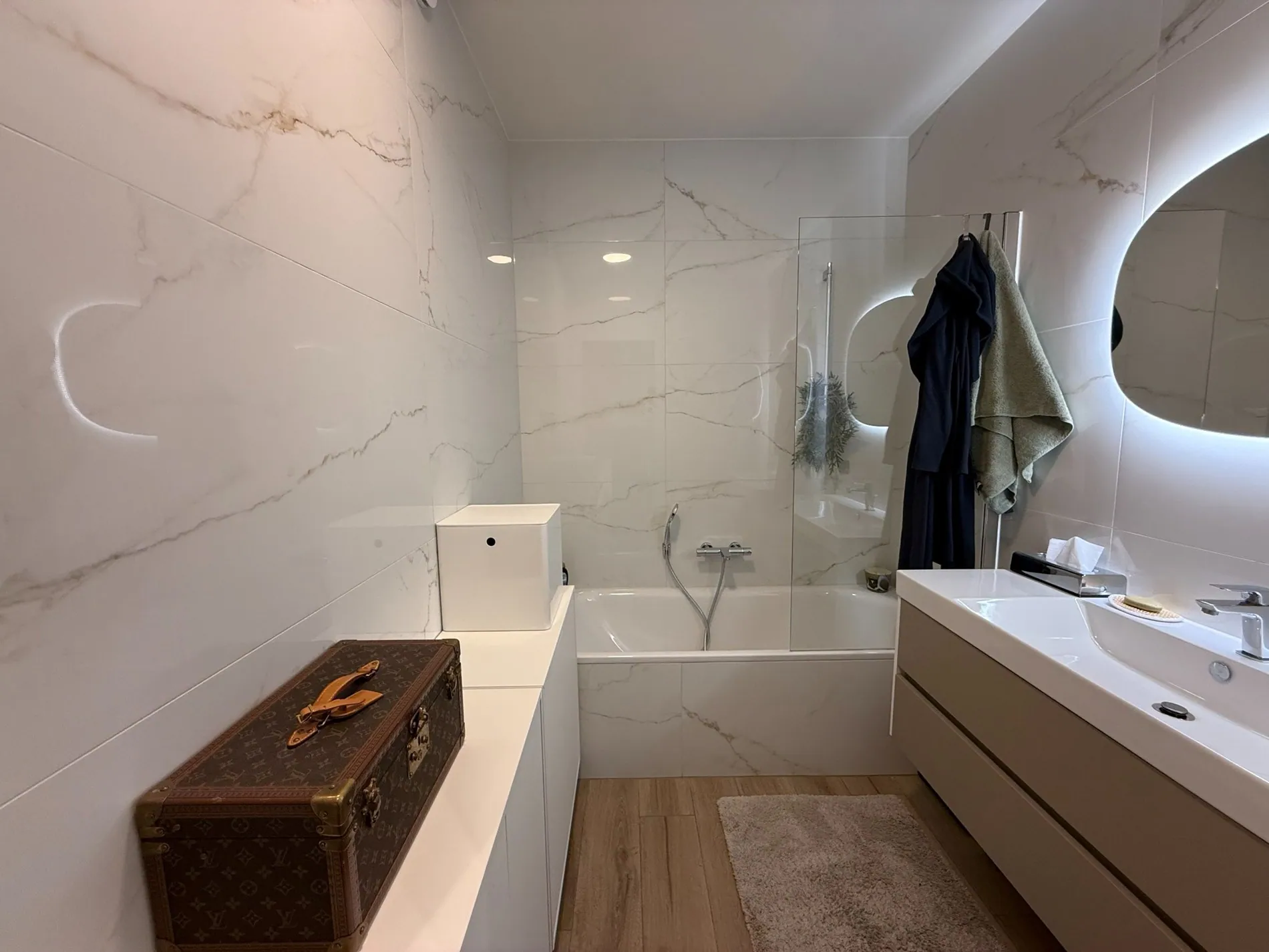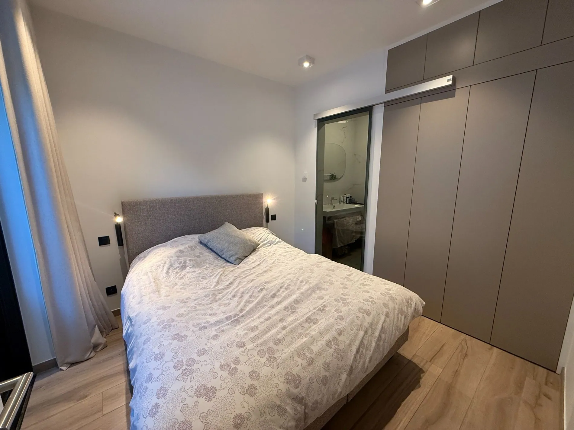 - Vervolgens komen we in de masterbedroom met aansluitend eigen badkamer voorzien van bad/douche-combinatie en ruime wastafel, volgende materialen werden gebruikt in elke badkamer: Italiaans CATALANO keramiek met NOBILI verchroomd kraanwerk, Duitse KALDEWEY douche/bad (hotelkwaliteit)