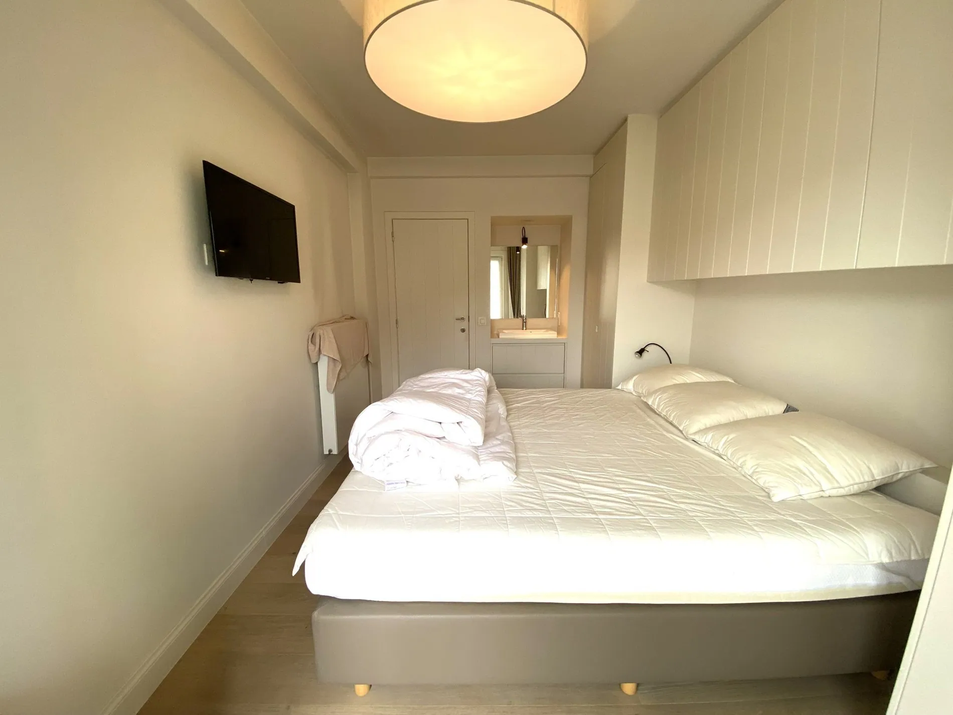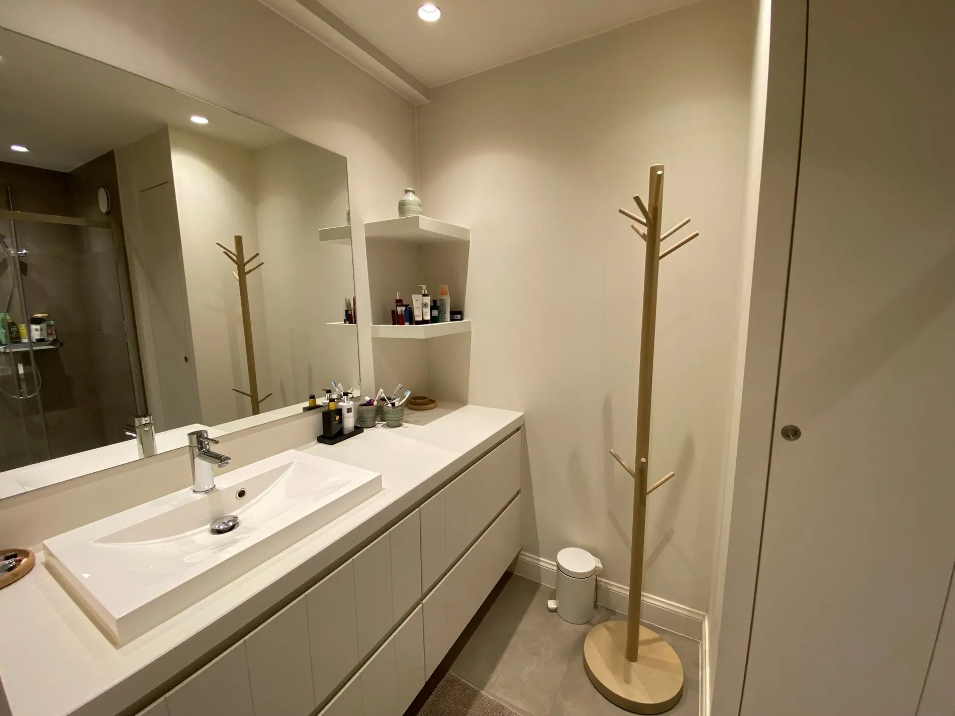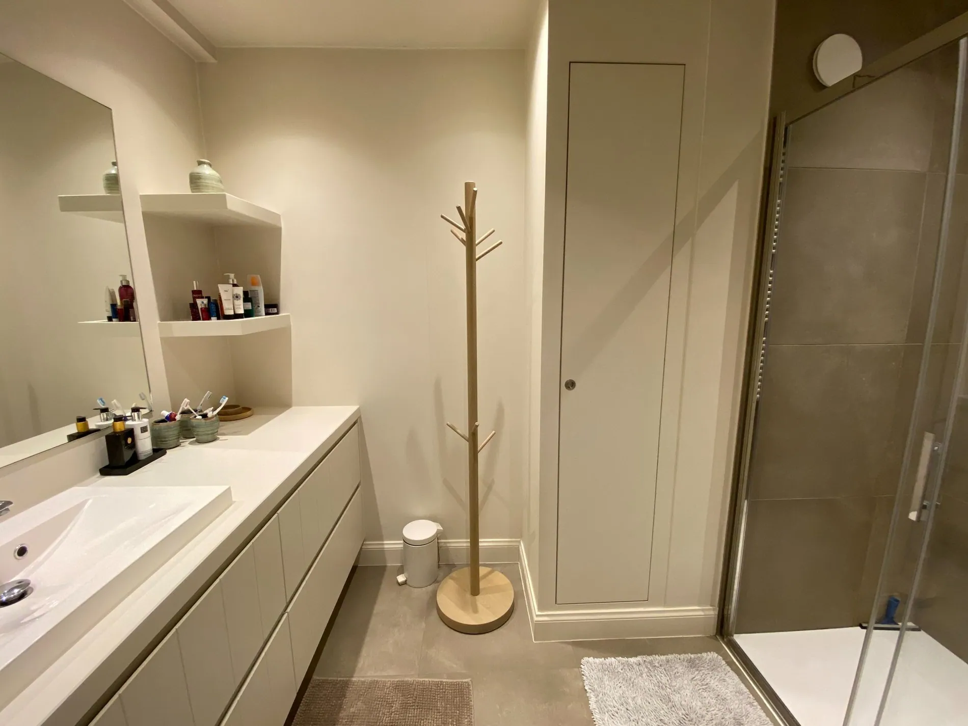 - Badkamer met inloopdouche, lavabo en veel opbergruimte.
