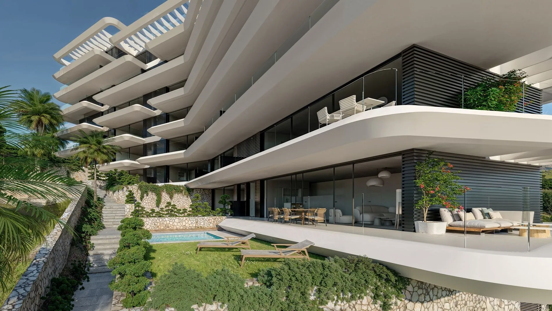 De appartementen zijn volledig uitgerust met een ingerichte keuken, airconditioning, verwarming en dubbele beglazing voor optimaal wooncomfort. De woningen op de begane grond zijn voorzien van een tuin en een privézwembad, terwijl de penthouses een prachtig solarium en een dakterras met zwembad hebben.