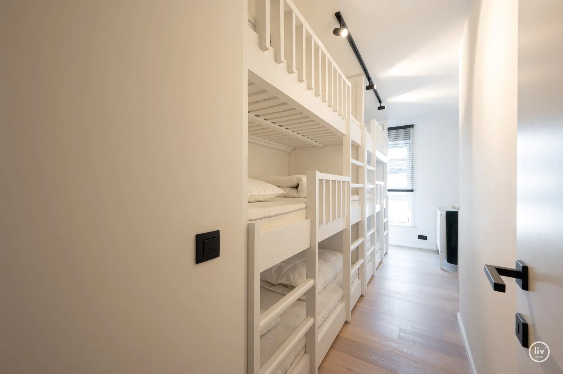 Dit net gerenoveerde 3-kamer appartement ligt op wandelafstand van de Lippenslaan en heeft een zongericht terras. De indeling bestaat uit een inkomhall, gastentoilet, ruime woonkamer met een gevelbreedte van 8 meter, en een open keuken met een grote eettafel die aansluit op de living. Er zijn drie slaapkamers, waarvan één met twee stapelbedden van elk drie bedden. Daarnaast zijn er een badkamer en een aparte douchekamer. Het appartement is volledig instapklaar!