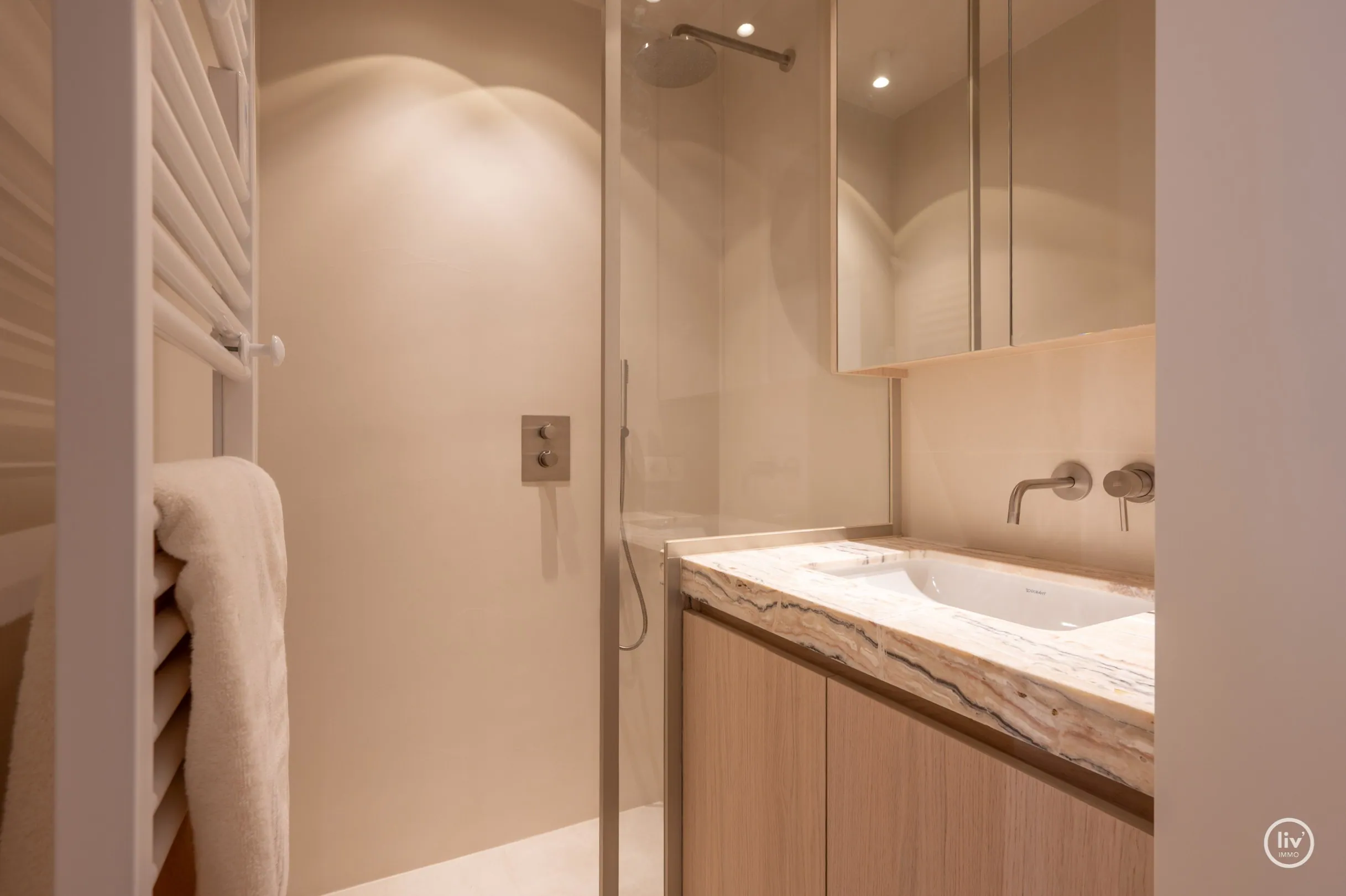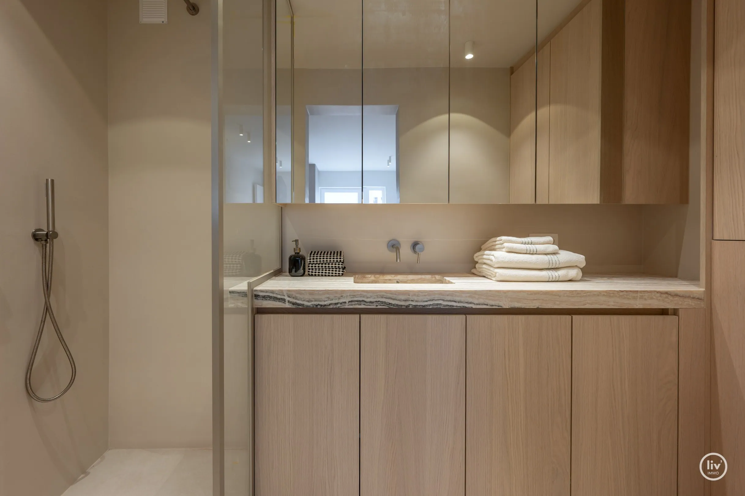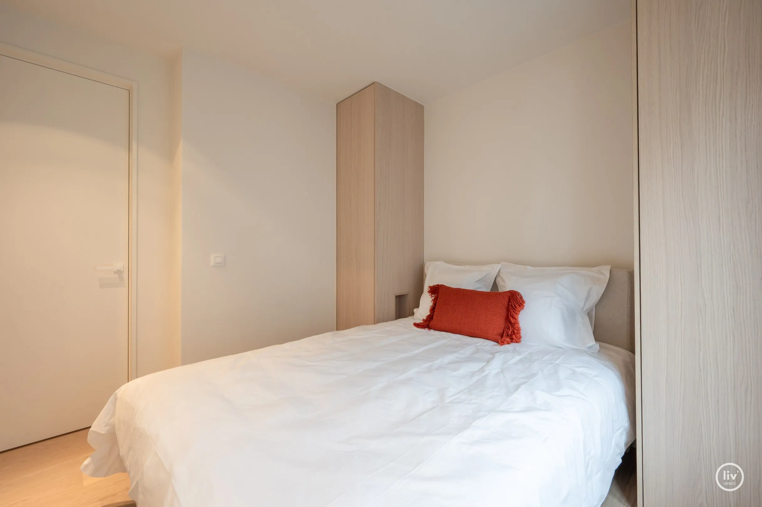 2 slaapkamers met ingemaakte kasten, Derde kleinere kamer met bed van 1m40. 2 douchekamers met douche, lavabo.