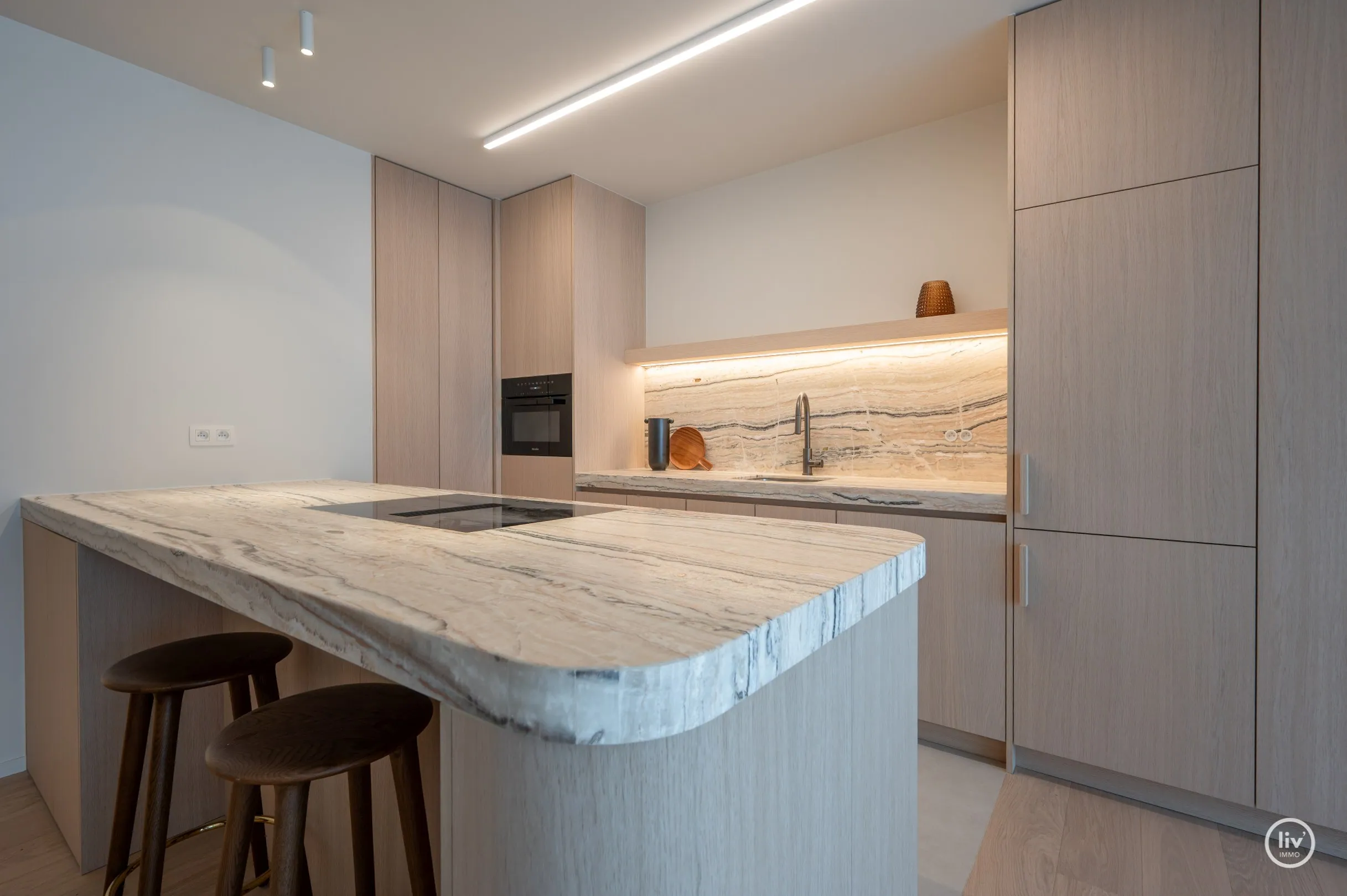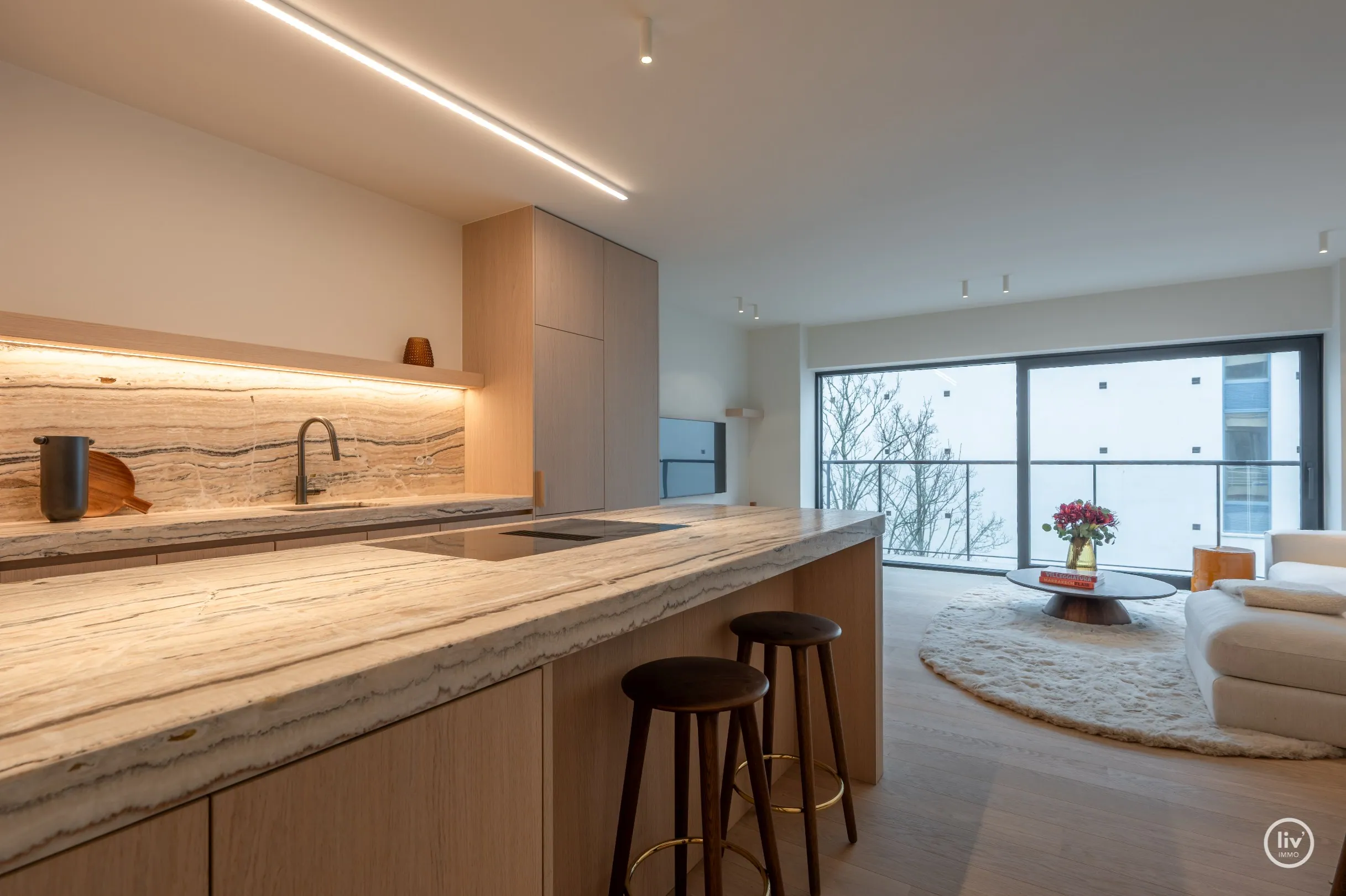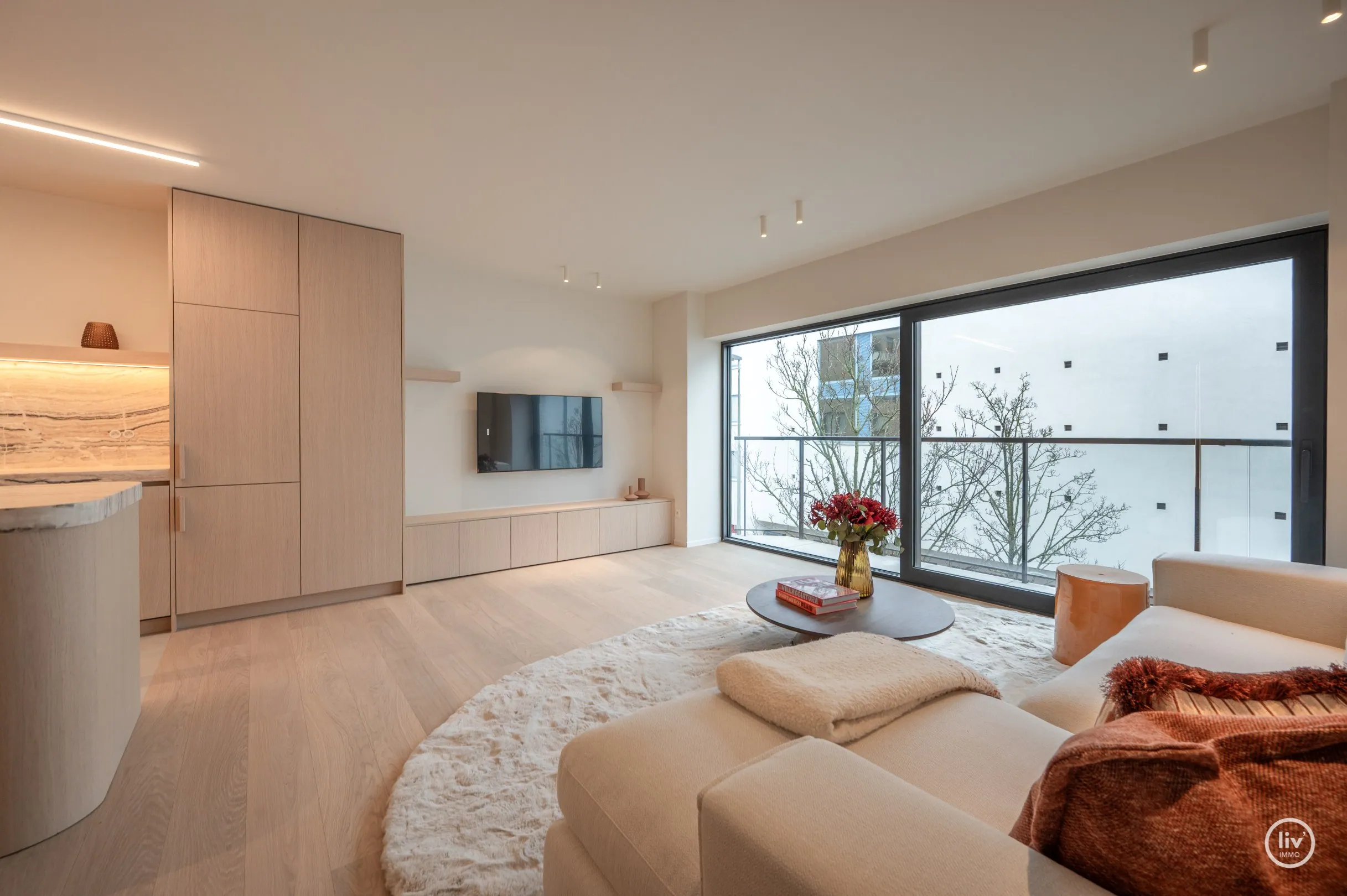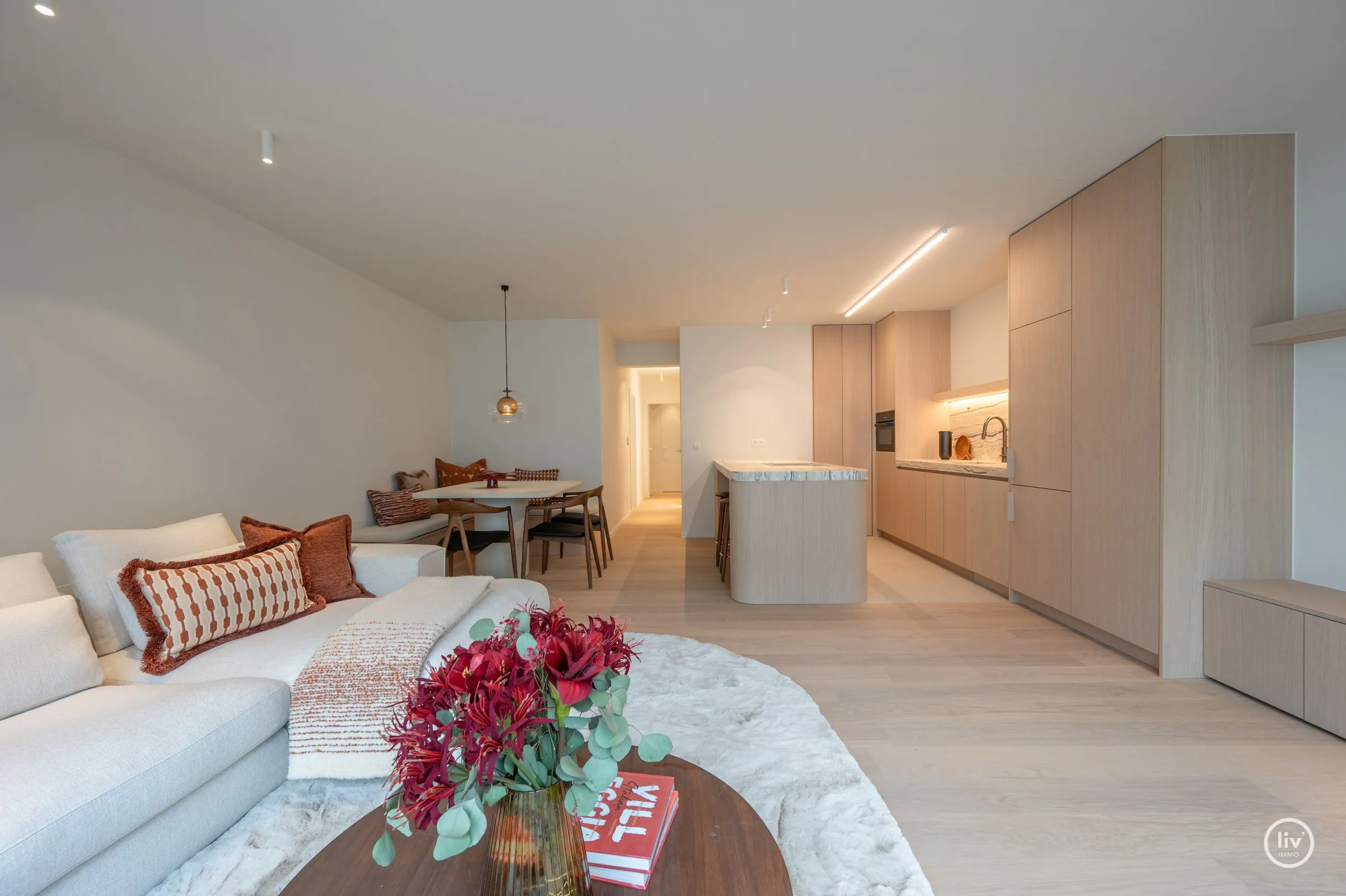 inkomhall met vestiaire en apart toilet, aangename lichtrijke leefruimte met eetgedeelte en open keuken.