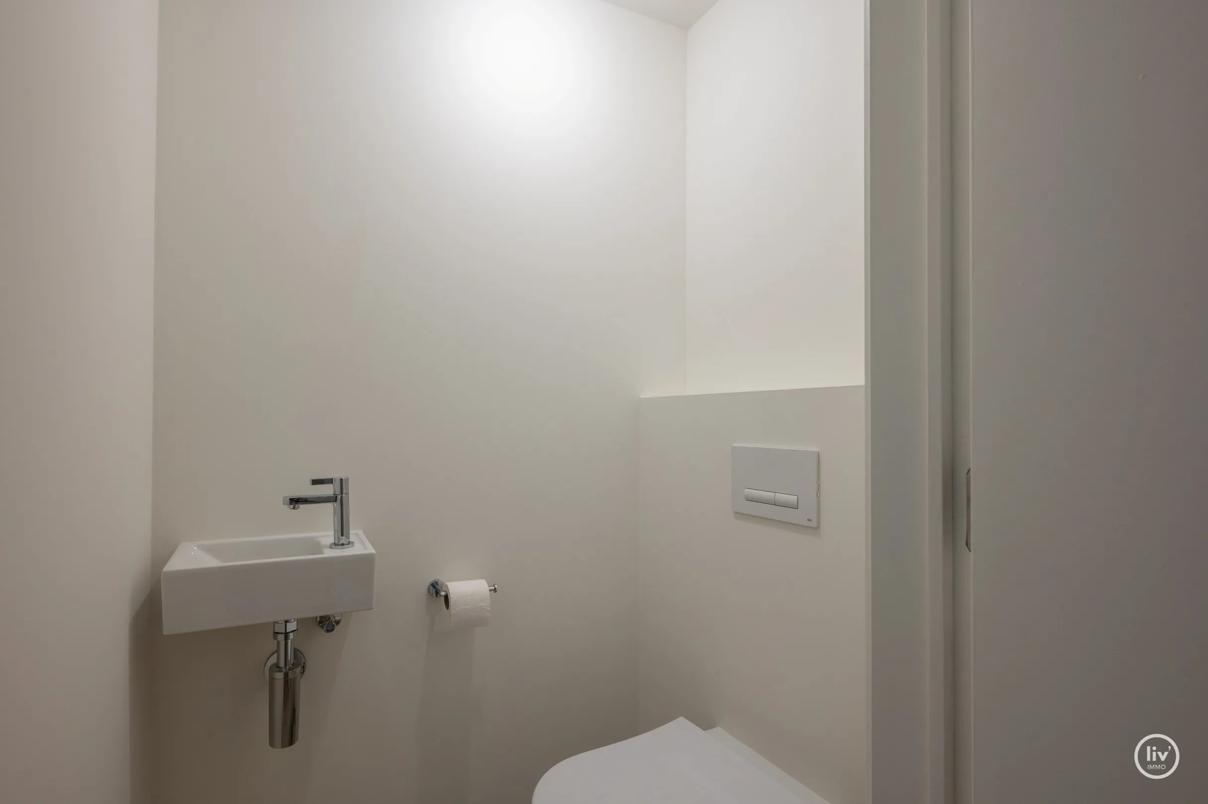 Ruime Inkomhal met een apart gastentoilet , gezellige living met aanpalend een terras, open keuken voorzien van alle luxe comfort, 2 volwaardige slaapkamers, badkamer met douche en lavabo.