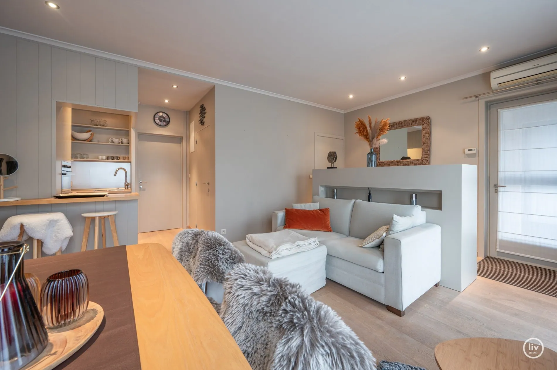 Een appartement met veel lichtinval, in de woonkamer ligt een parket vloer, er is een apart toilet, een kitchenette, een badkamer met inloopdouche en lavabo, en een ruime slaapkamer die plaats biedt voor 4 personen.