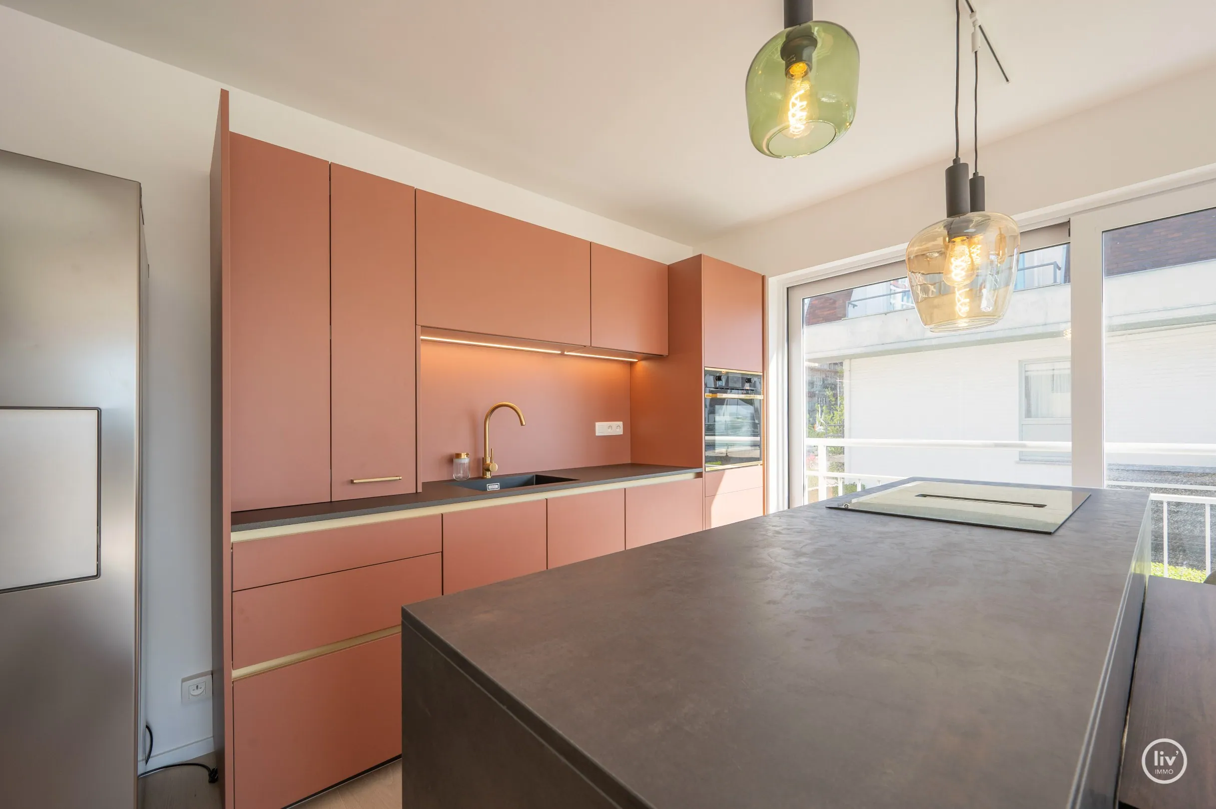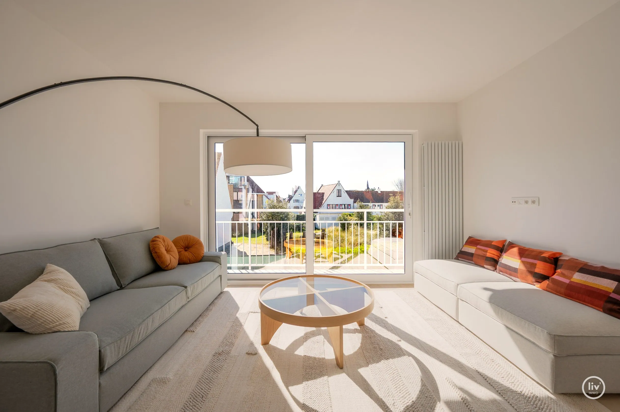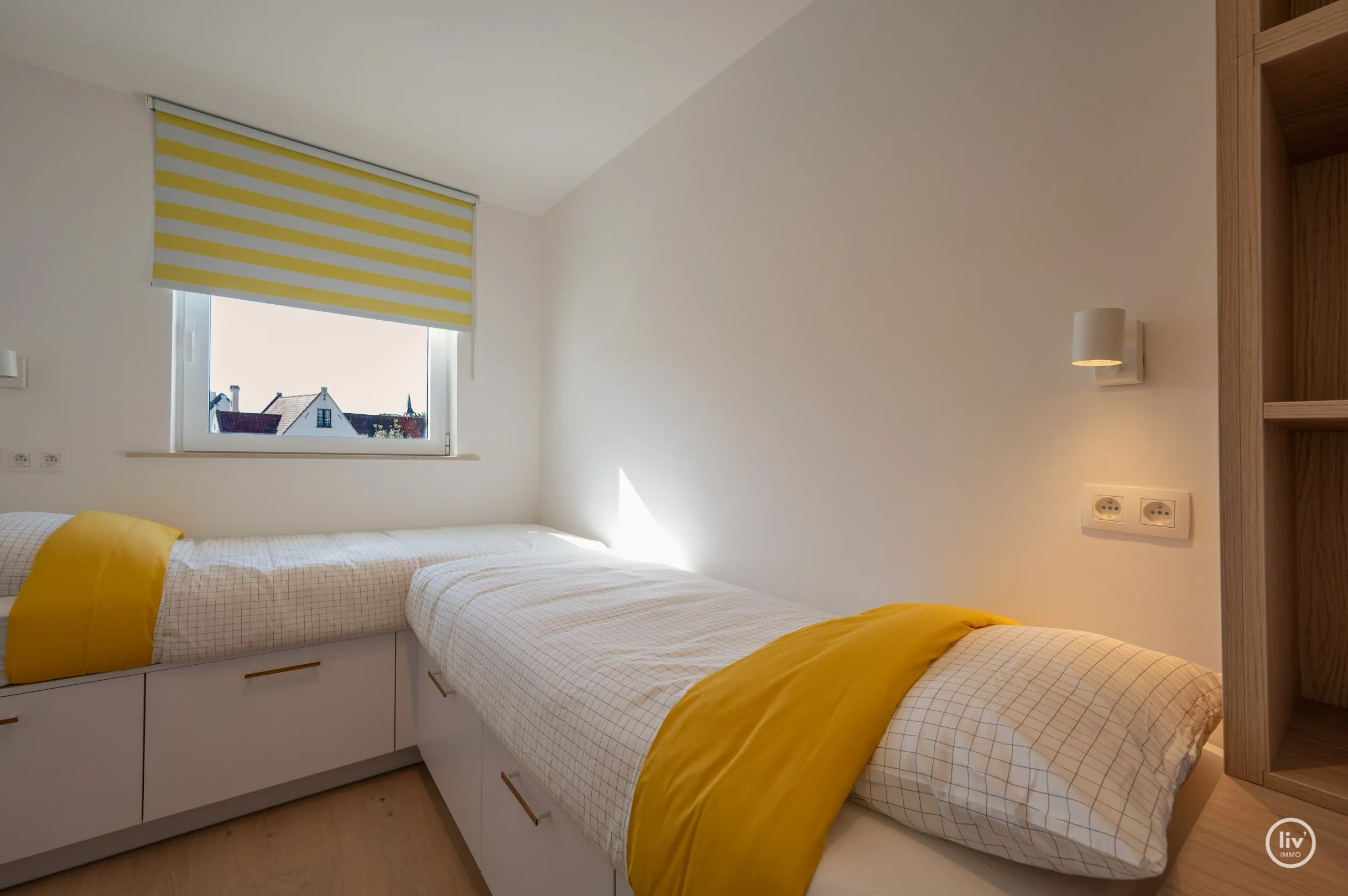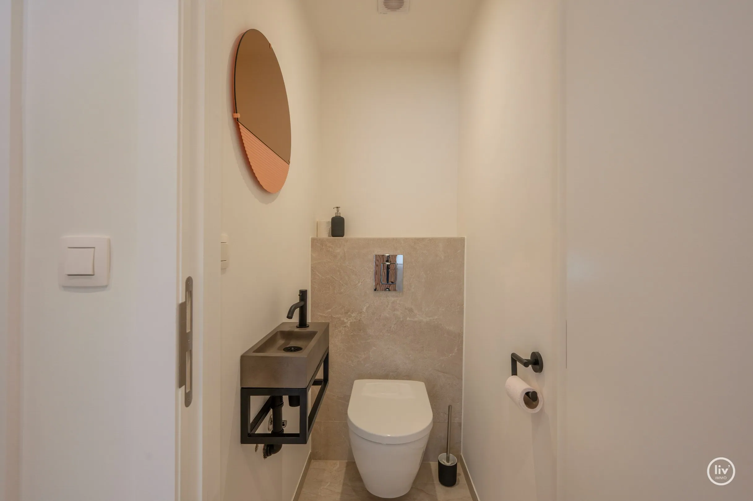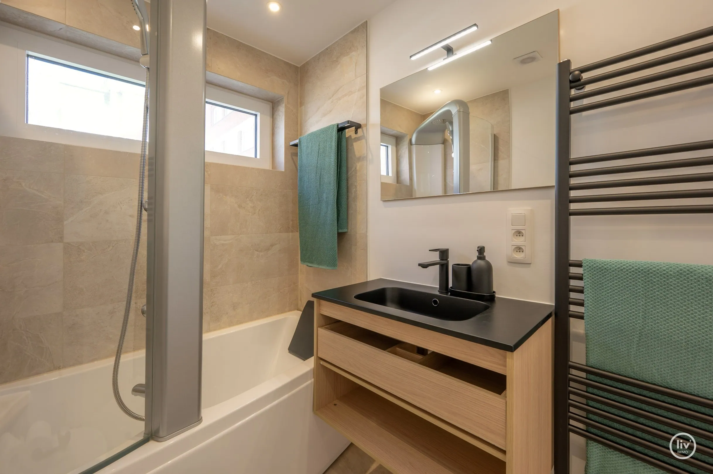 Indeling: inkomhal met vestiaire en gastentoilet. Lichtrijke, zuidgerichte hoekwoonkamer die uitgeeft op het zonnige terras met open zicht. Open, volledig ingerichte keuken. Twee volwaardige slaapkamers, waarvan één met aansluitende badkamer voorzien van ligbad en toilet, en een tweede slaapkamer met eigen douchekamer.