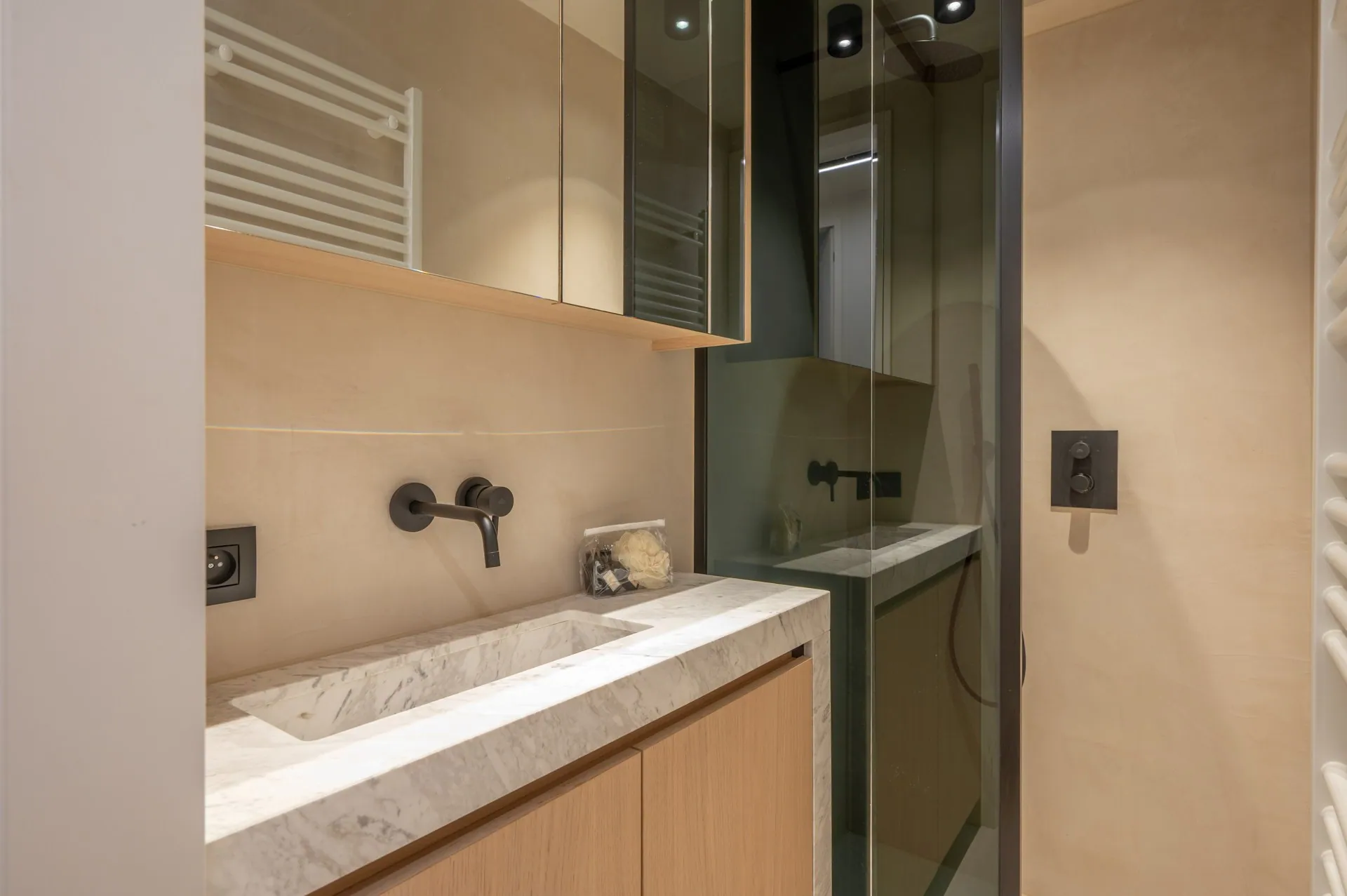 Masterbedroom met ingemaakte kasten, aanpalende douchekamer (dubbele lavabo, inloopdouche en tweede toilet), de twee overige slaapkamers zijn ook telkens voor dubbel bed en voorzien van ingemaakte kasten. douchekamer, apart toilet en berging met aansluiting voor wasmachine.