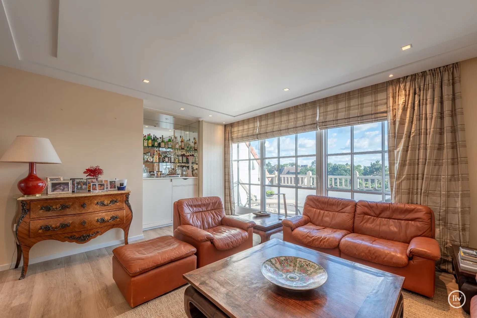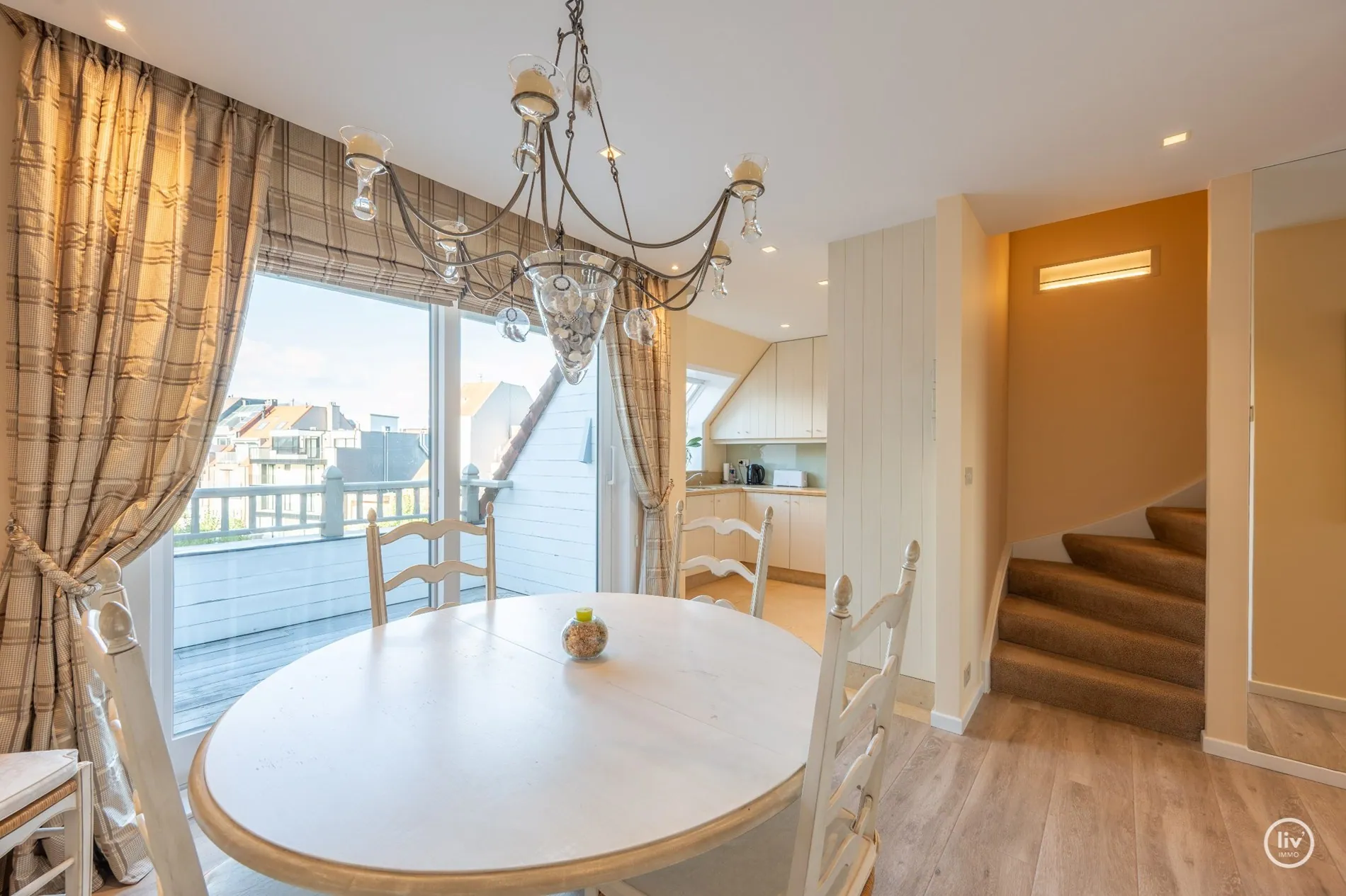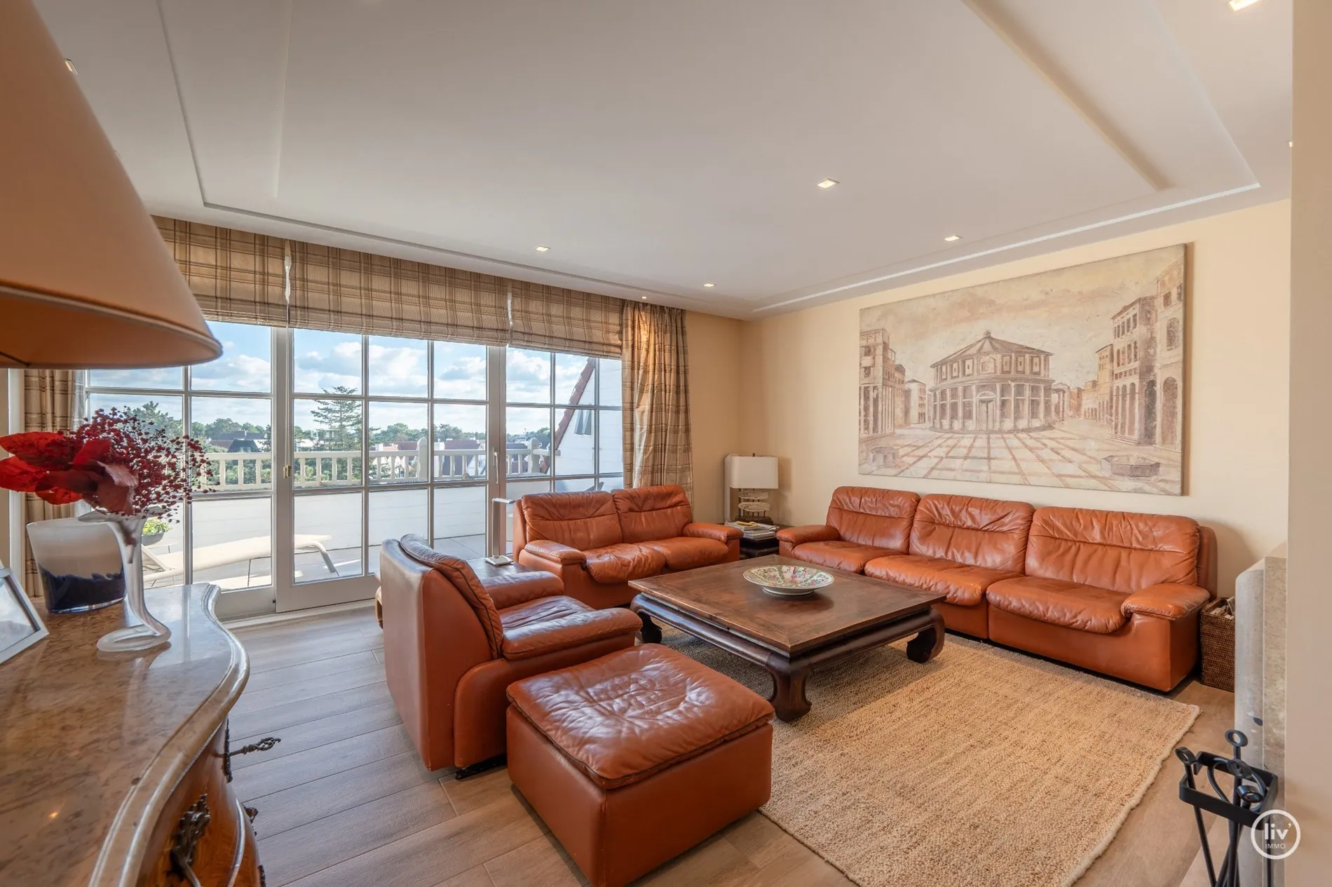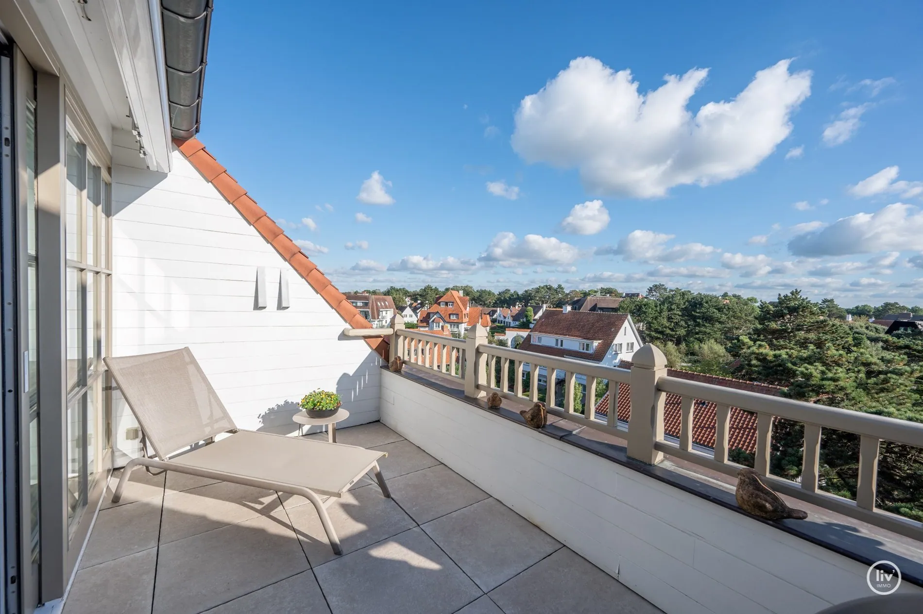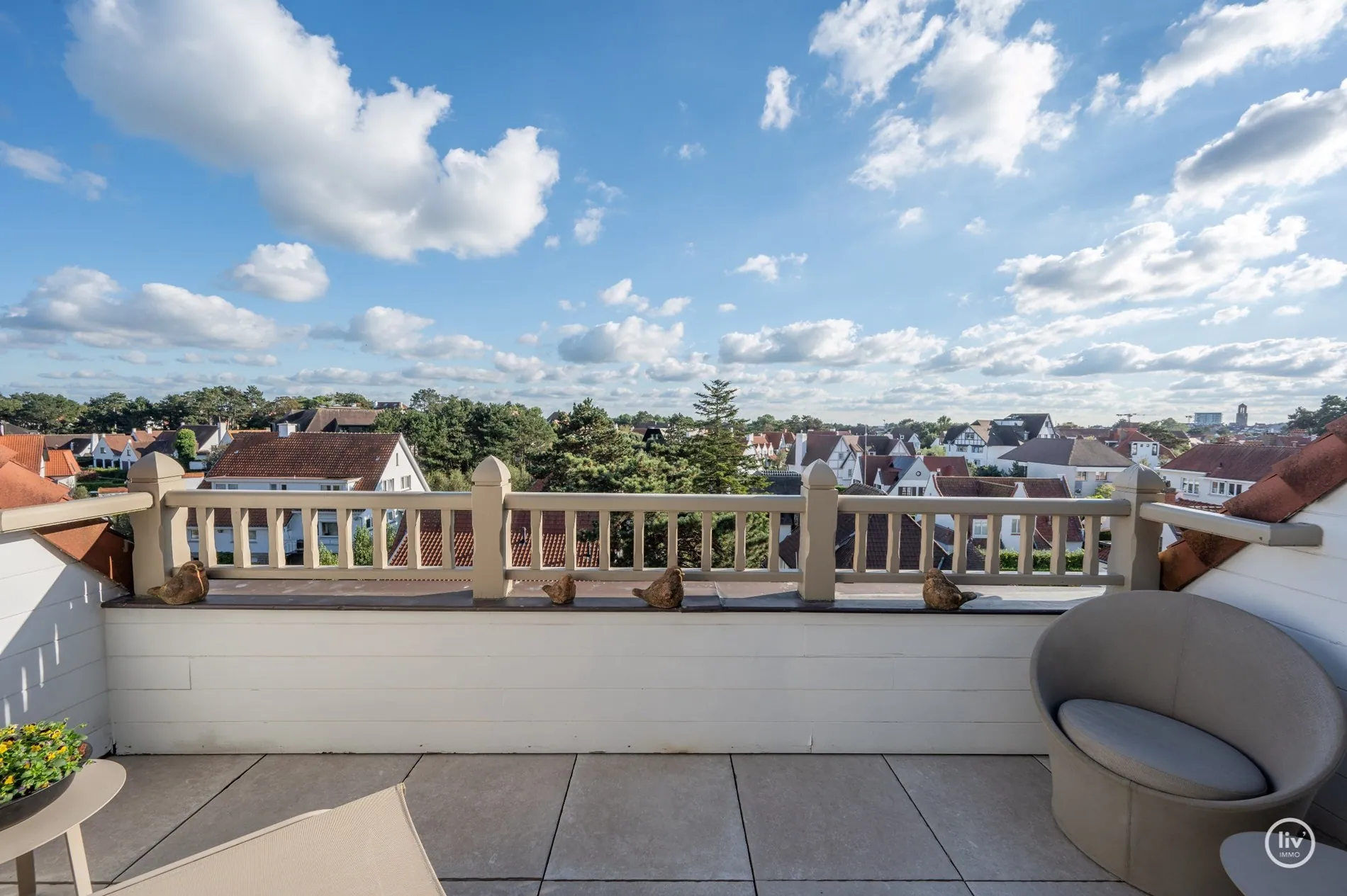 Uitzonderlijk dakappartement met een schitterend zonneterras en een prachtig open zicht over de villa's van het Zoute, gelegen tussen het centrum van Knokke.