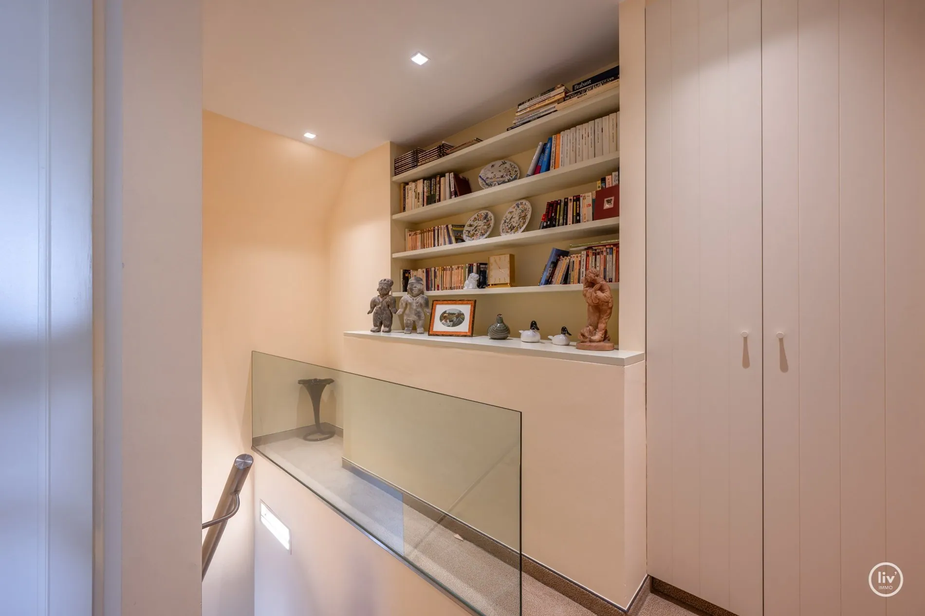 Indeling: inkomhal, berging, vestiaire en gastentoilet. Zonnige living met open haard (hout) uitgevend op het ruim zonneterras met prachtig zicht