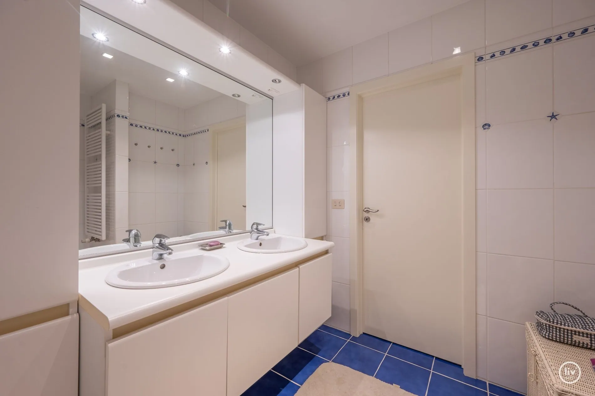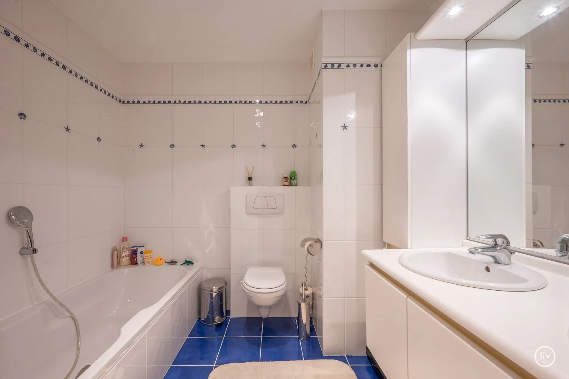 Op de verdieping: 2 slaapkamers met ingemaakte kasten. Badkamer met ligbad, dubbele lavabo en toilet. Douchekamer met enkele lavabo en toilet.Individuele kelder. Mogelijkheid van aankoop van een garagebox en/of parkeerplaats in de residentie.