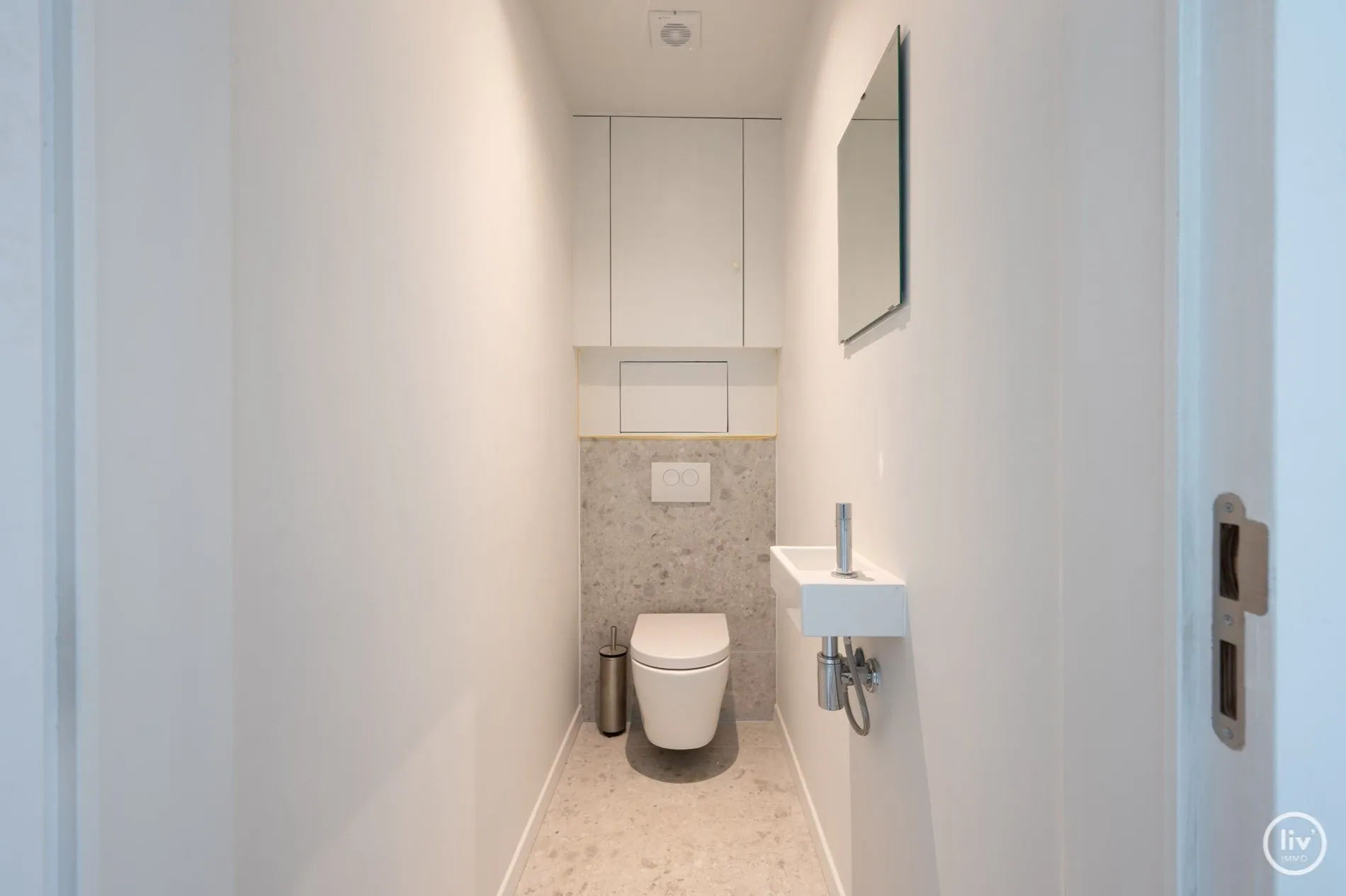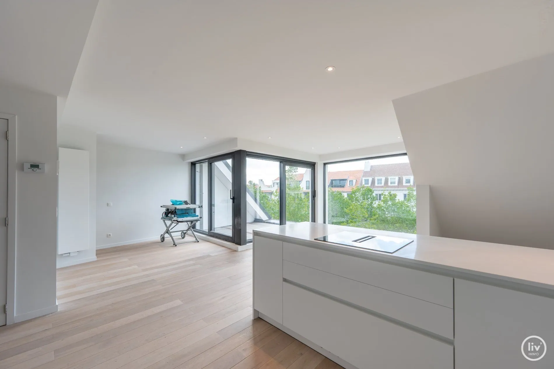 Indeling: inkomhall, vestiaire, gastentoilet, leefruimte met aansluitend ruim zonneterras, volledig uitgeruste open keuken,