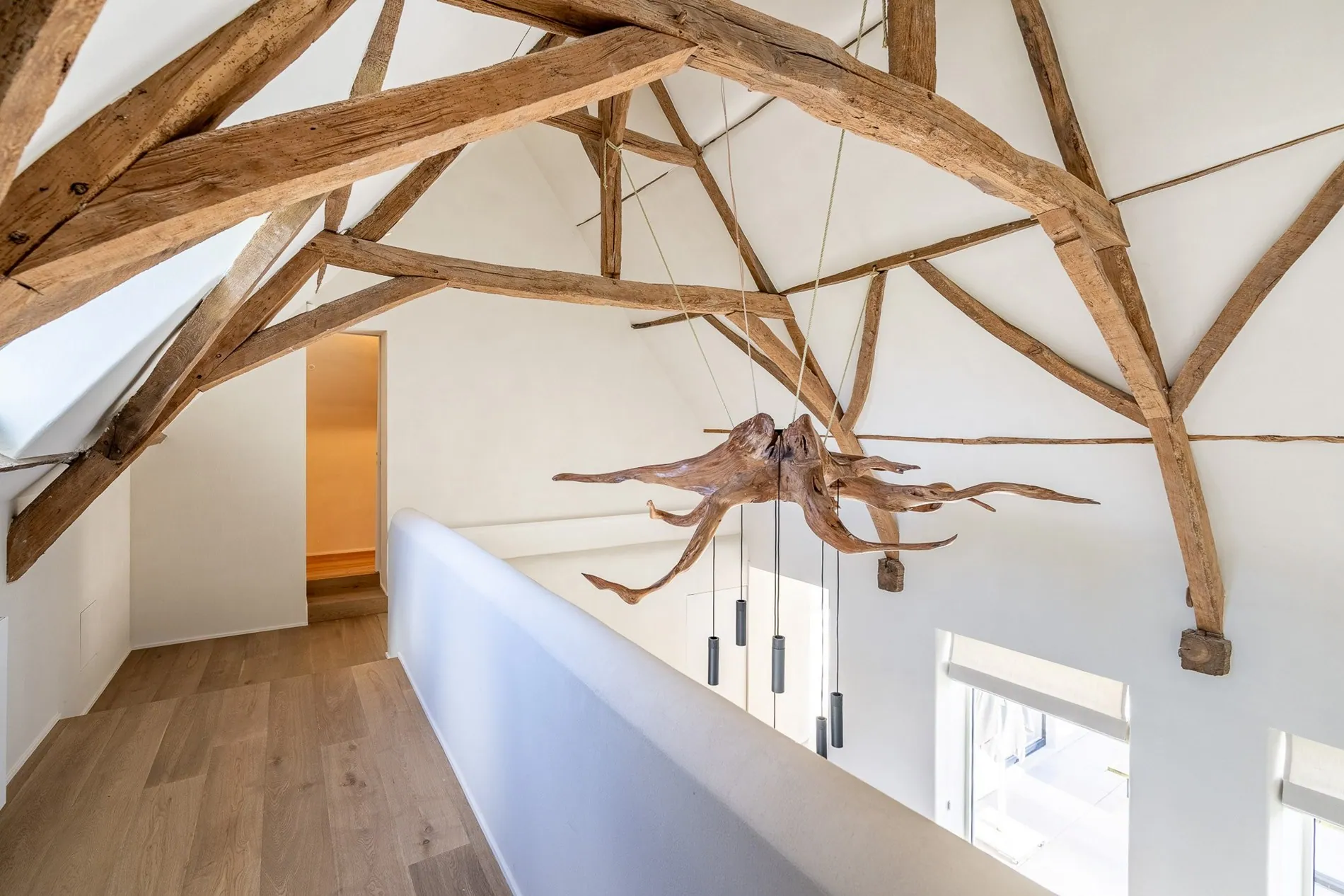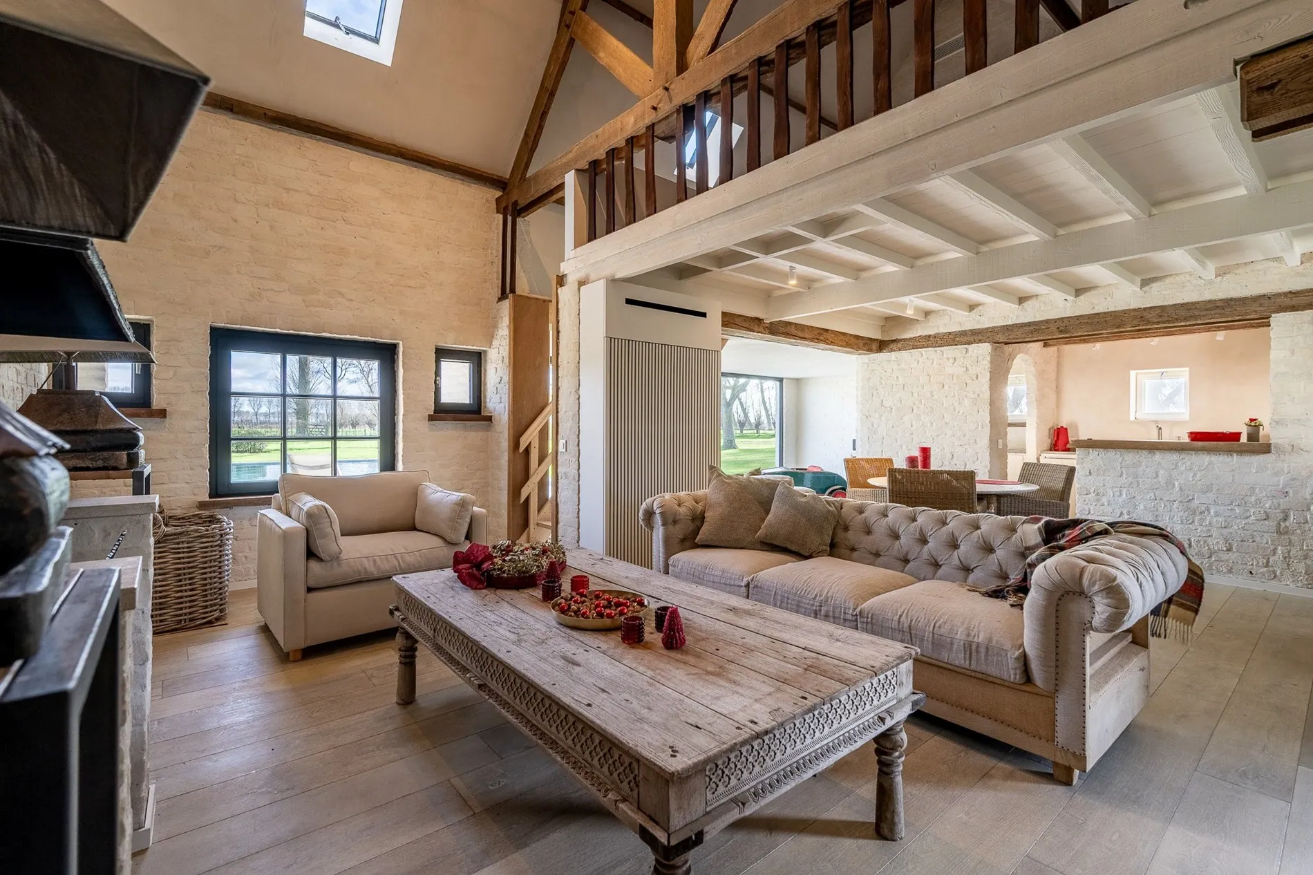 Indeling : Prachtige oprit die toegang heeft tot de hoeve, omringd door bomen, inkomhal met vestiaire en gastentoilet, gezellige zithoek met open haard, eetplaats, grenzend aan een uiterst afgewerkte keuken met eiland en een extra leefruimte uitgevend op een zongeorienteerd terras. Bijken en wasplaats, bureauruimte , ruime slaapkamer op het gelijkvloers met ensuite badkamer.