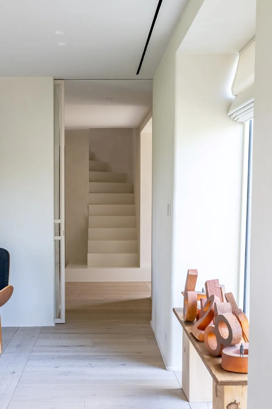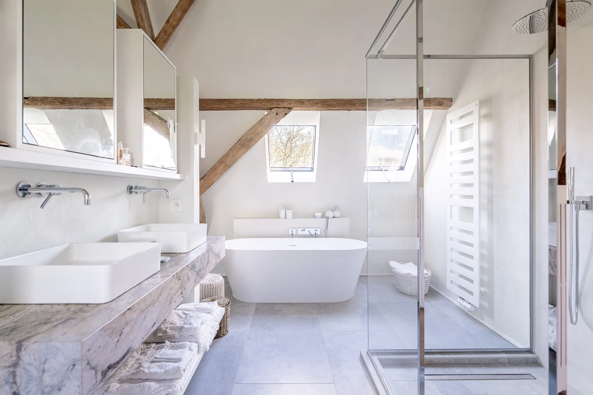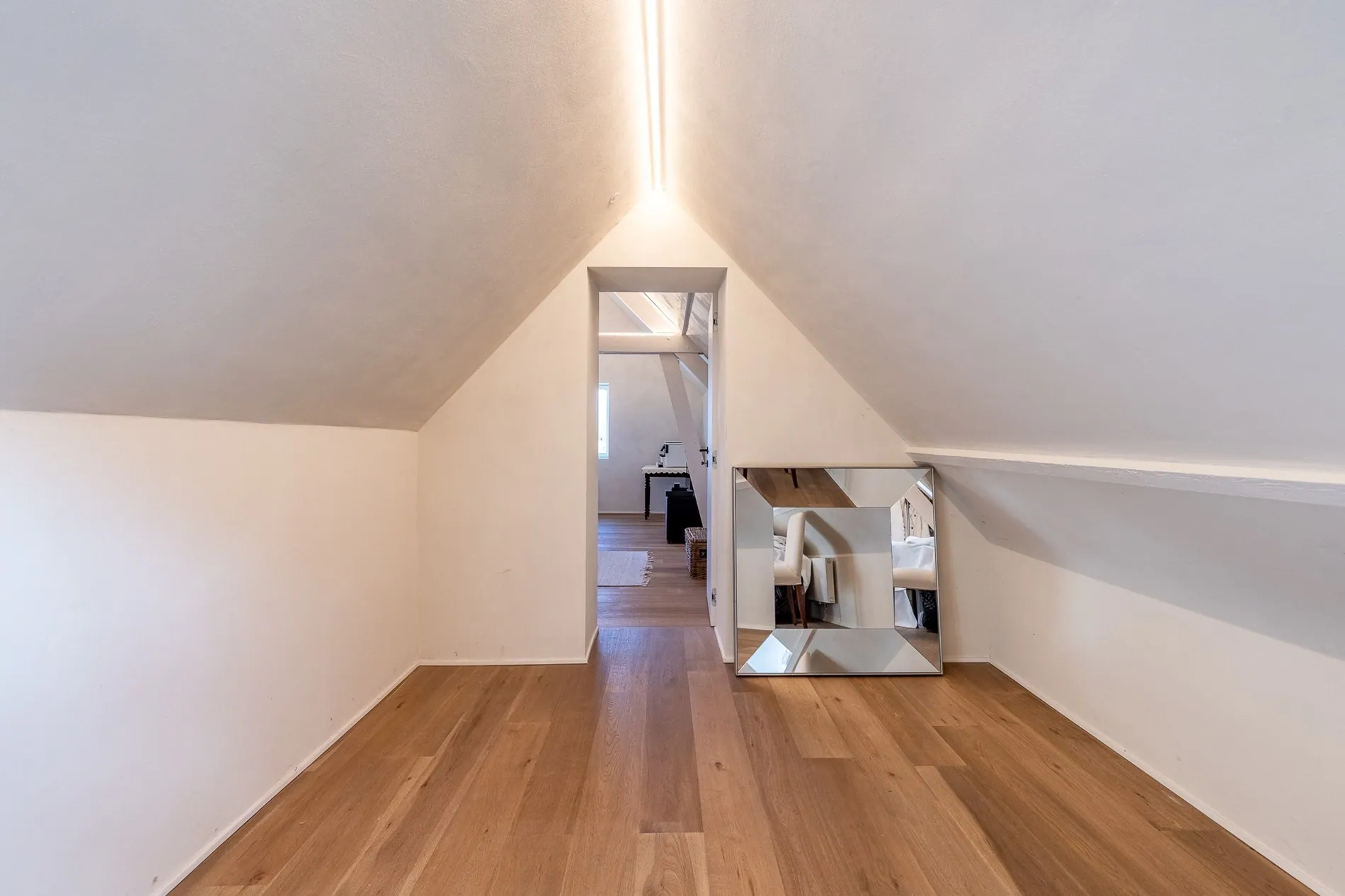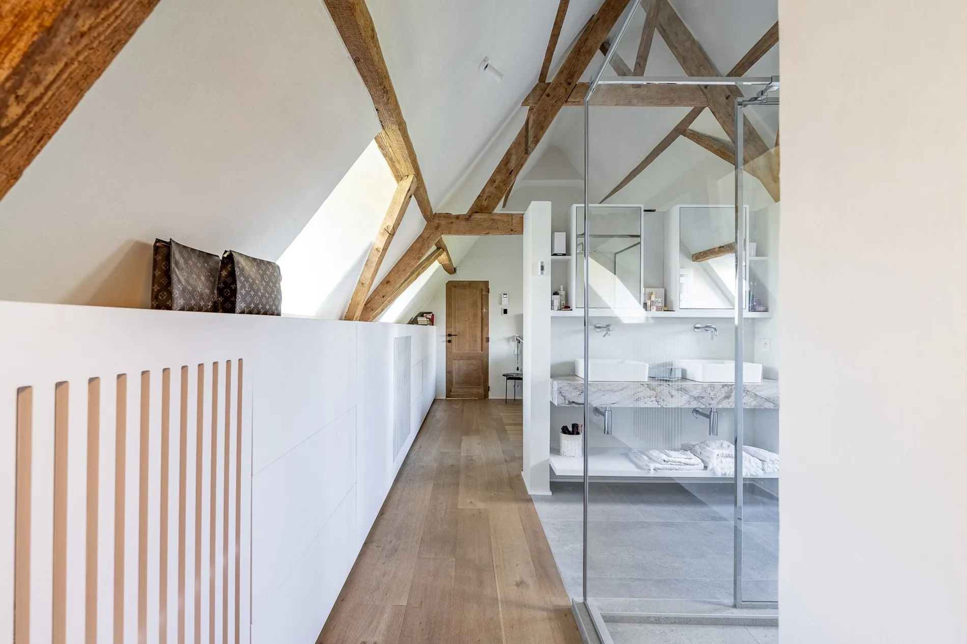 Op het verdiep bevinden zicht 3 slaapkamers, telkens voorzien van maatkasten, 3 badkamers en een doorgang tot een polyvalente ruimte/bureel voor vrije beroepen, ook te bereiken via een aparte toegang aan de zijkant van de woning.