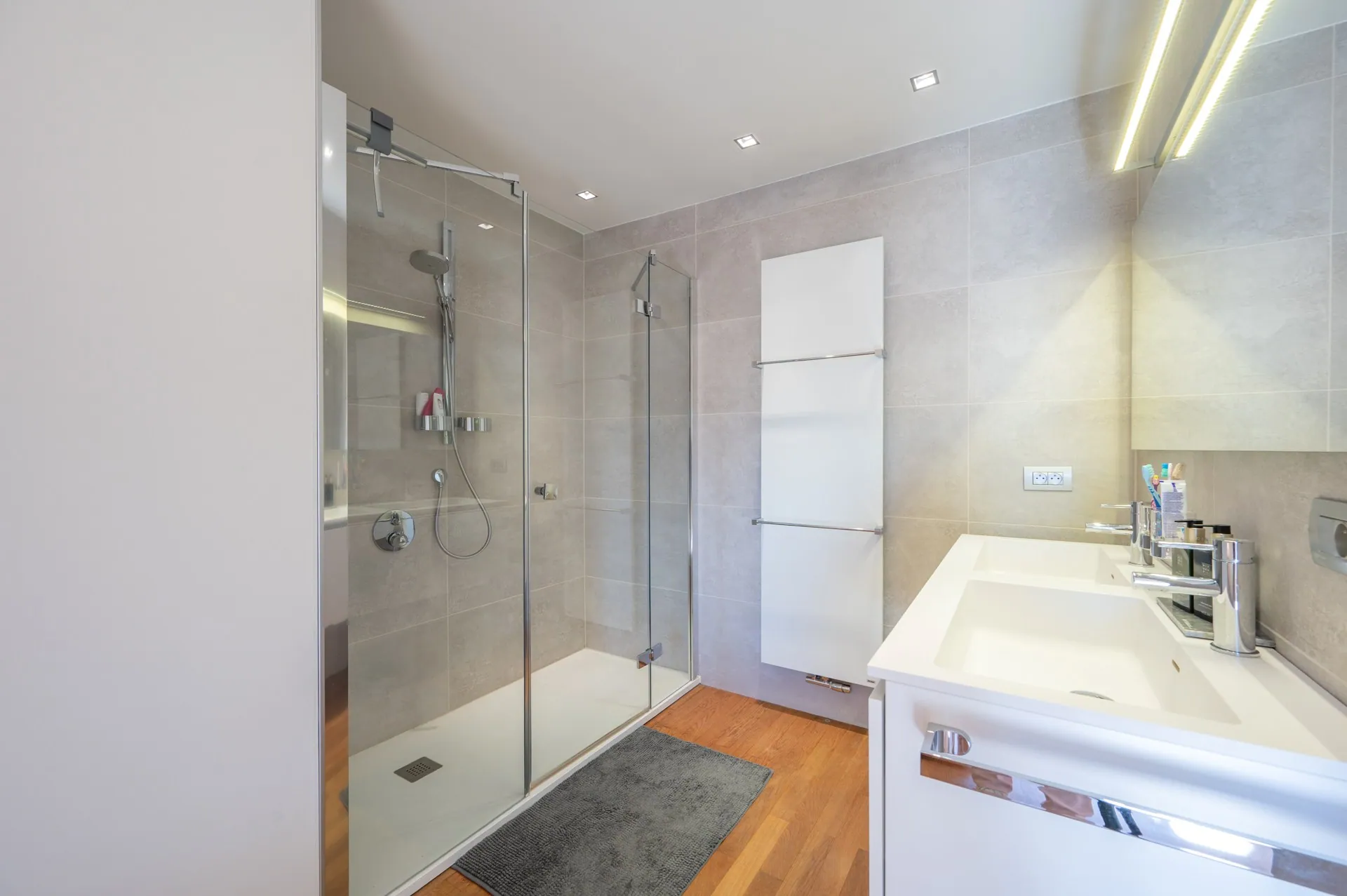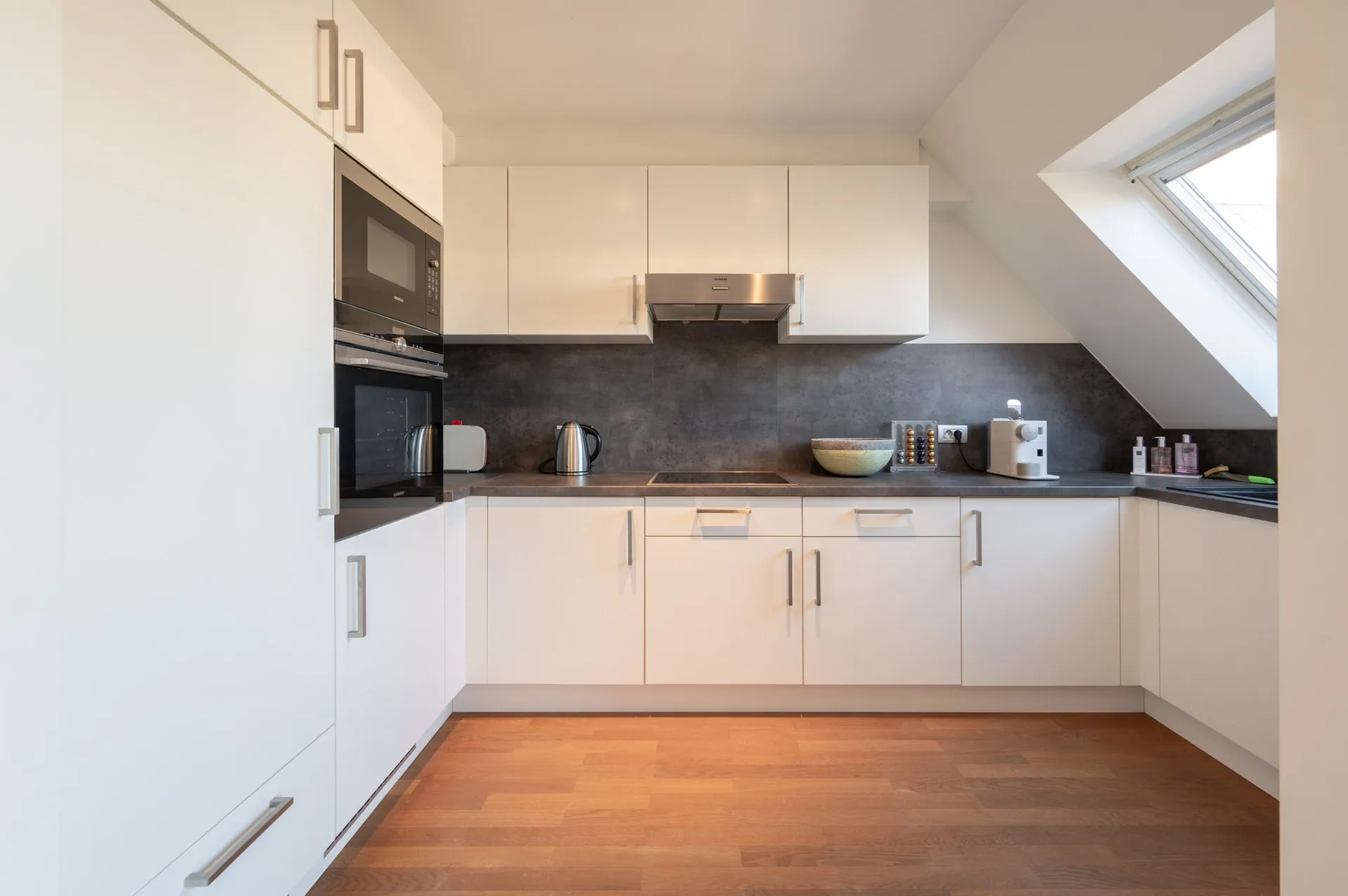 Daarnaast is er de mogelijkheid tot aankoop van een dubbele gelijkvloerse parkeerplaats in de residentie. Het appartement beschikt tevens over een privatieve kelderberging en een gemeenschappelijke fietsenberging.