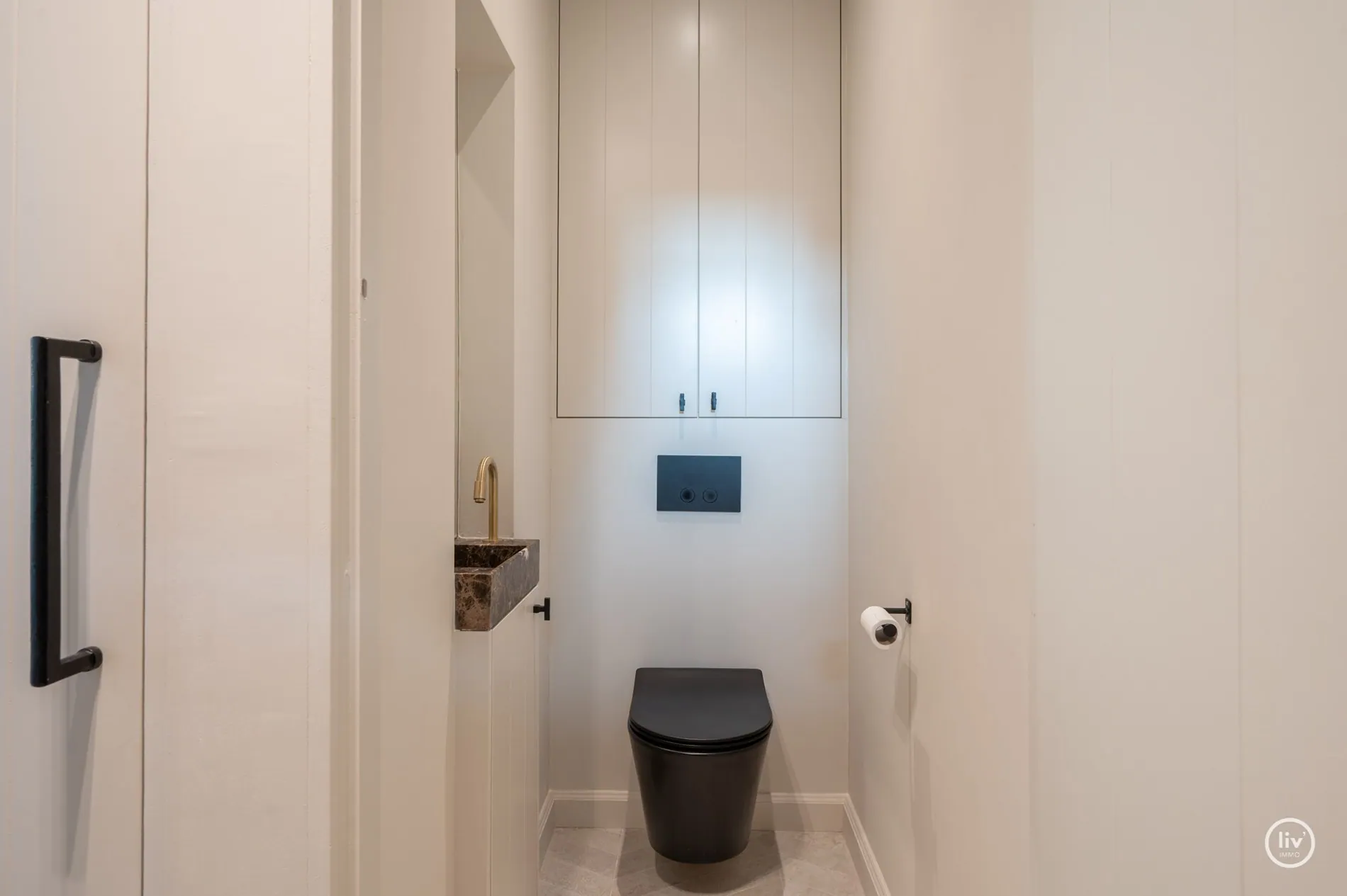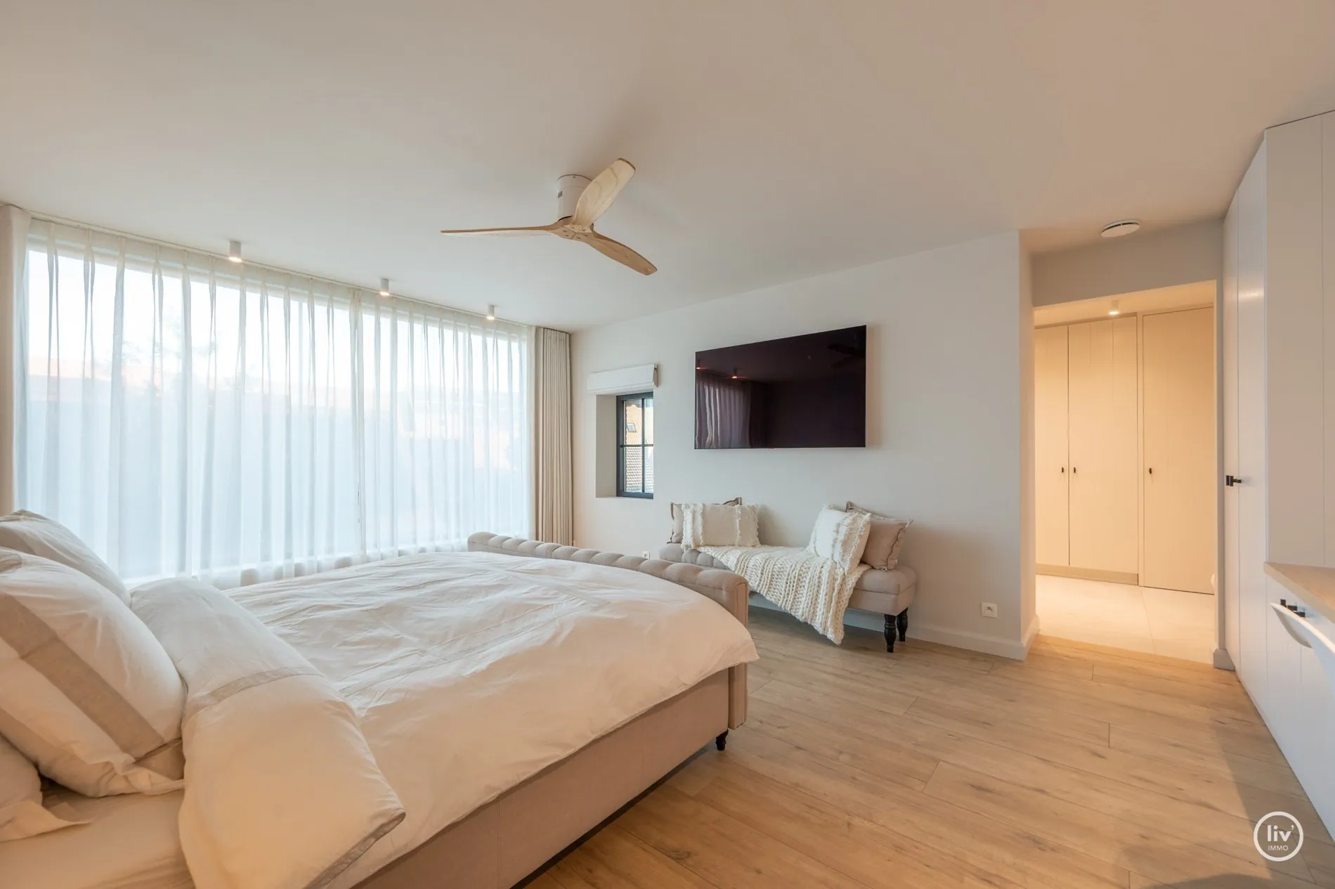 Eerste verdieping : Eerste slaapkamer, ruime wasruimte voorzien van dubbele machines. Kitchenette op de nachthal met frigo. Ruime Mastersuite met slaapkamer, dressing en badkamer met dubbele lavabo, inloopdouche, ligbad en sauna.