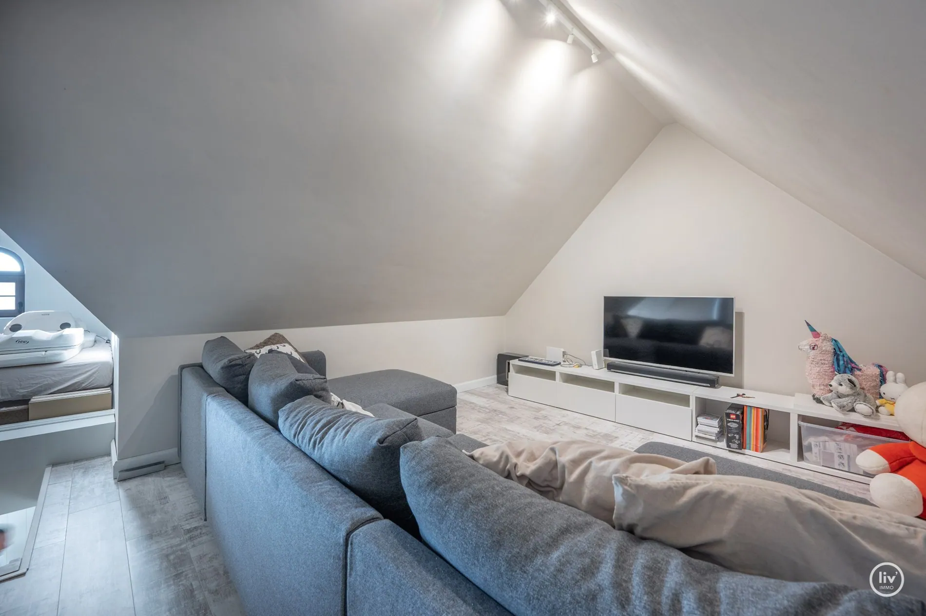 Tweede verdieping : 2 grote slaapkamers met eigen zithoek/TV hoek en dressing. Ruime badkamer met dubbele lavabo en inloopdouche en ligbad.
