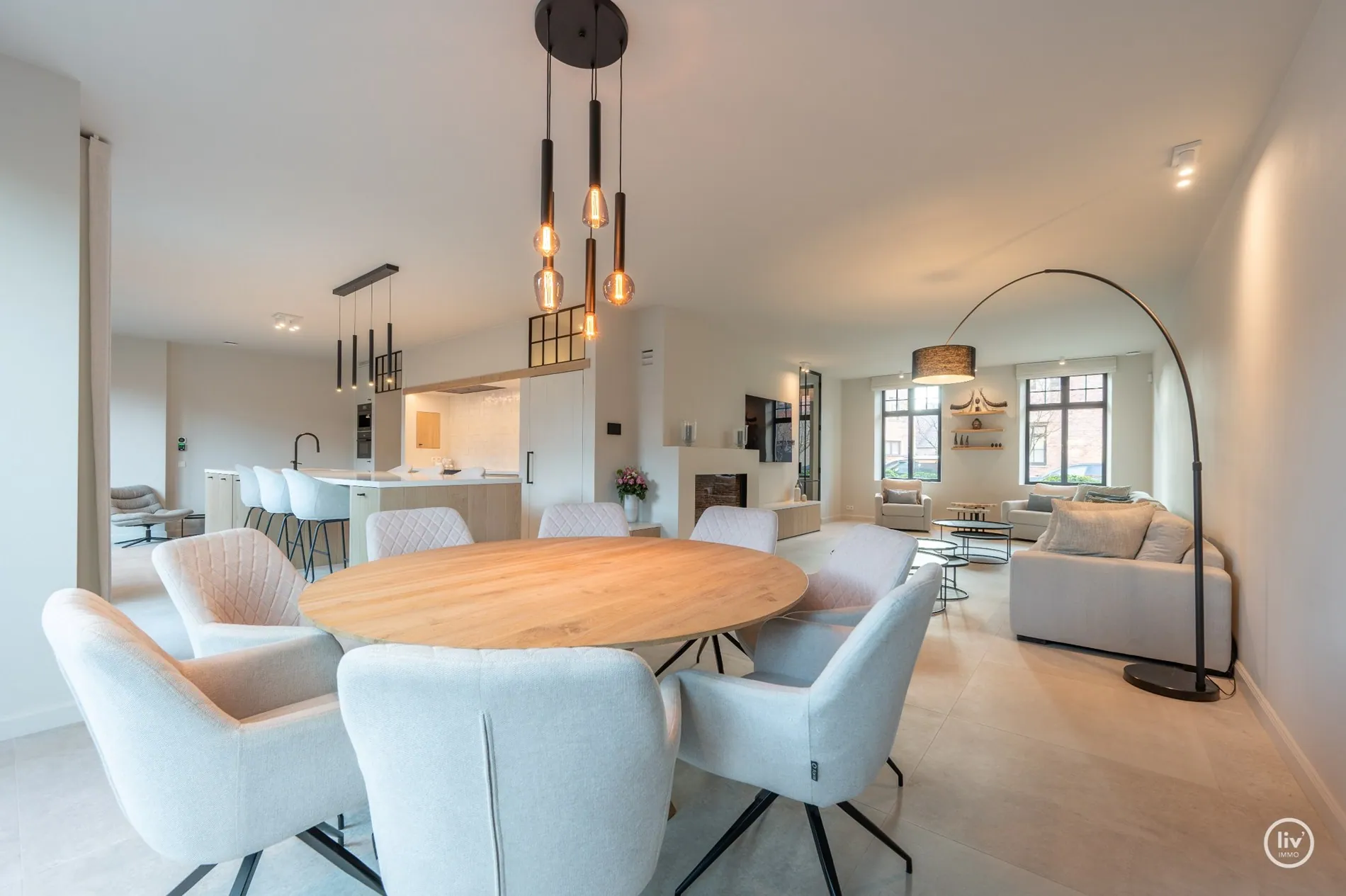 Indeling woning : Ruime inkomhal met vestiarie en gastentoilet. Aparte bureauruimte die ook kan dienen als slaapkamer. Ruime Living met aansluiten de eethoek en een volledig uitgeruste keuken uitgevend op de prachtige tuin. Extra bijkeuken met ingemaakte kasten en extra frigo.