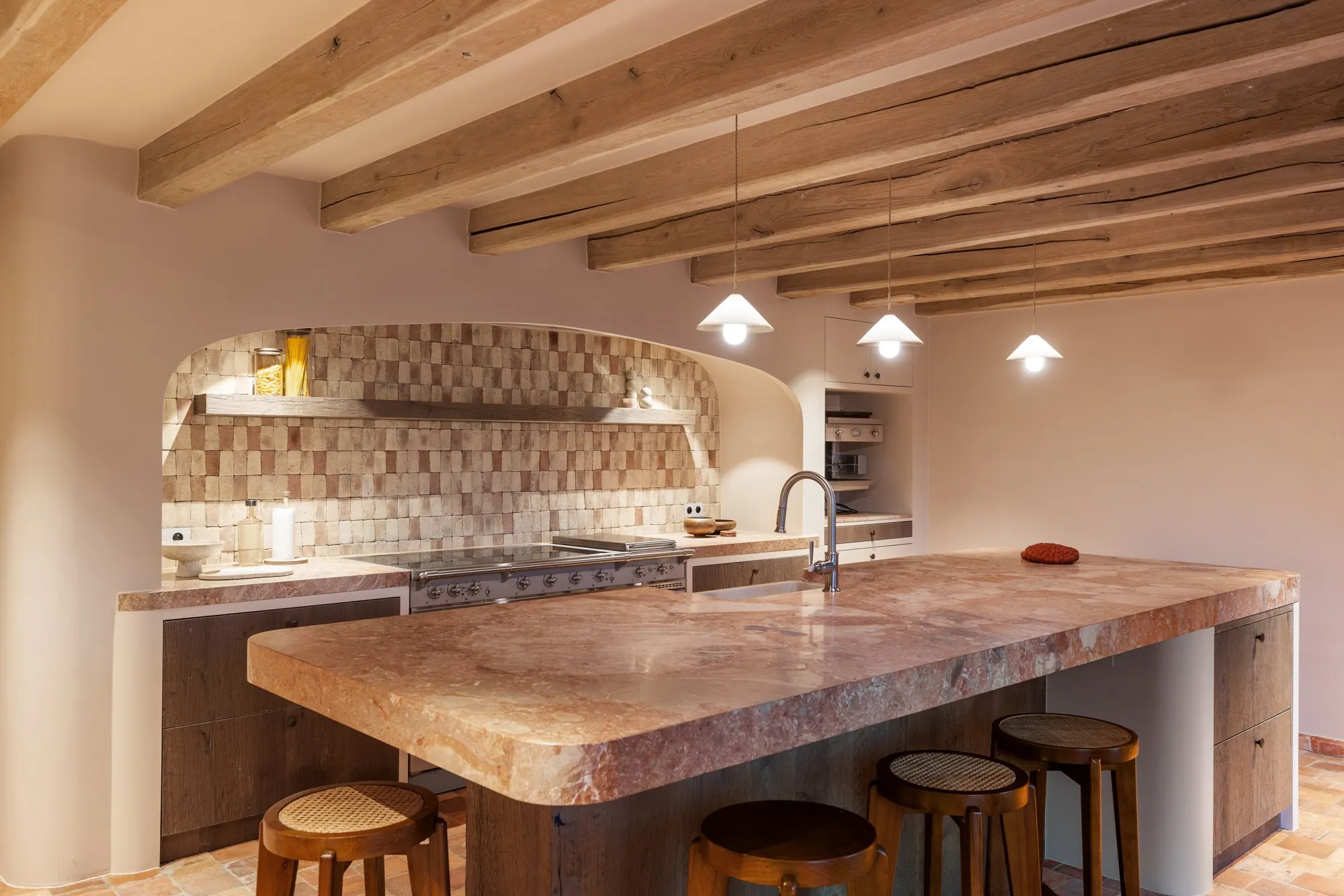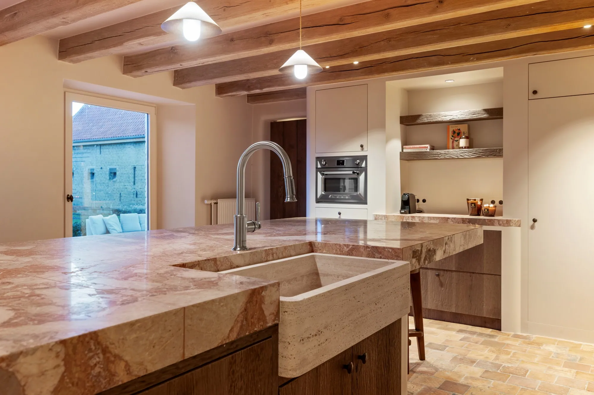 De volledig ingerichte keuken vormt het hart van de woning: een gezellige eetplek, een authentieke rotissoire voor kip, een lacanche-vuur en alle nodige toestellen, aangevuld met praktische bergruimte.