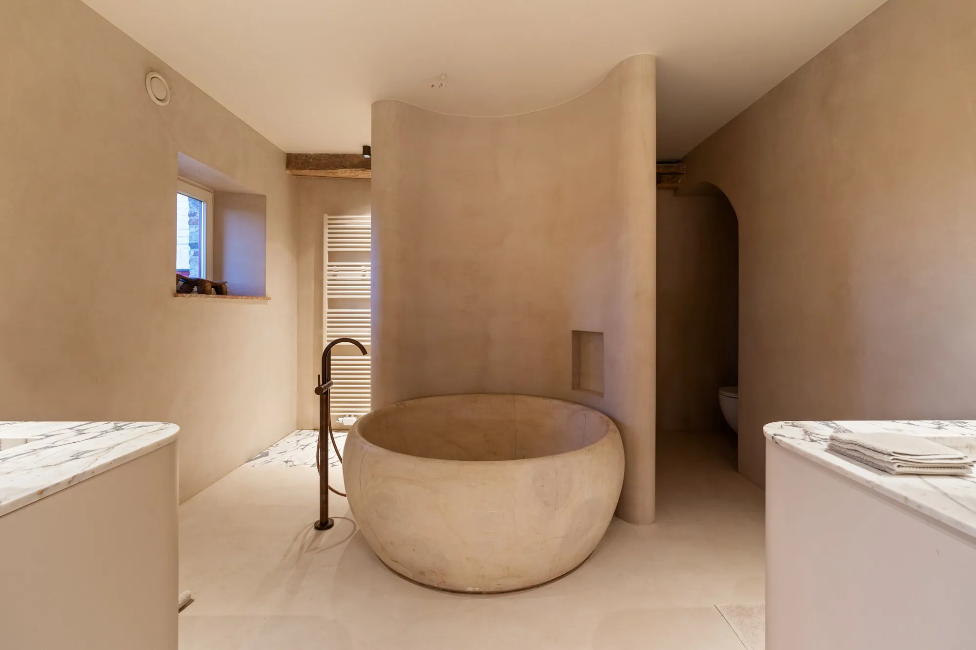Op het gelijkvloers bevindt zich een royale eerste slaapkamer met en-suite badkamer, uitgerust met ligbad, douche, toilet en dubbele lavabo.