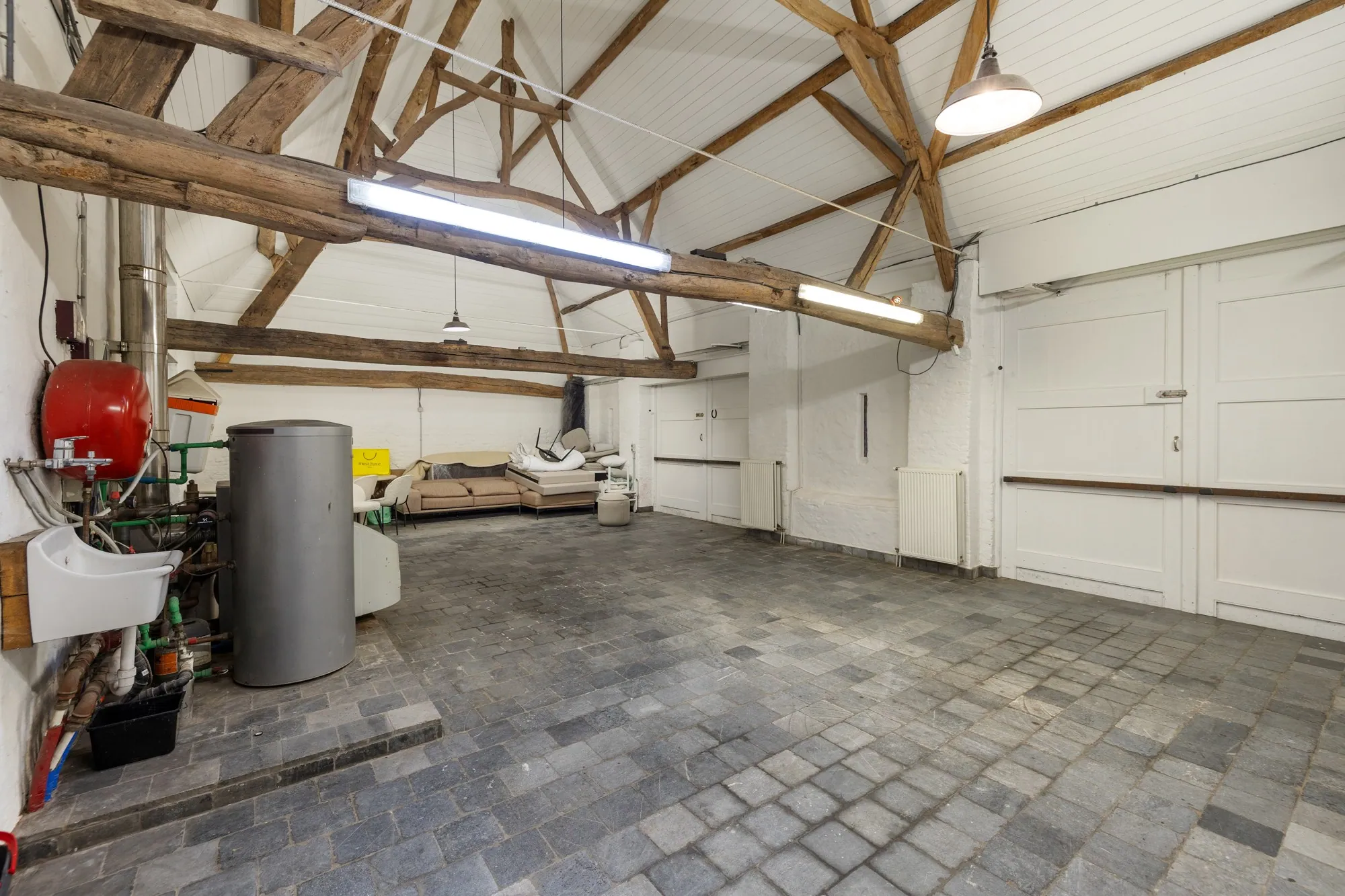 Op het gelijkvloers bevindt zich een prachtige, ruime garage met indrukwekkende balkenstructuur. Aansluitend ligt een geïsoleerde schuur (net nieuw dak)—uitermate geschikt voor feestzaal,...