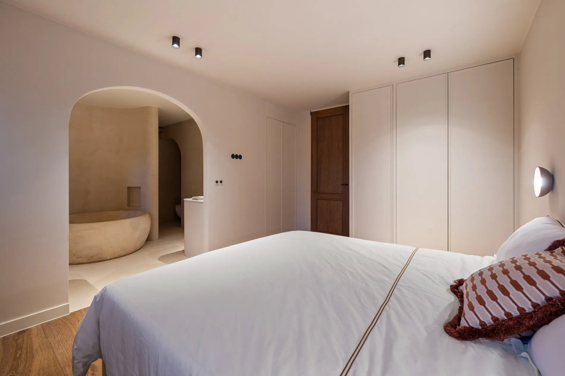 Op het gelijkvloers bevindt zich een royale eerste slaapkamer met en-suite badkamer, uitgerust met ligbad, douche, toilet en dubbele lavabo.