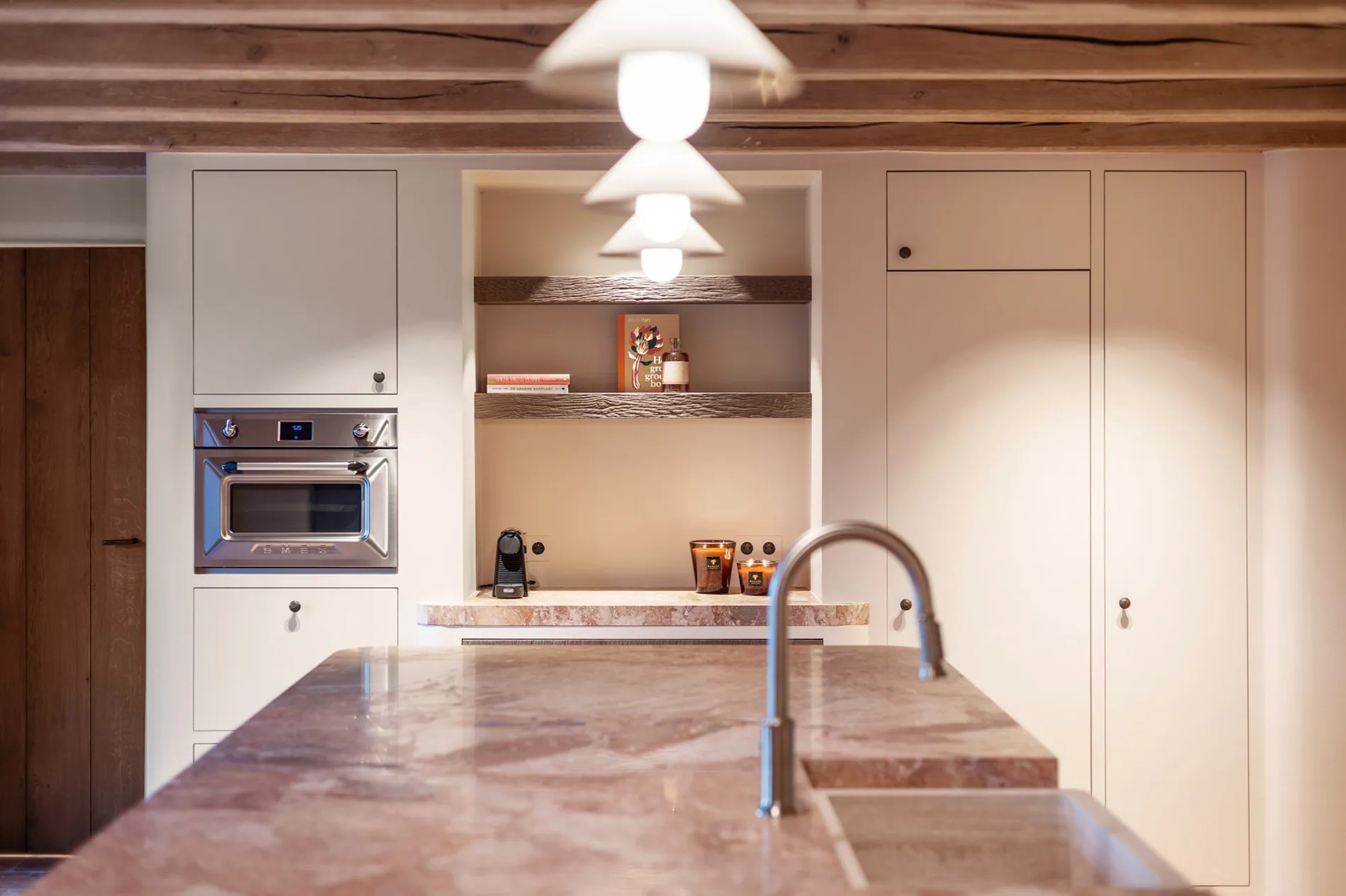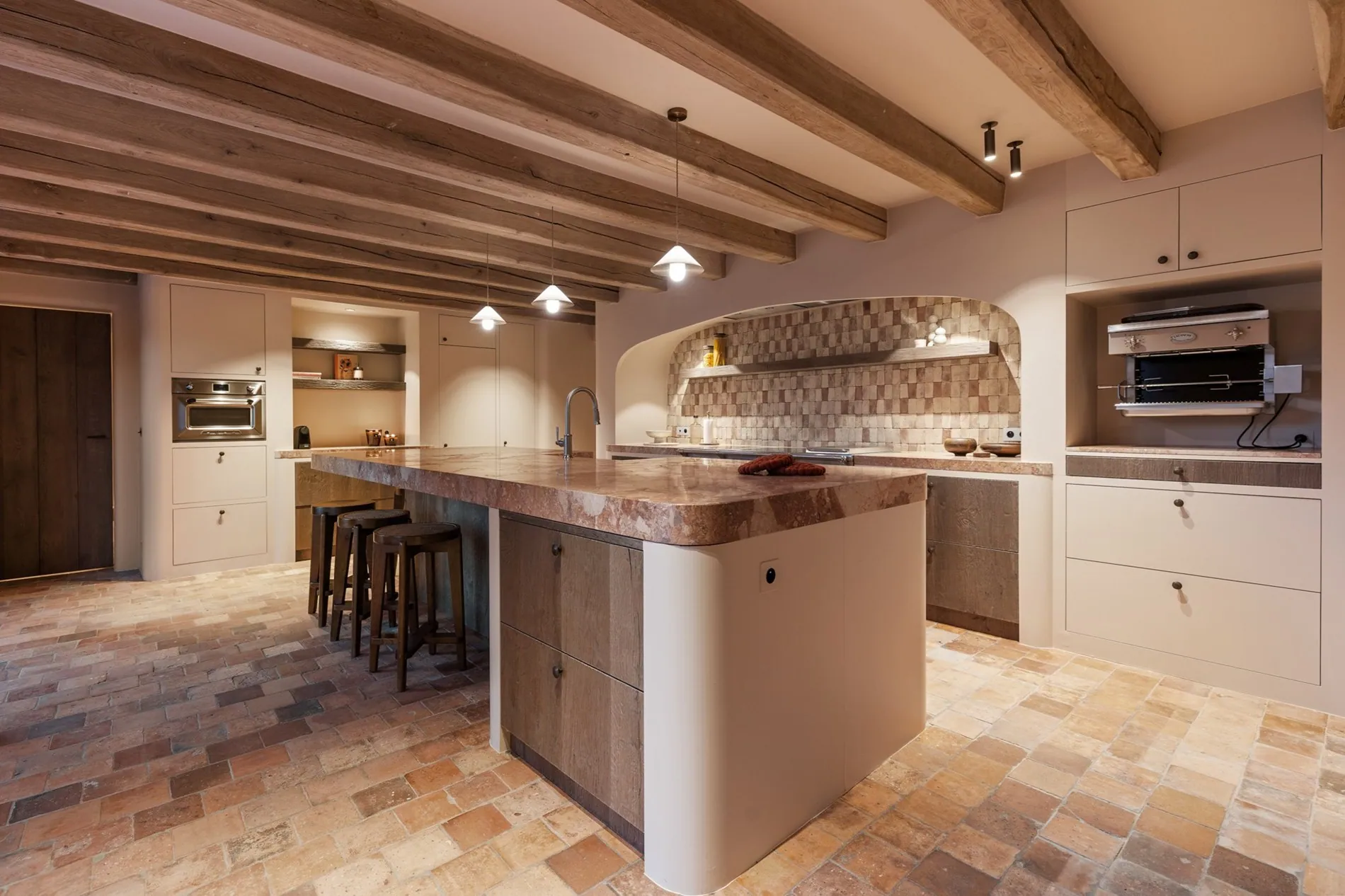 De volledig ingerichte keuken vormt het hart van de woning: een gezellige eetplek, een authentieke rotissoire voor kip, een lacanche-vuur en alle nodige toestellen, aangevuld met praktische bergruimte.