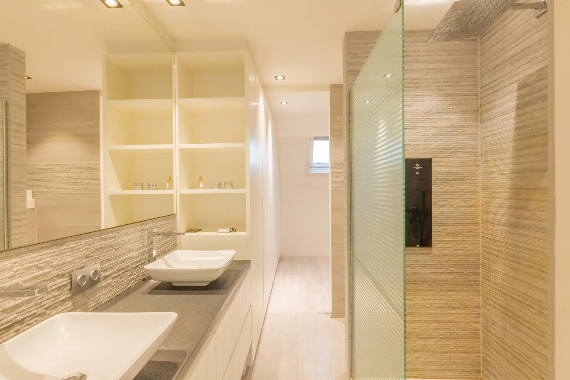 2de verdieping: Masterbedroom met volledig gerenoveerde douchekamer voorzien van infrarood + dressingruimte (op vandaag één open ruimte maar perfect opdeelbaar).