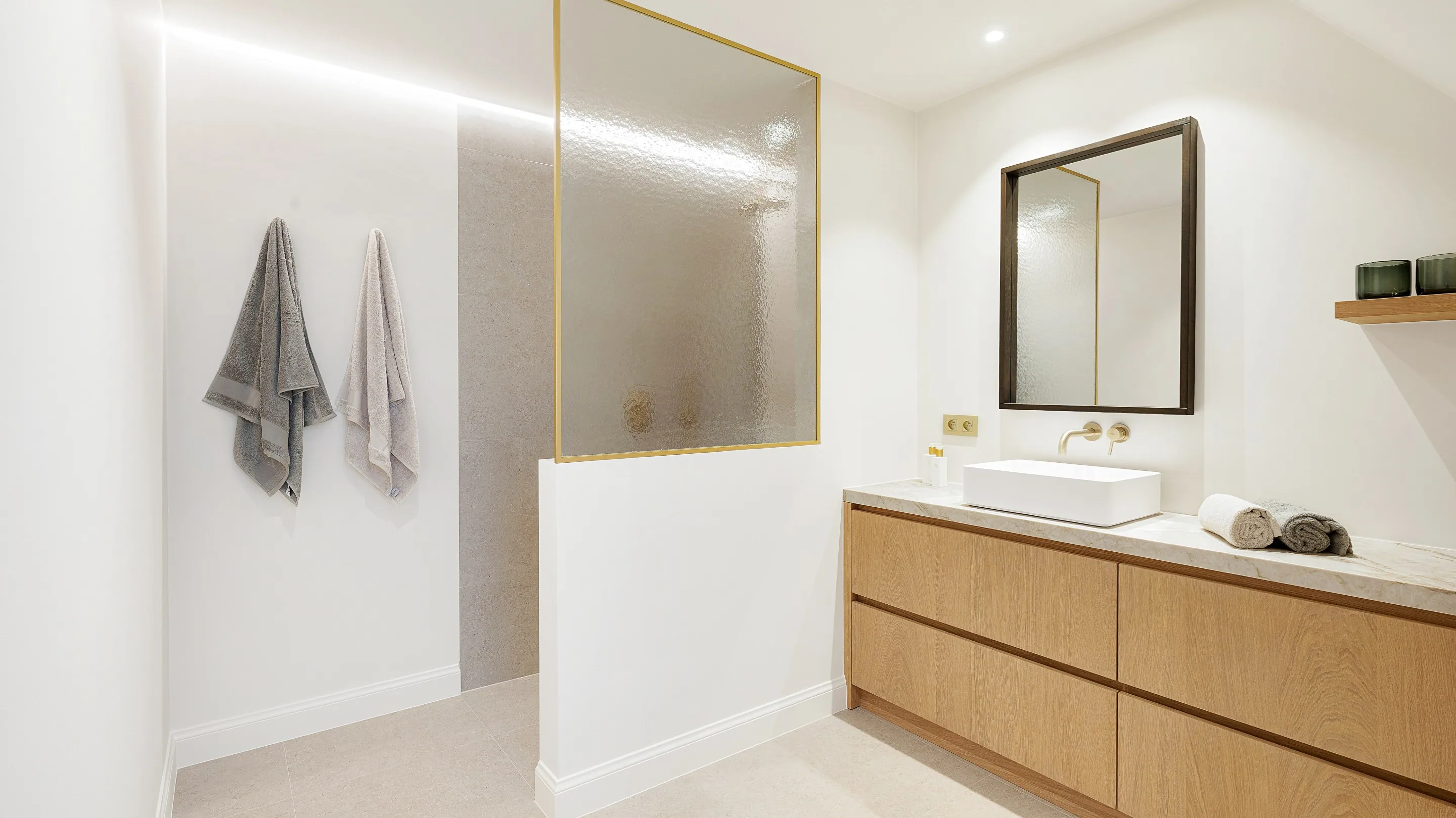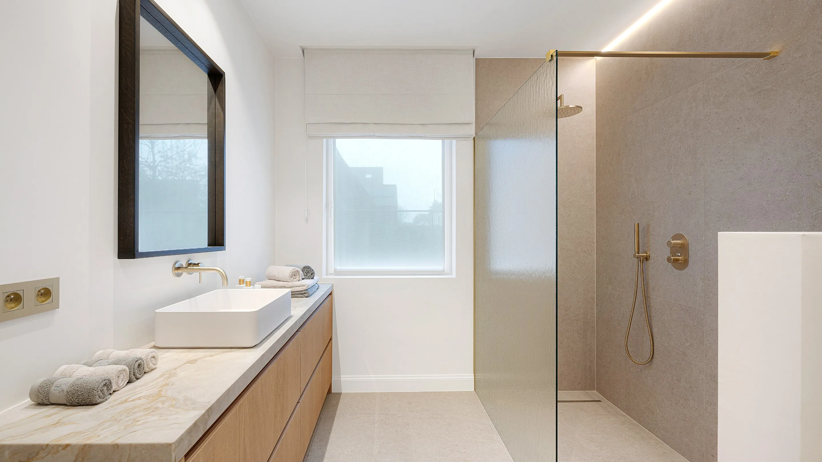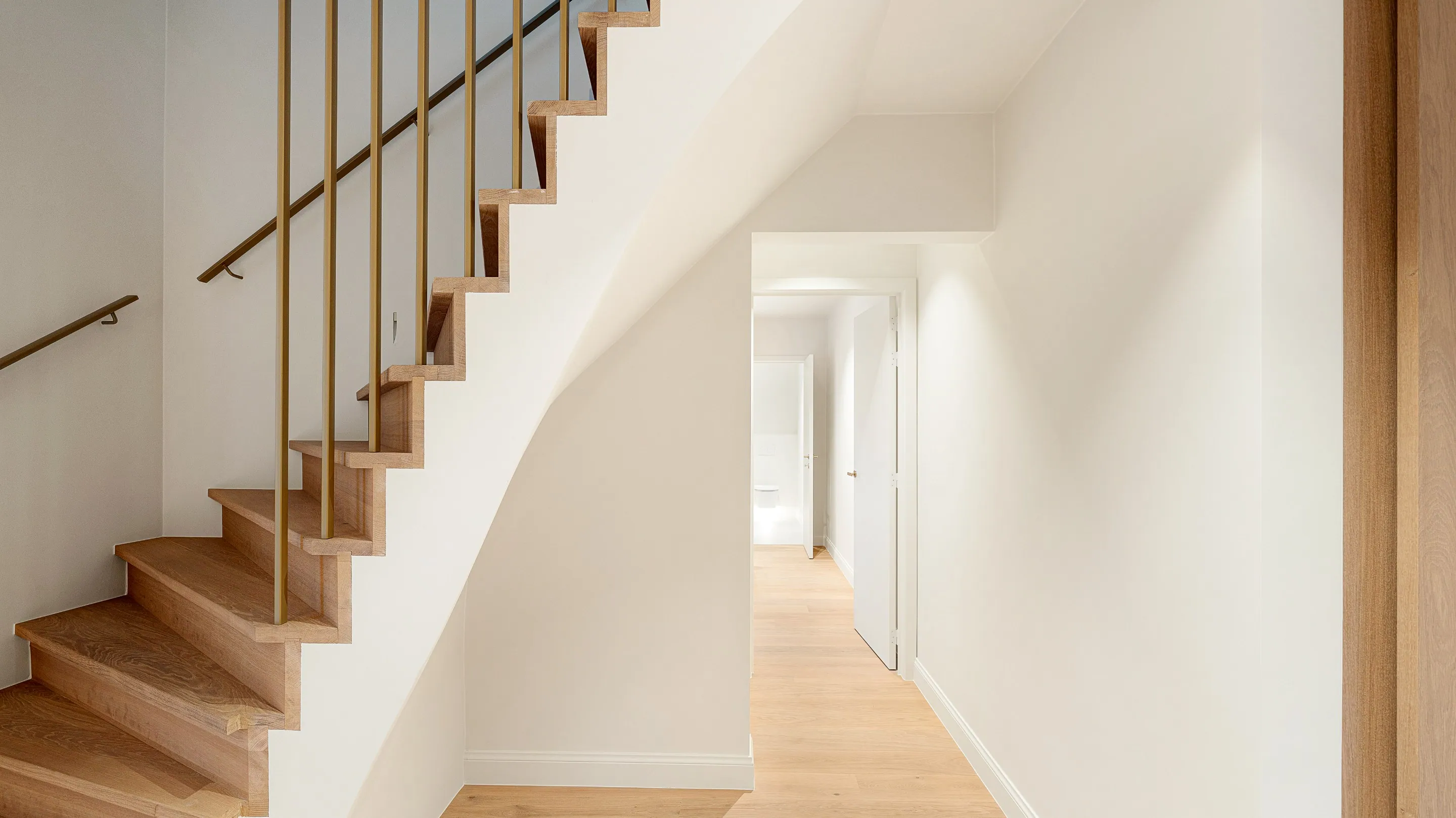 De royale inkomhal met gastentoilet en ingebouwde vestiairekasten geeft toegang tot de lichtrijke leefruimtes: een ruime zithoek met gashaard en tv-wand in fineer eik, een aparte eetruimte en een volledig uitgeruste keuken met Miele-toestellen en geïntegreerde wijnkoeler. Grote “minimal windows” zorgen voor een optimale lichtinval en zicht op de zuidwestgerichte tuin.