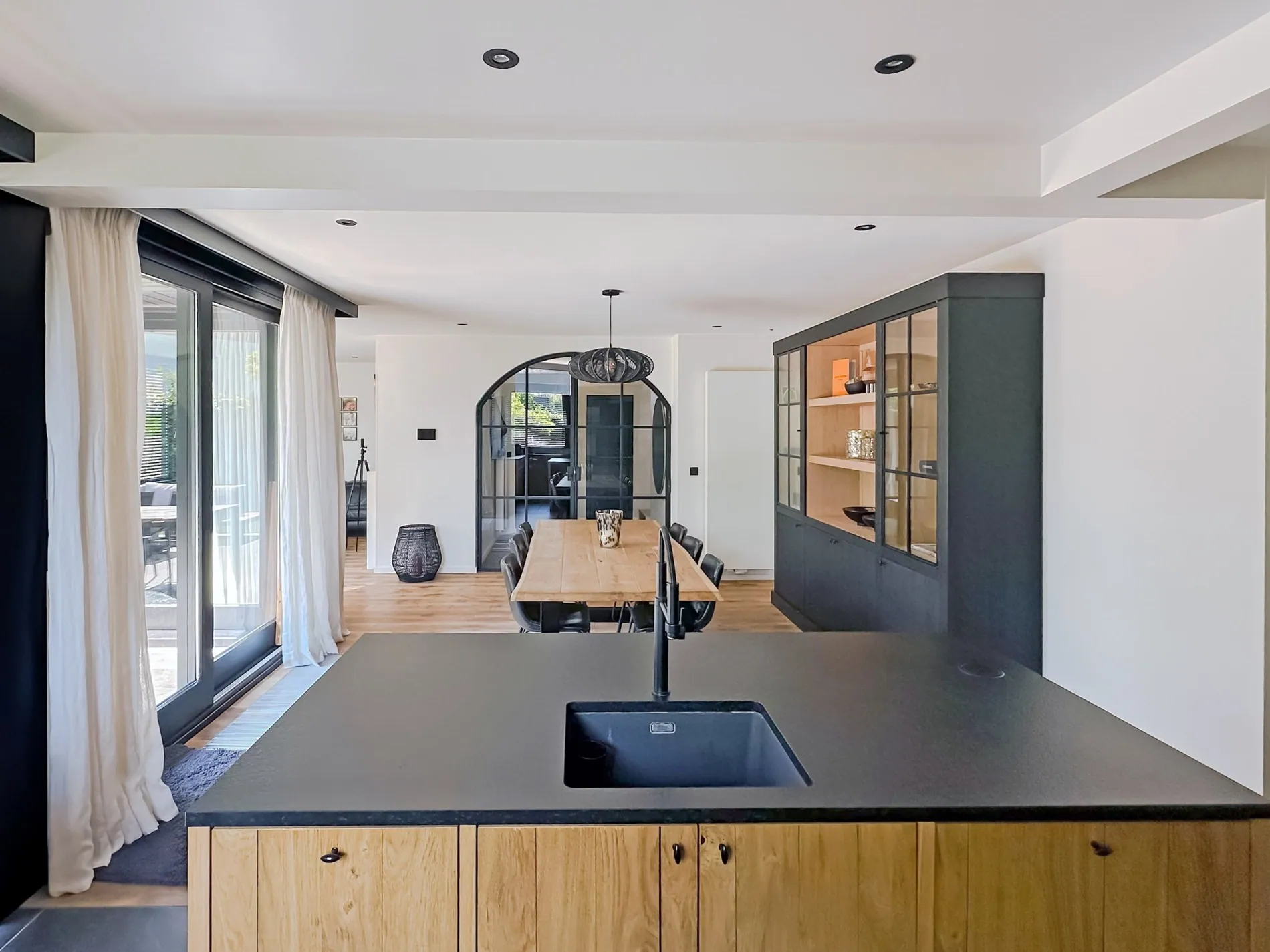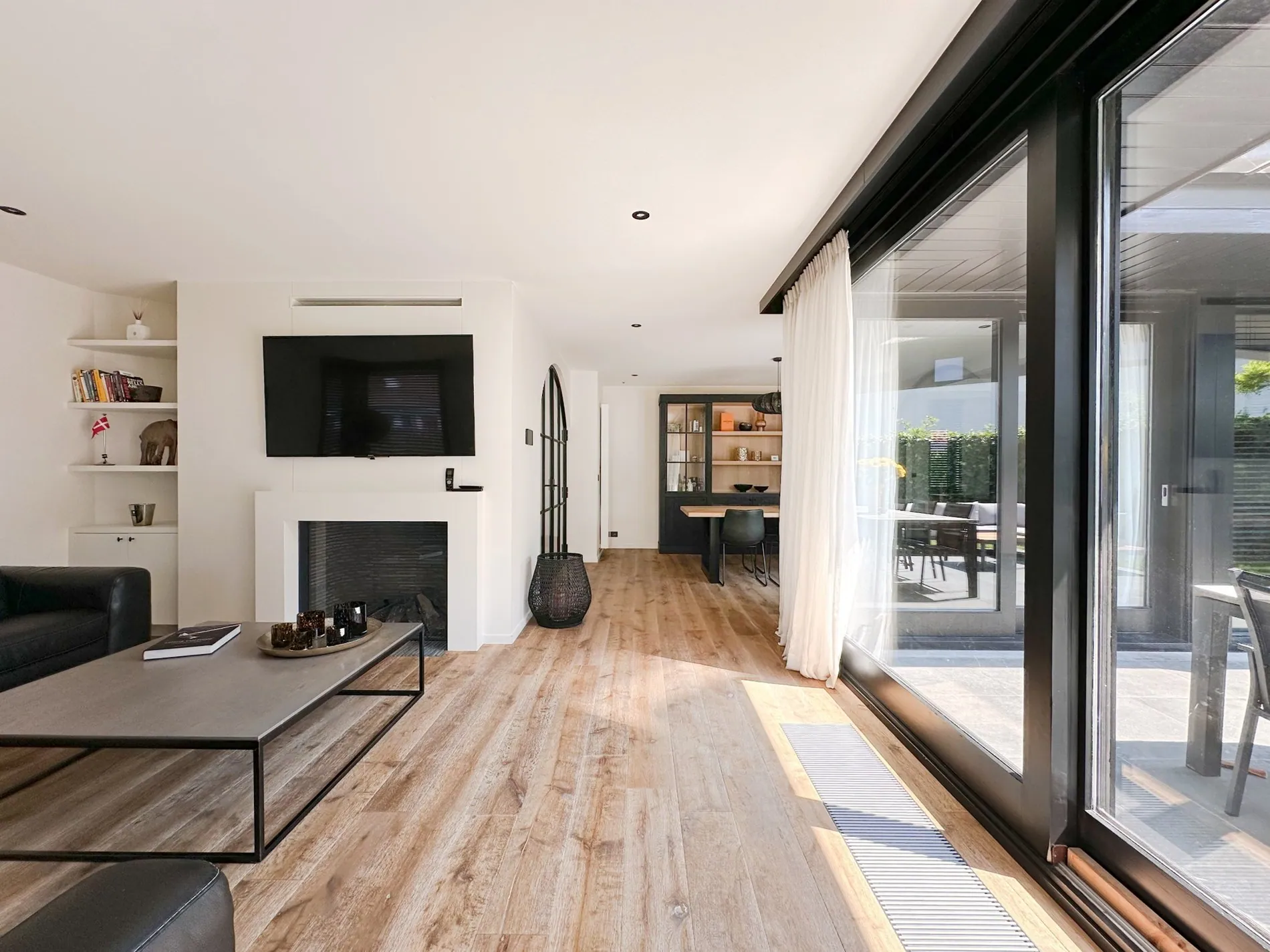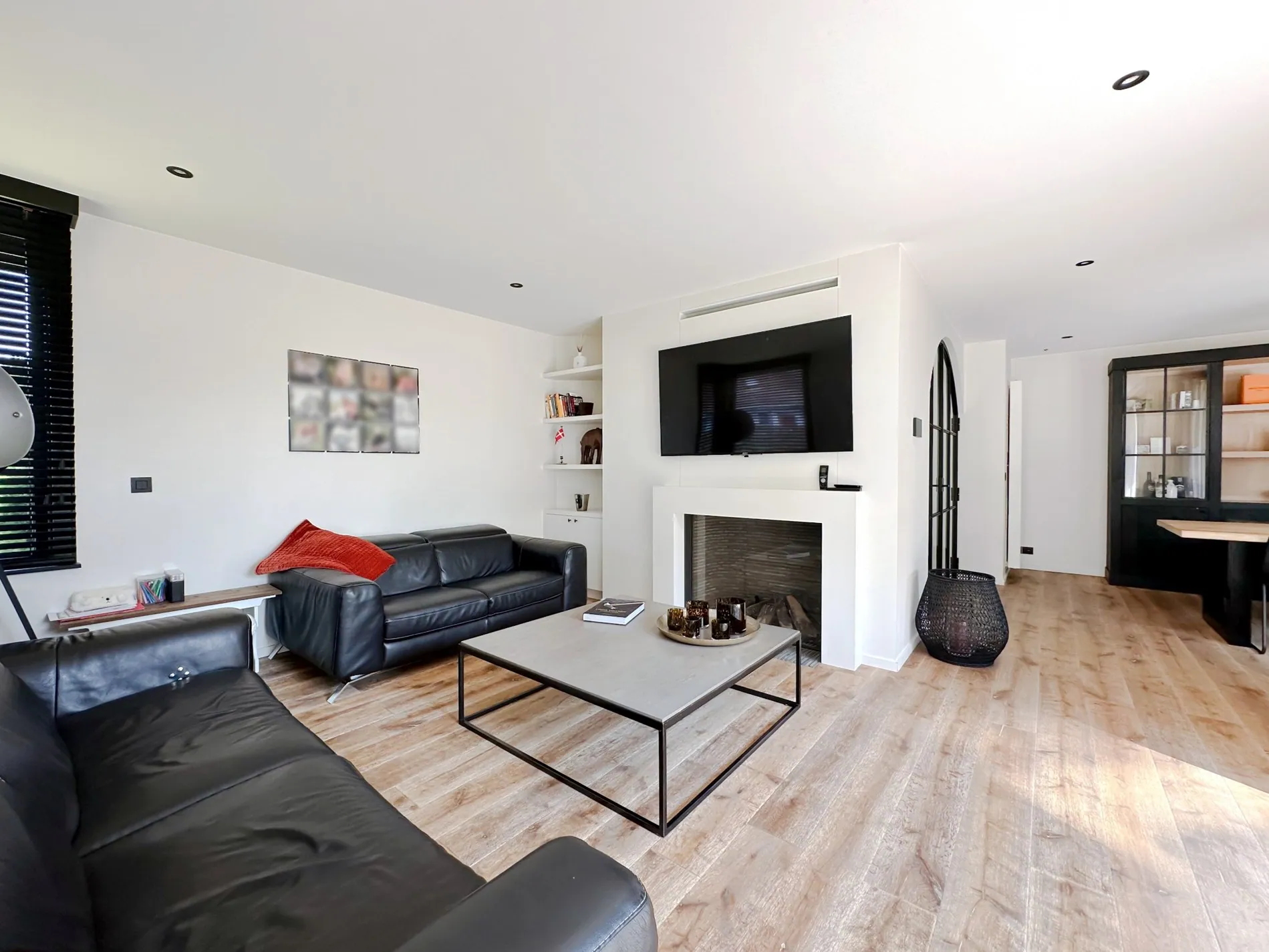 Indeling: inkomhal met gastentoilet en vestiaire, leefruimte met aparte eetplaats en zithoek met gezellige gashaard, open keuken voorzien van alle nodige toestellen, bijkeuken met wasplaats met ingemaakte kasten, ruime berging en grote garage.