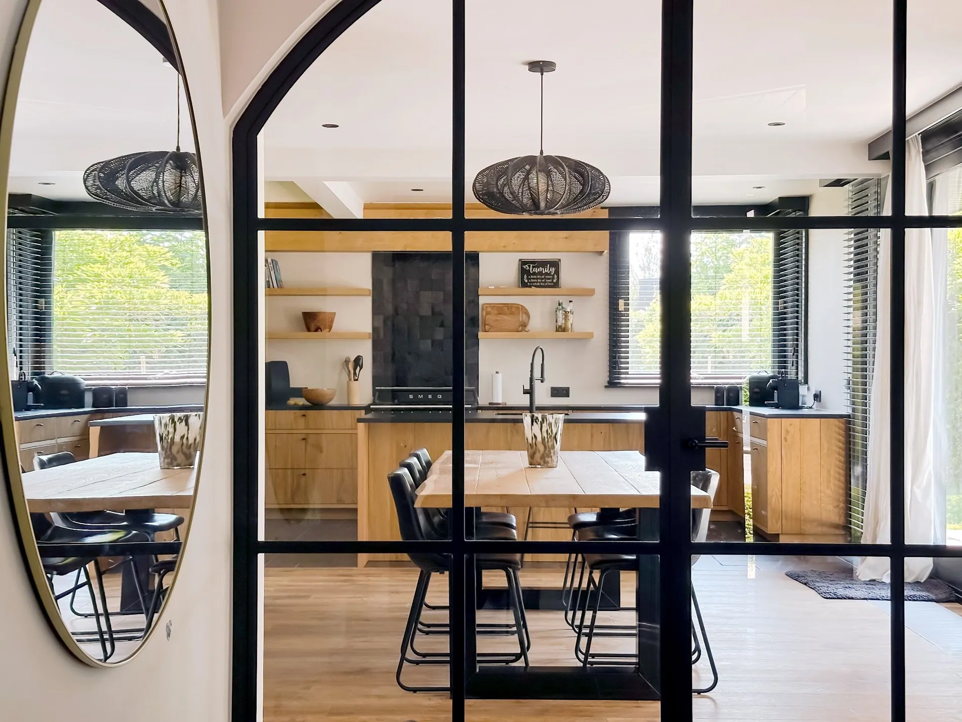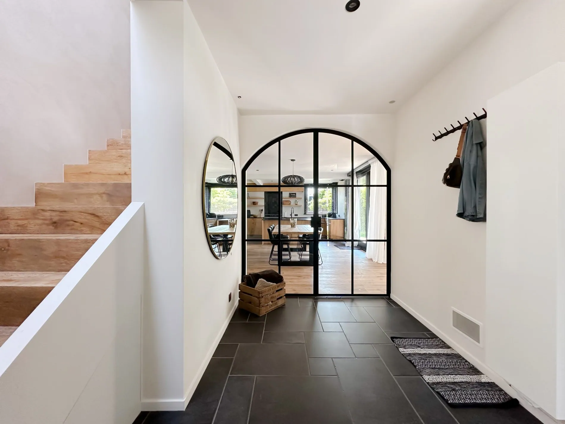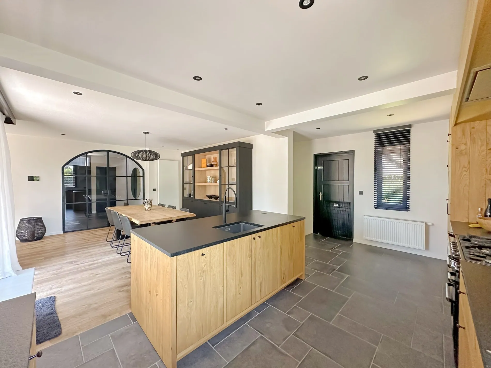 Indeling: inkomhal met gastentoilet en vestiaire, leefruimte met aparte eetplaats en zithoek met gezellige gashaard, open keuken voorzien van alle nodige toestellen, bijkeuken met wasplaats met ingemaakte kasten, ruime berging en grote garage.