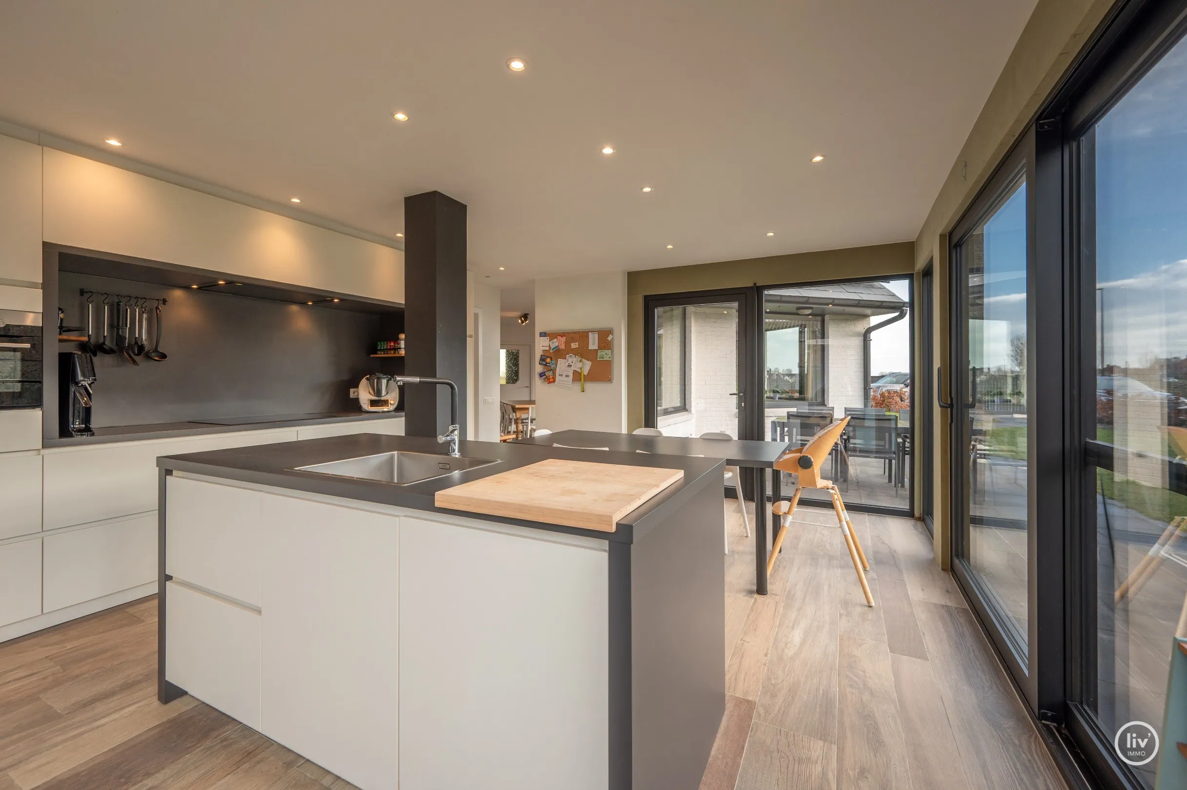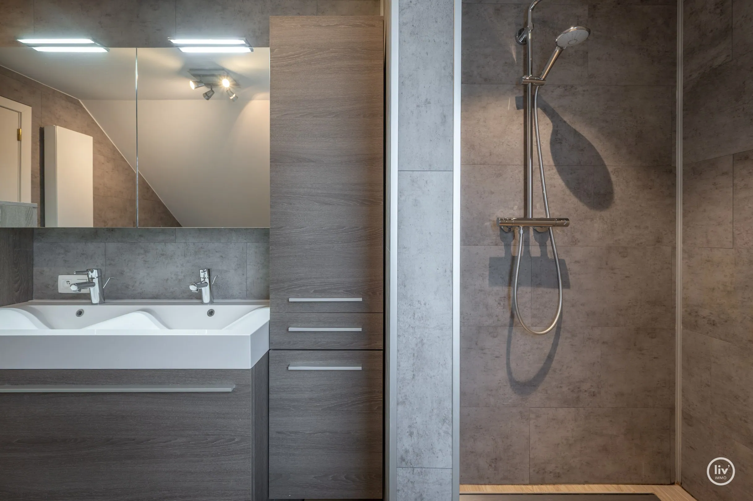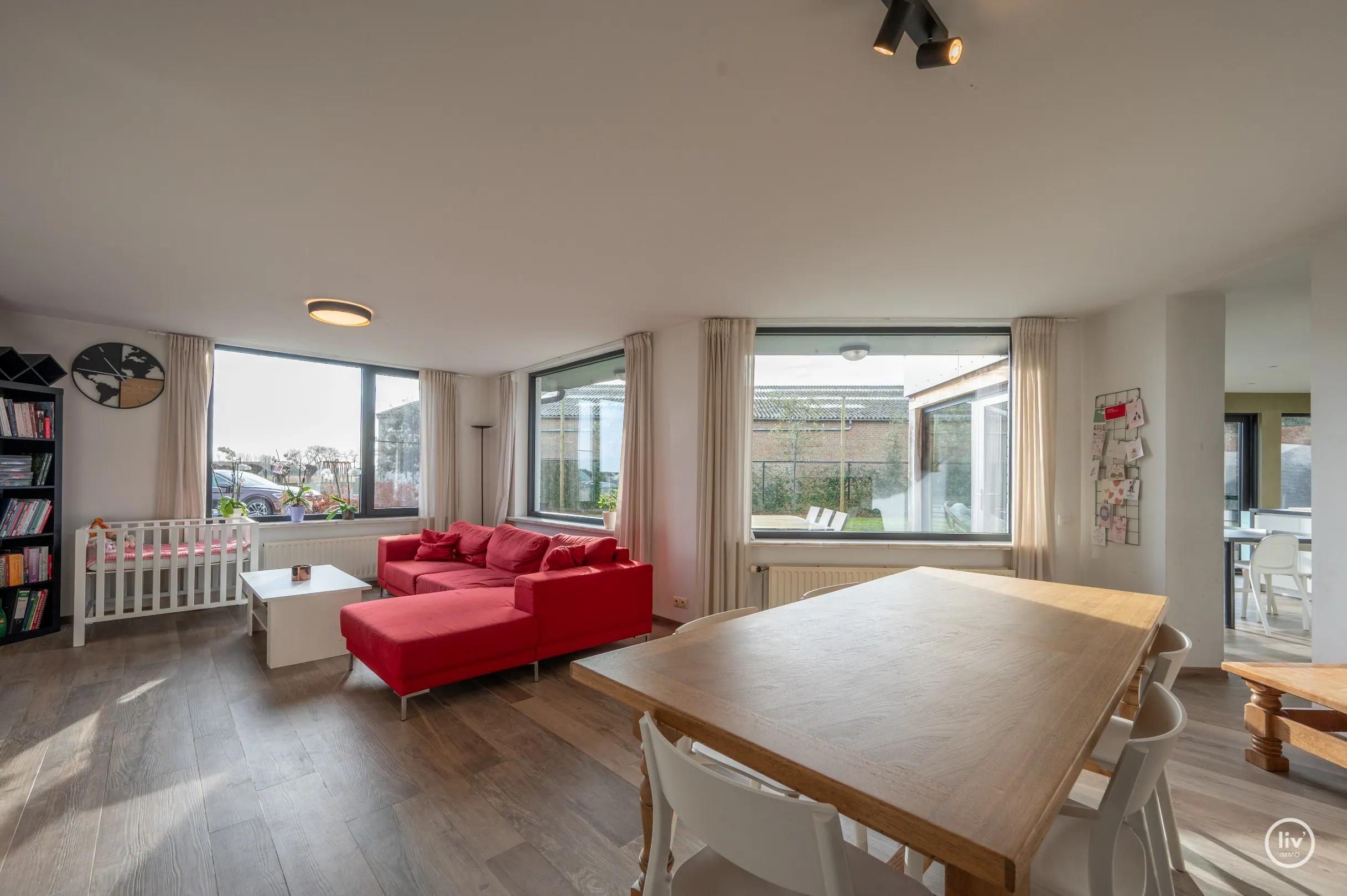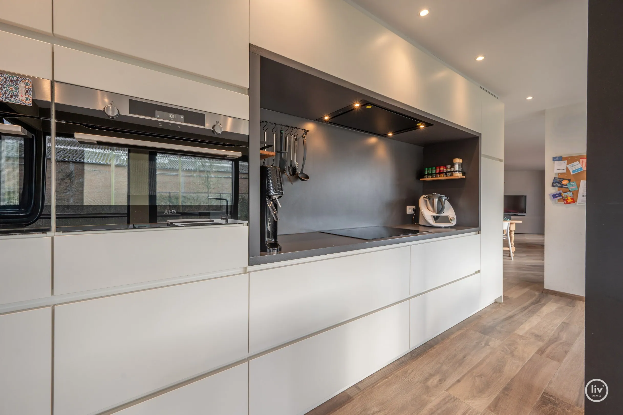 Indeling; inkomhal, gastentoilet, lichtrijke living met gashaard genietend van een open zicht op de tuin, volledige uitgeruste en vernieuwde open keuken, ruime bij-keuken met eveneens de sanitaire installatie.