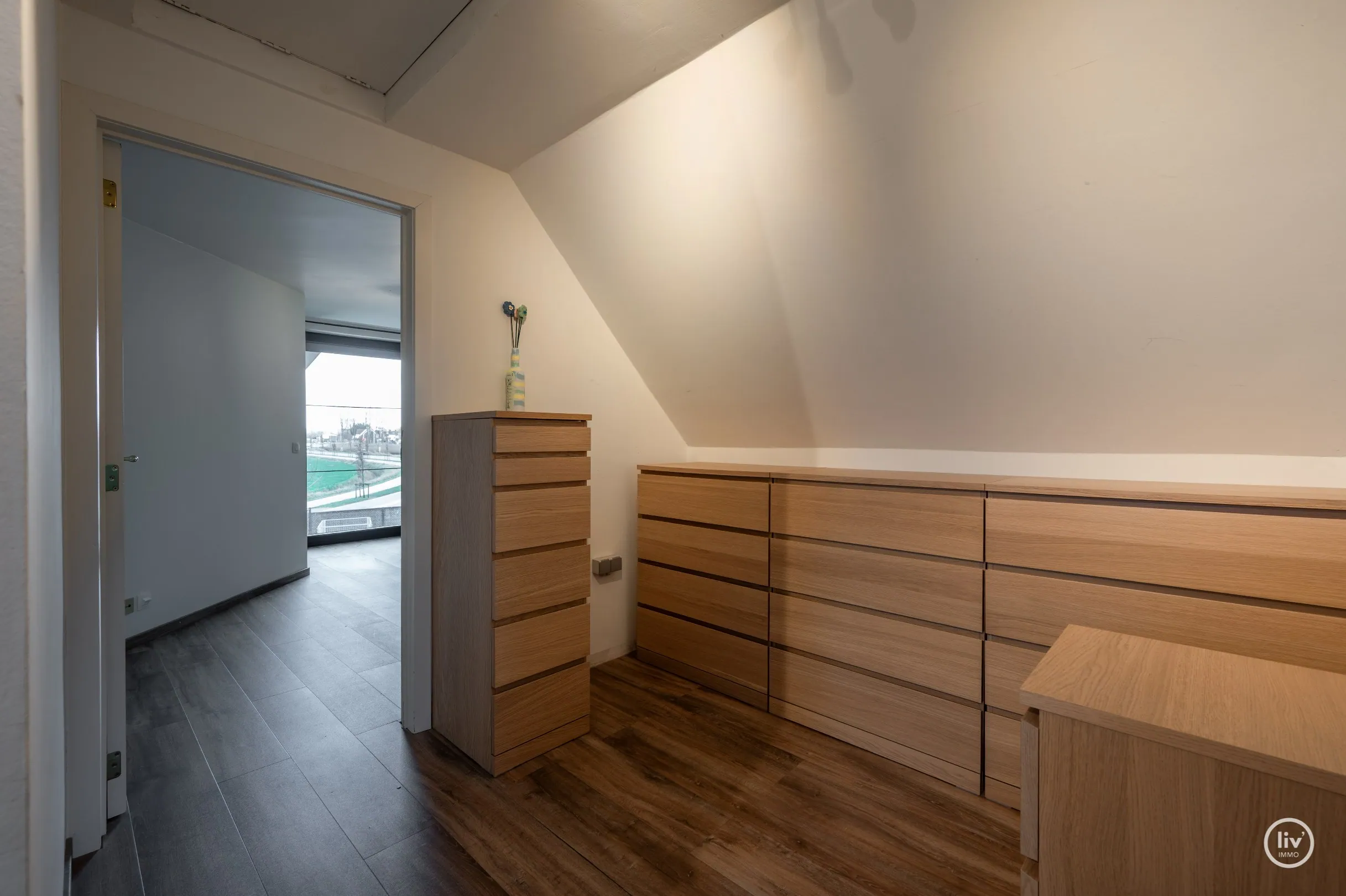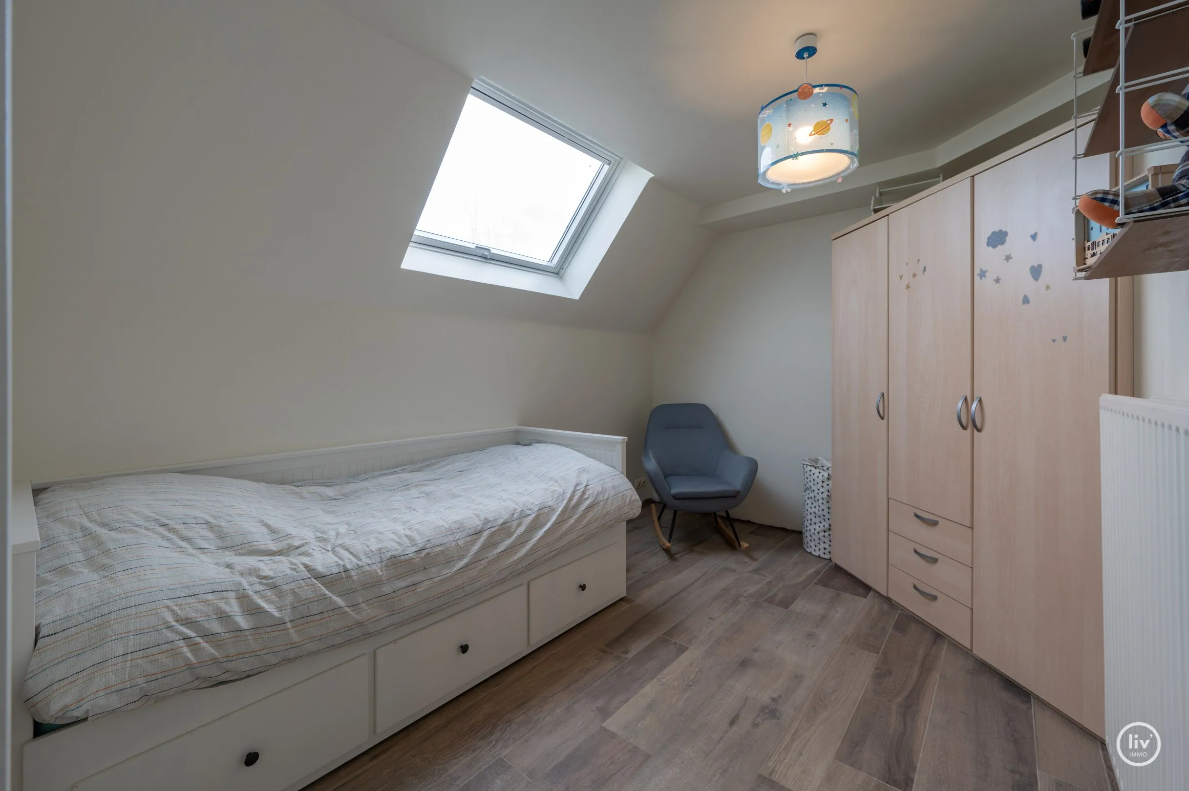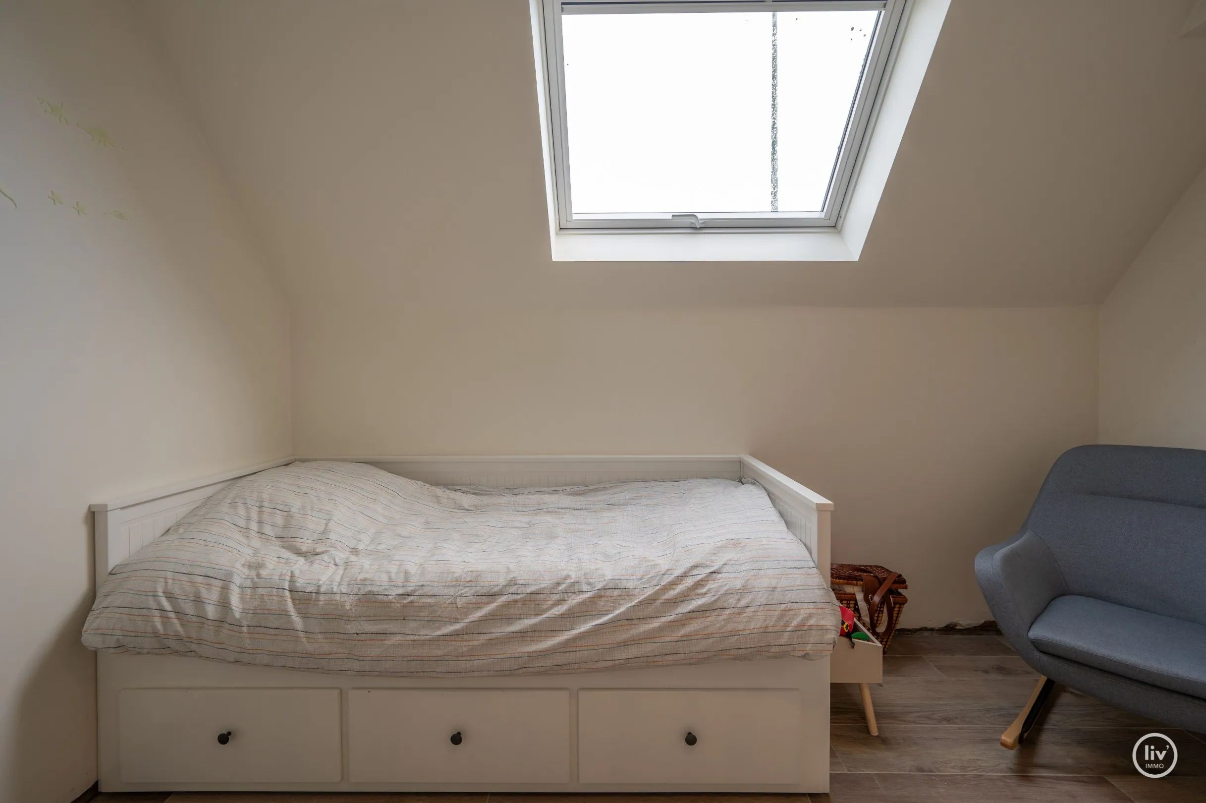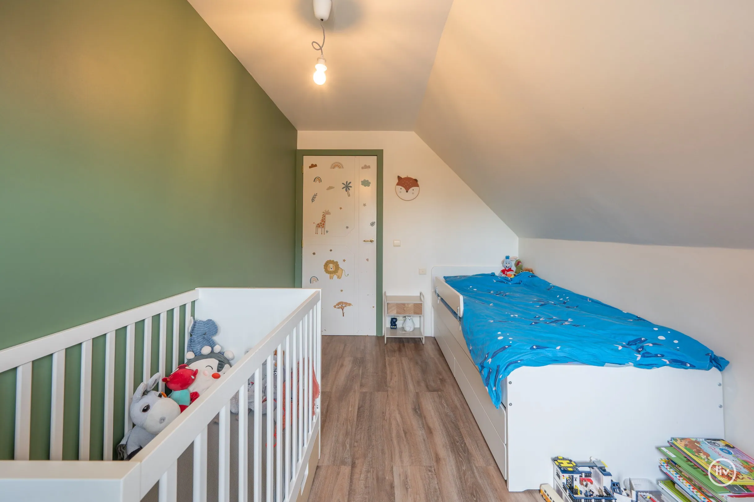 Slaapkamer 1 op gelijkvloers ideaal voor een optimale mobiliteit, op vandaag in gebruik als kinderkamer. De zongerichte tuin is voorzien van een ruim bijgebouw met eveneens een overdekt terras. De tuin en oprit zijn toegankelijk d.m.v een geautomatiseerde elektrische tuinpoort.