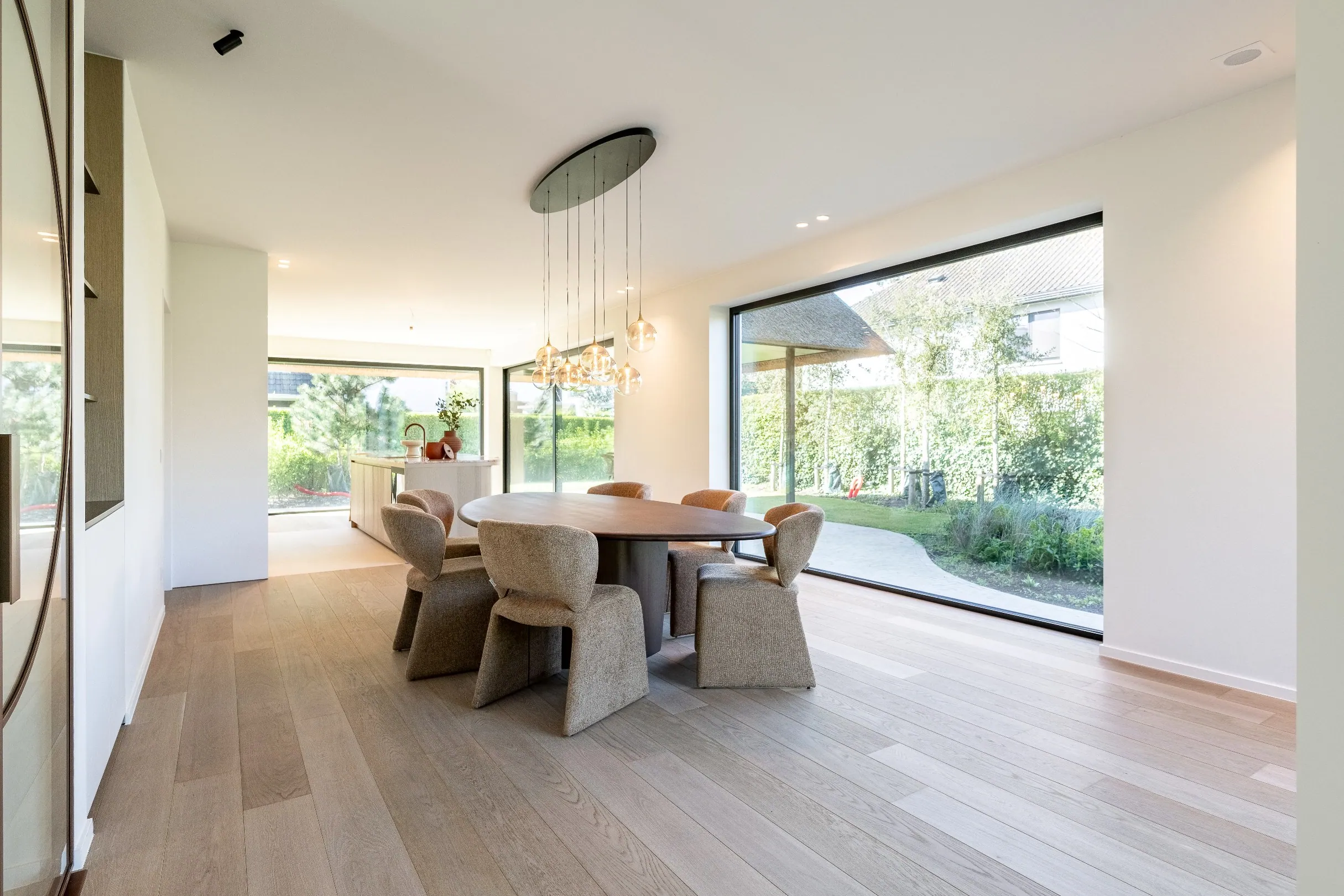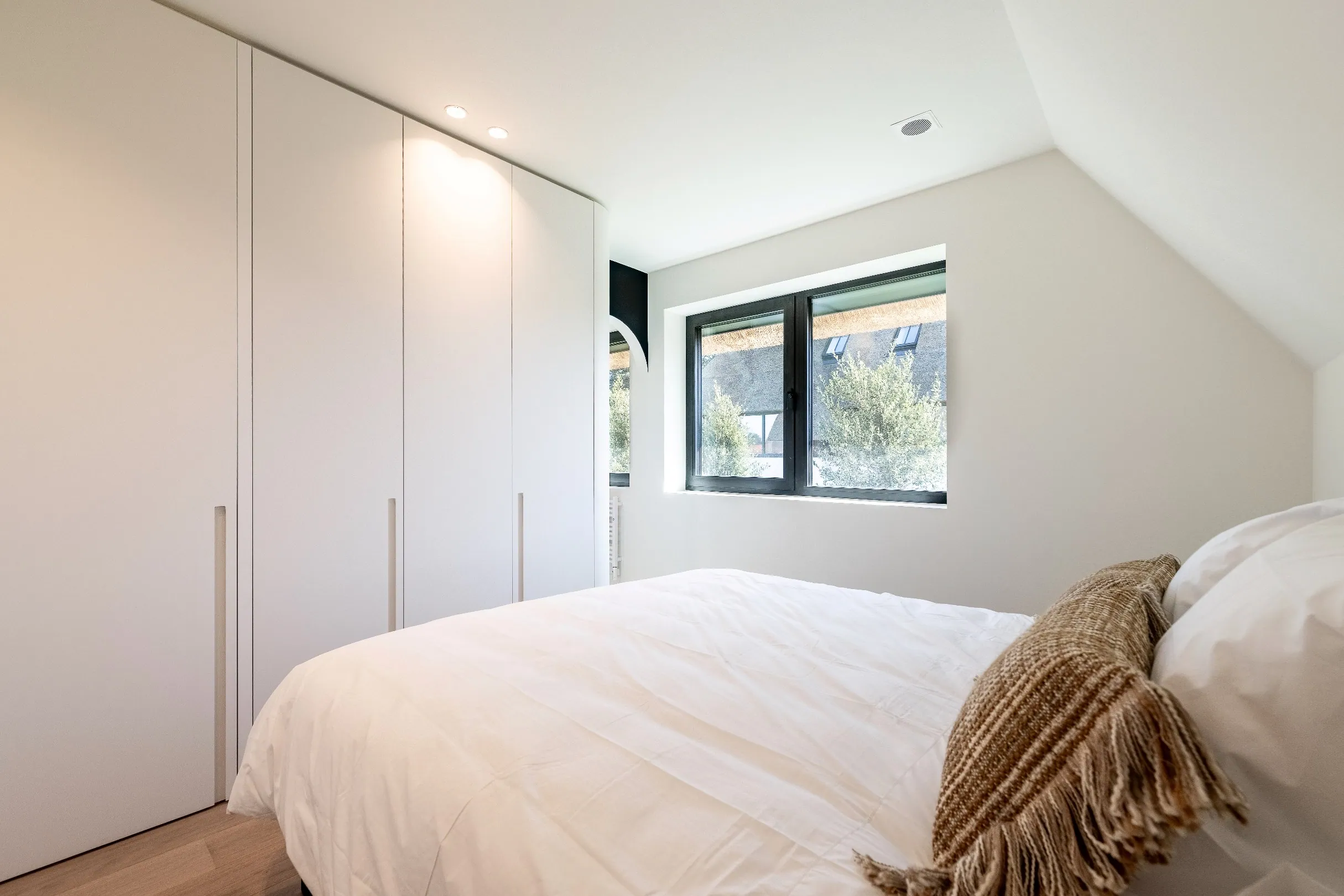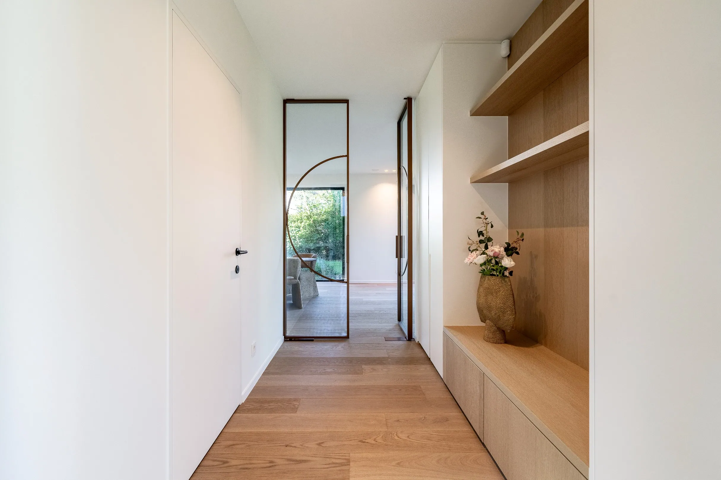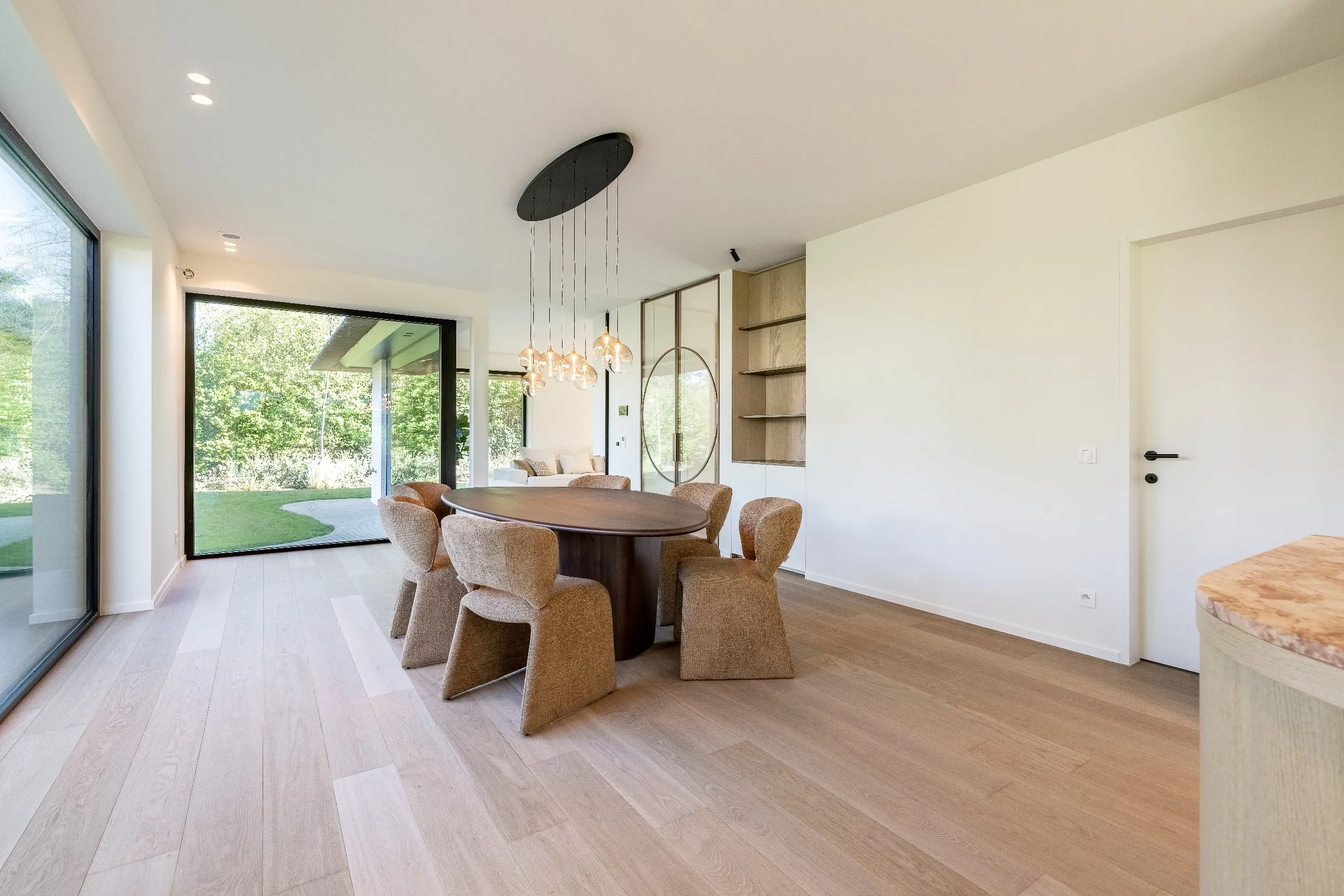 Afgewerkt met kwalitatieve en luxueuze materialen tot in detail. Garage voor 1 wagen en plaats voor enkele wagens voor de woning.