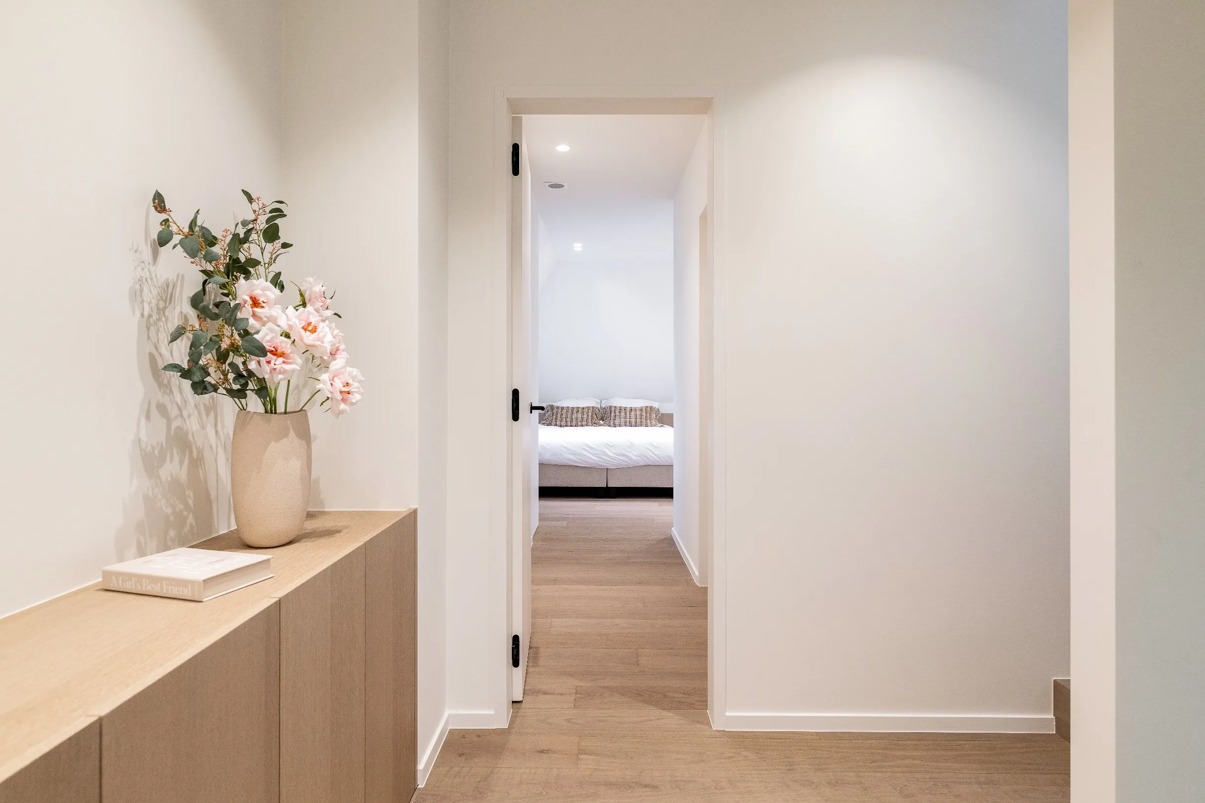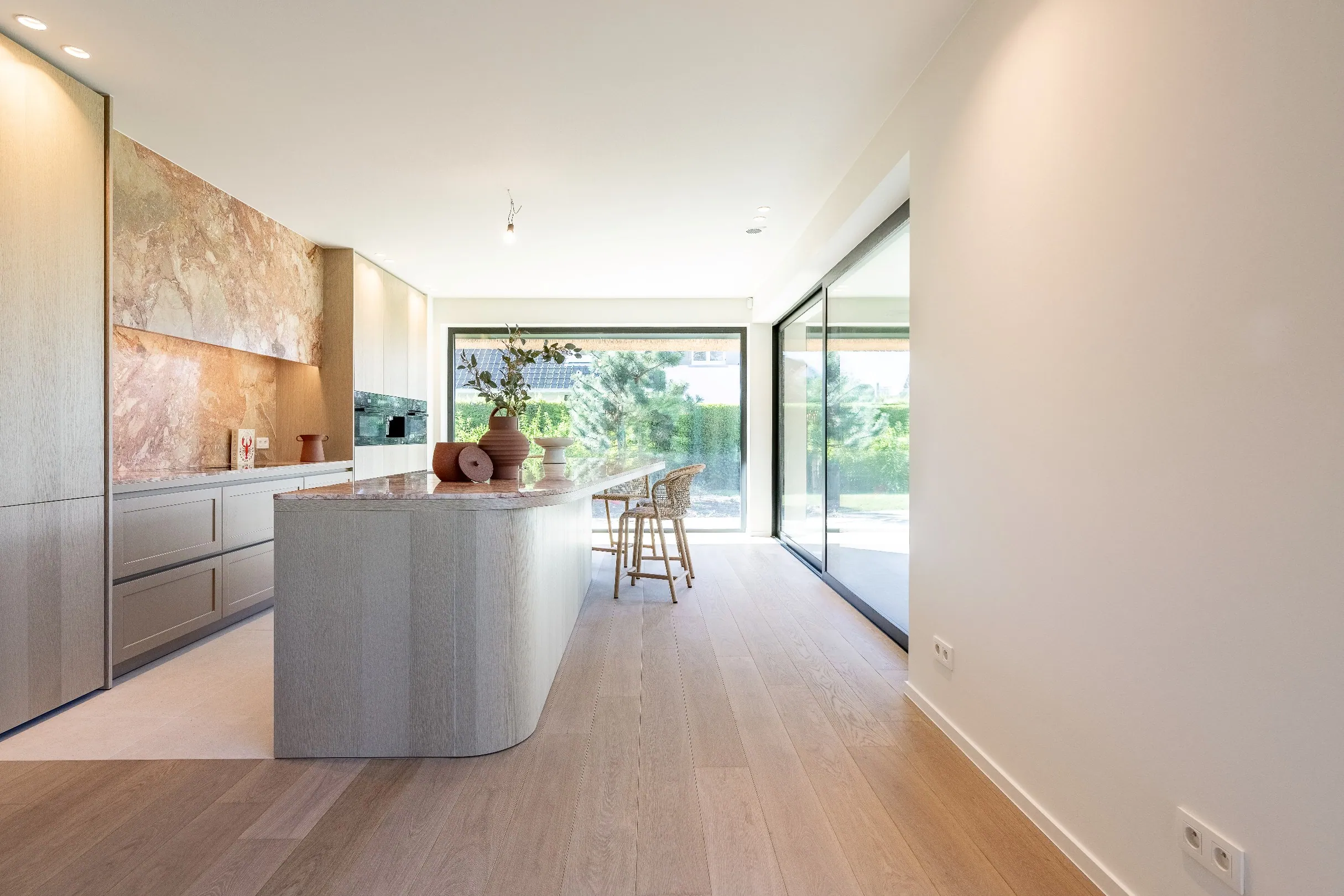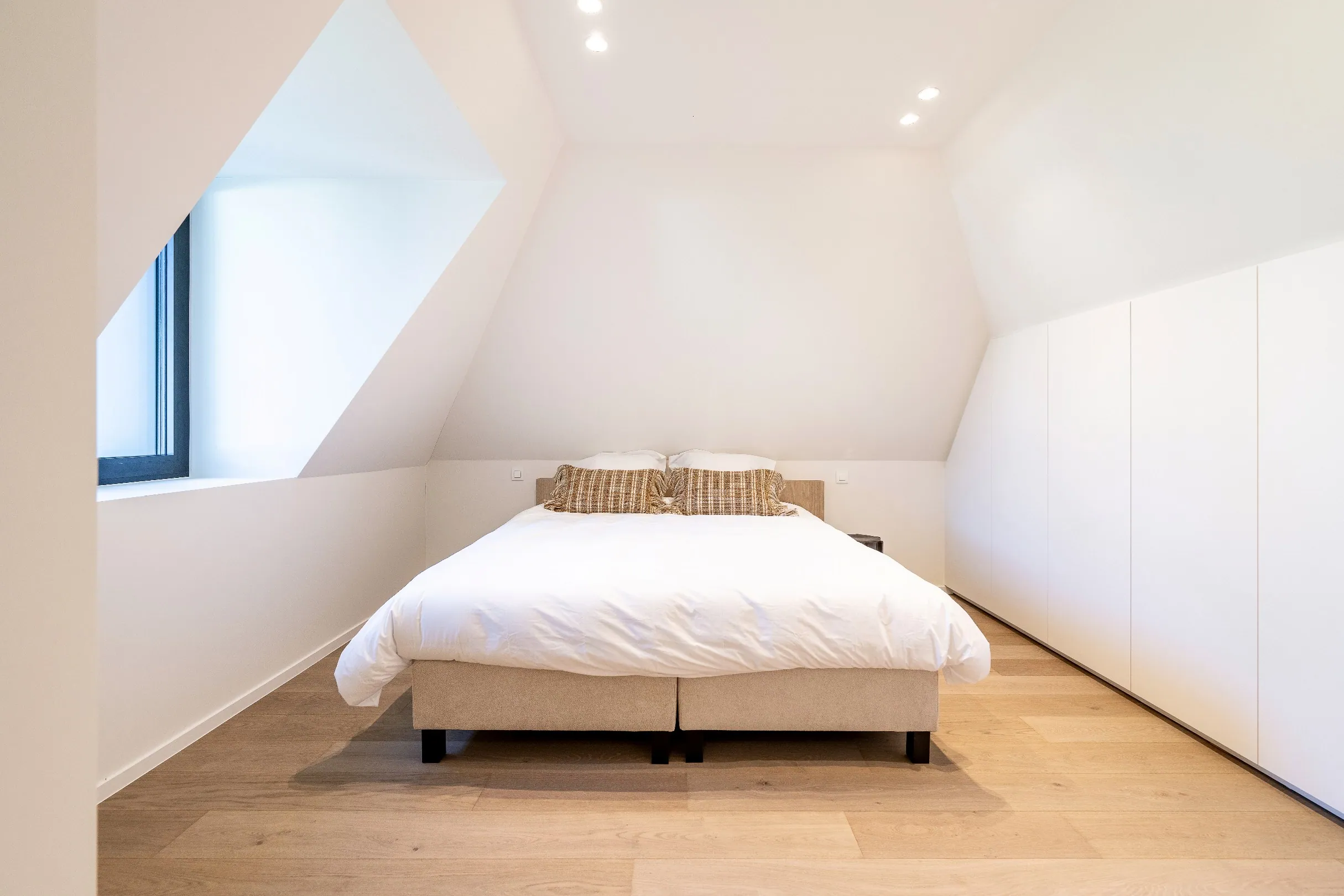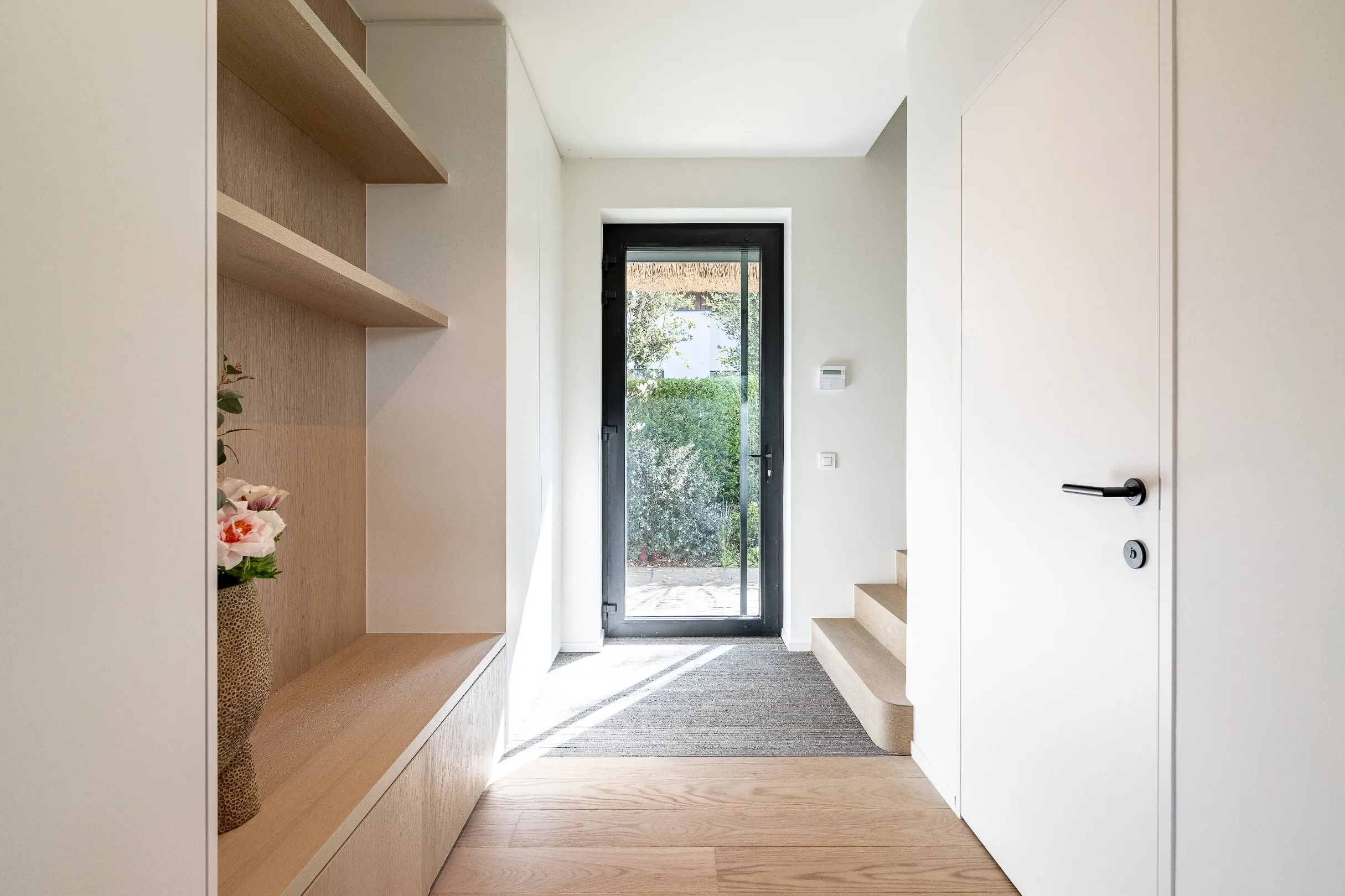 Afgewerkt met kwalitatieve en luxueuze materialen tot in detail. Garage voor 1 wagen en plaats voor enkele wagens voor de woning.