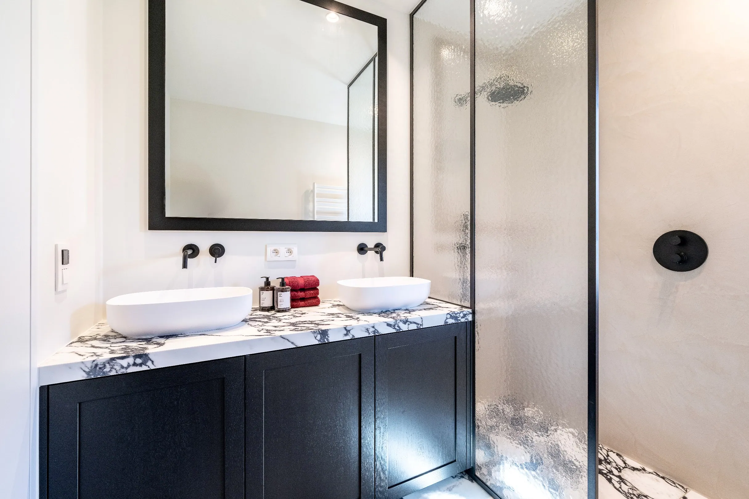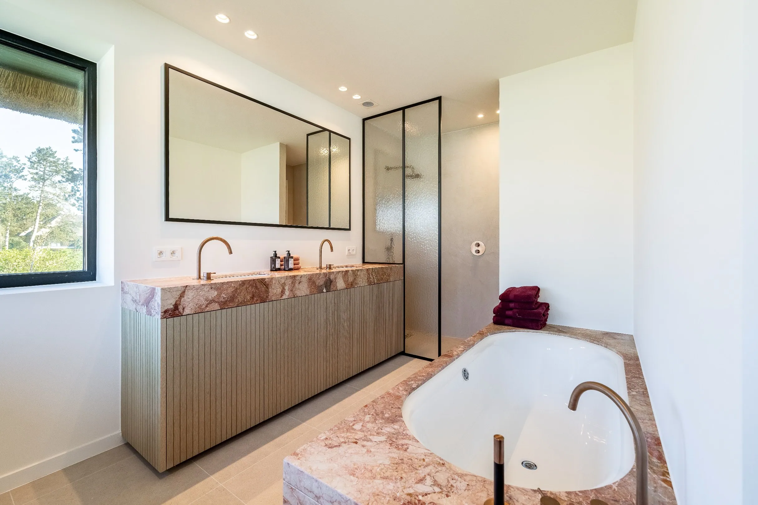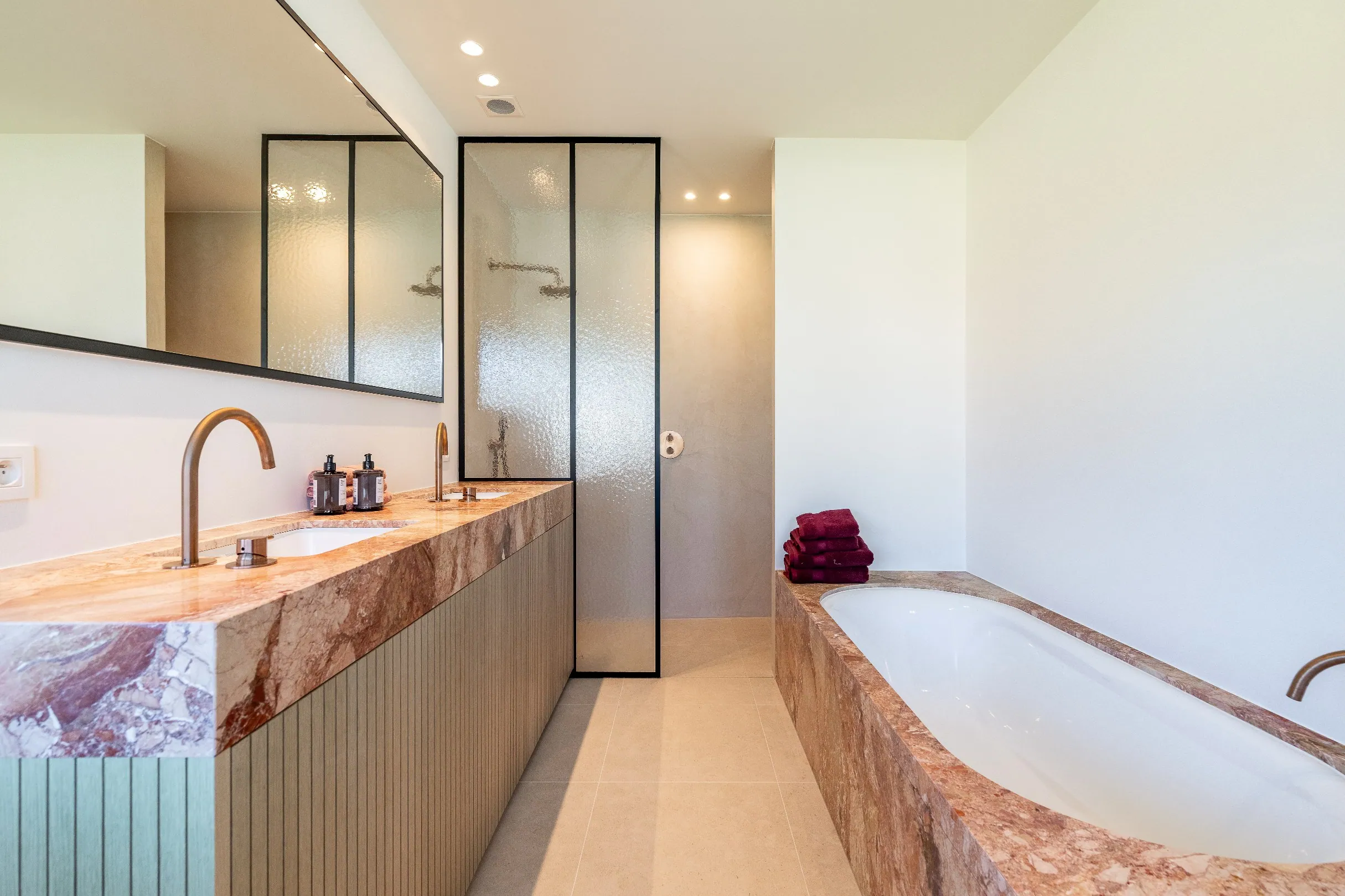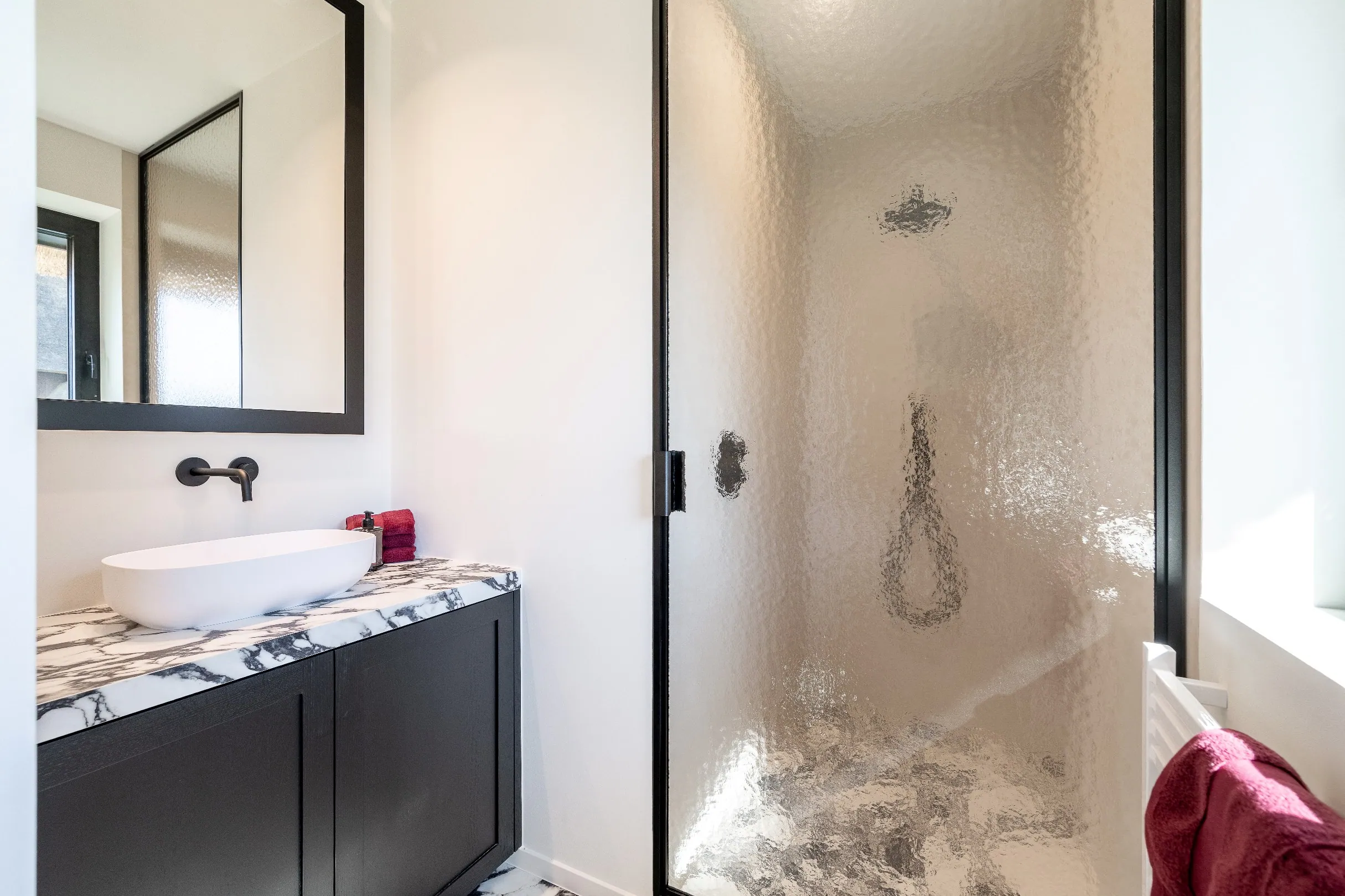 Afgewerkt met kwalitatieve en luxueuze materialen tot in detail. Garage voor 1 wagen en plaats voor enkele wagens voor de woning.