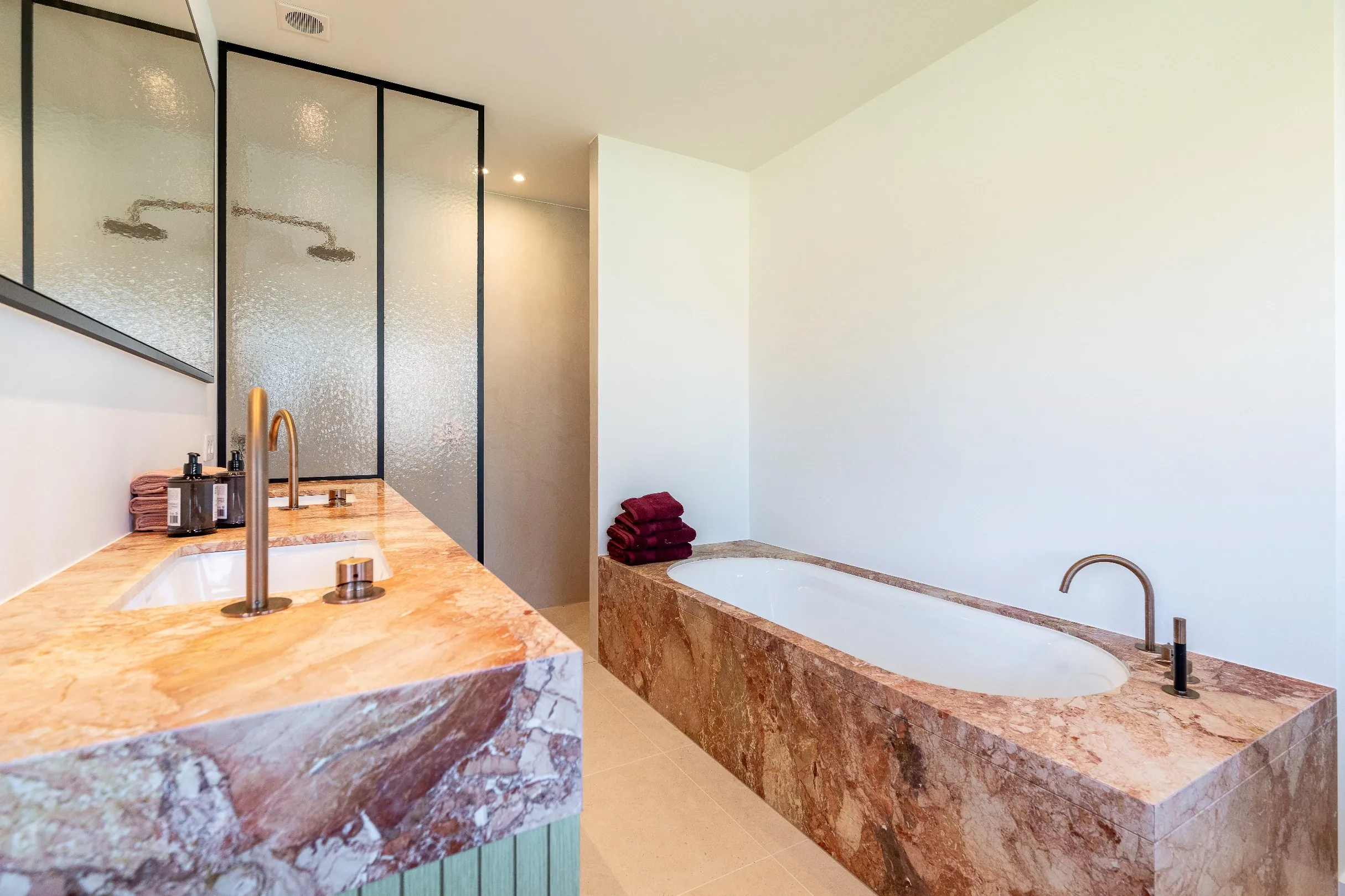 Op het verdiep treffen we de royale master bedroom met dressing en badkamer. Vervolgens nog 3 ruime kamers, ieder met hun eigen sanitair. Garage en koele berging. Outdoor parking voor meerdere wagens.