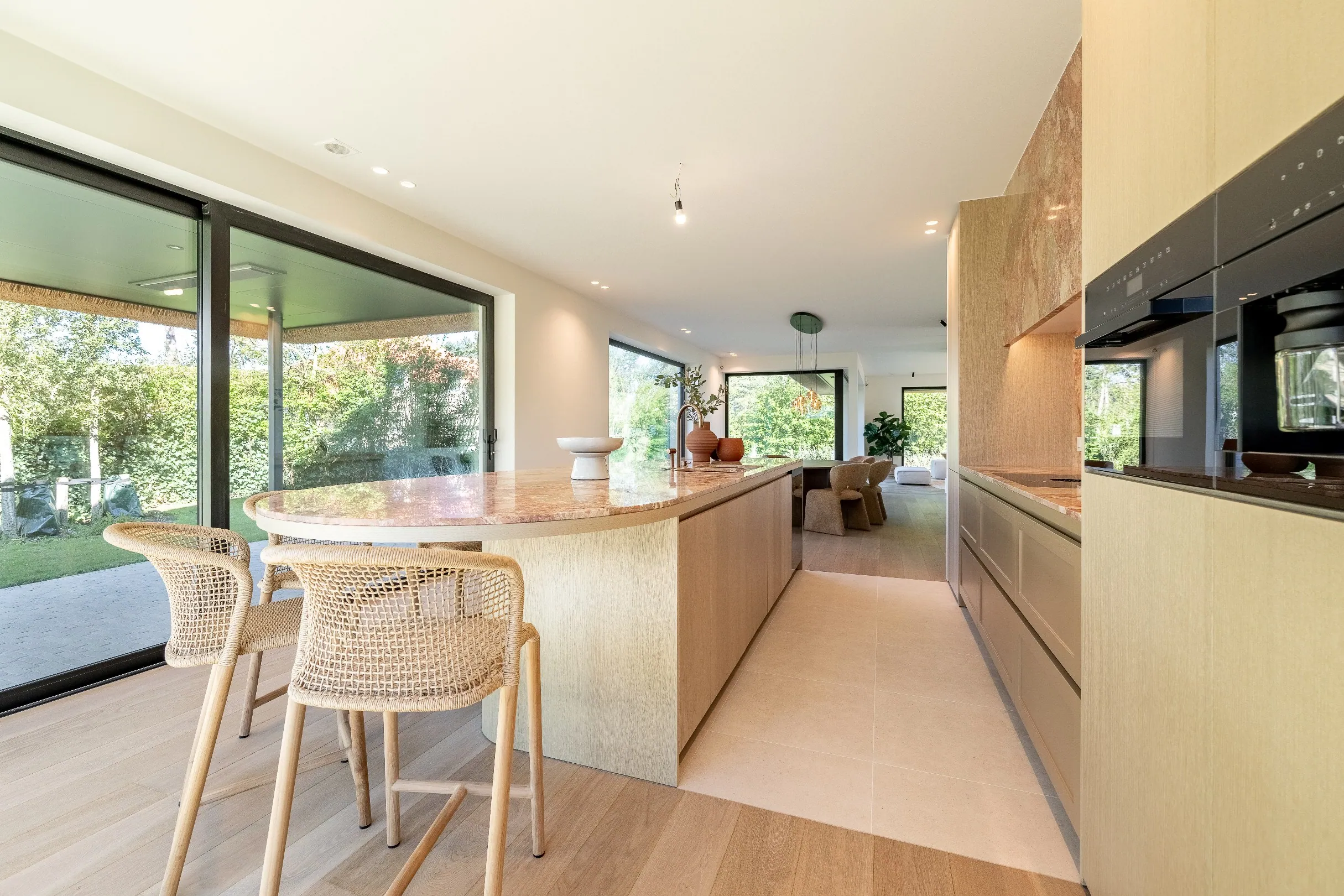 inkomhal met apart gastentoilet. Zeer ruime en lichtrijke leefruimte met zuid-west oriëntatie. Volledig geïnstalleerde en praktische open keuken voorzien van alle toestellen. Koelcel aansluitend aan de keuken. Alle ruimten zijn lichtrijk door de grote raampartijen en rechtstreeks toegang naar de tuin en de verschillende terrassen om gedurende de gehele dag te genieten van de zon.