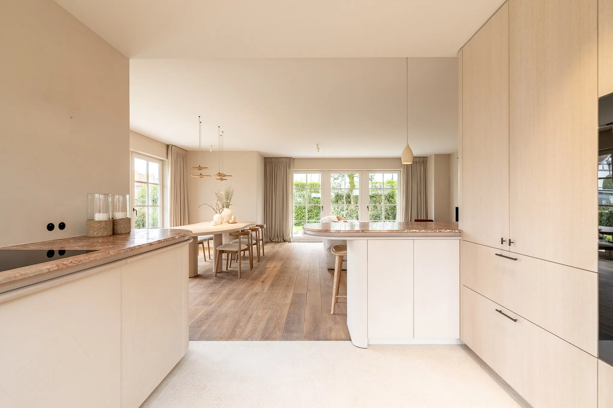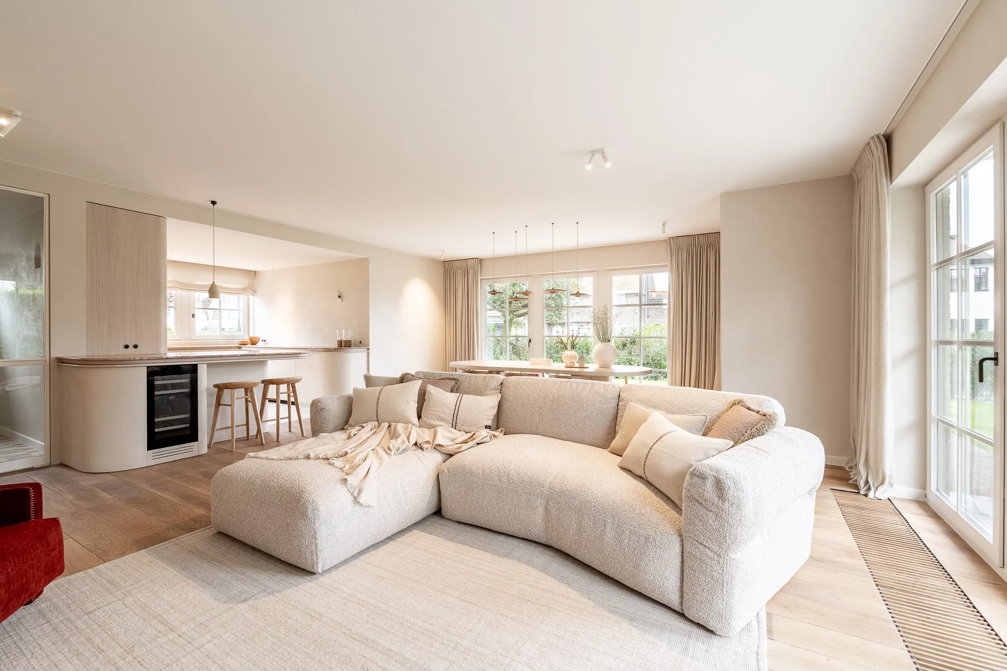 Bij binnenkomst verwelkomt de inkomhal u met een vestiaire en een gastentoilet. De ruime en lichtrijke leef- en eetruimte geven uit op een zonnig terras en een mooi aangelegde tuin met zuidwestelijke oriëntatie – ideaal om de hele dag van de zon te genieten. De keuken is volledig uitgerust en praktisch ingericht.