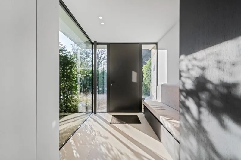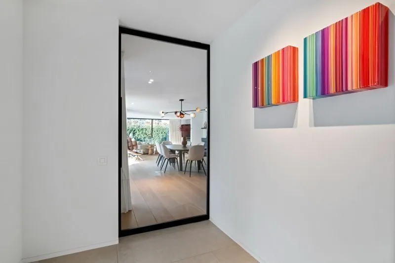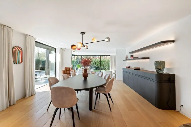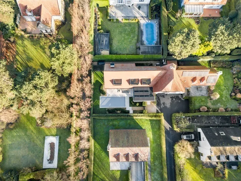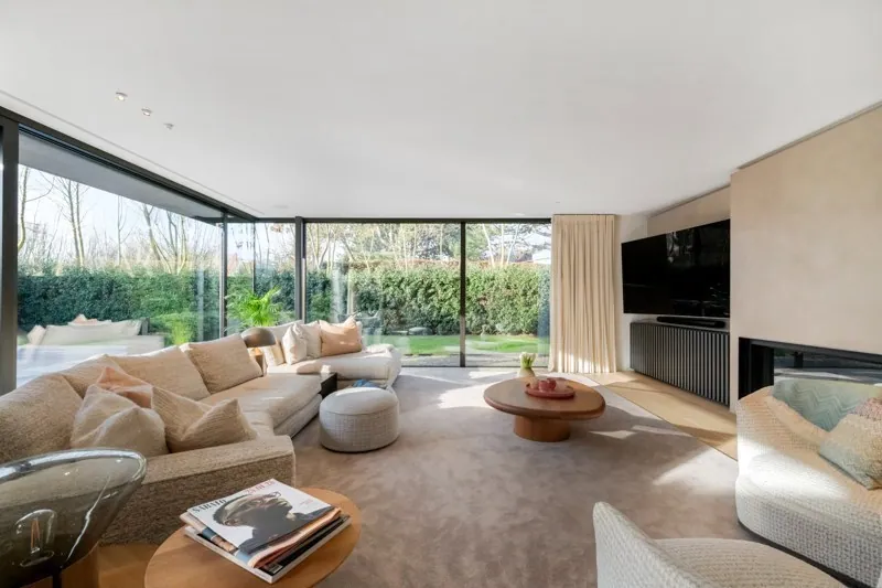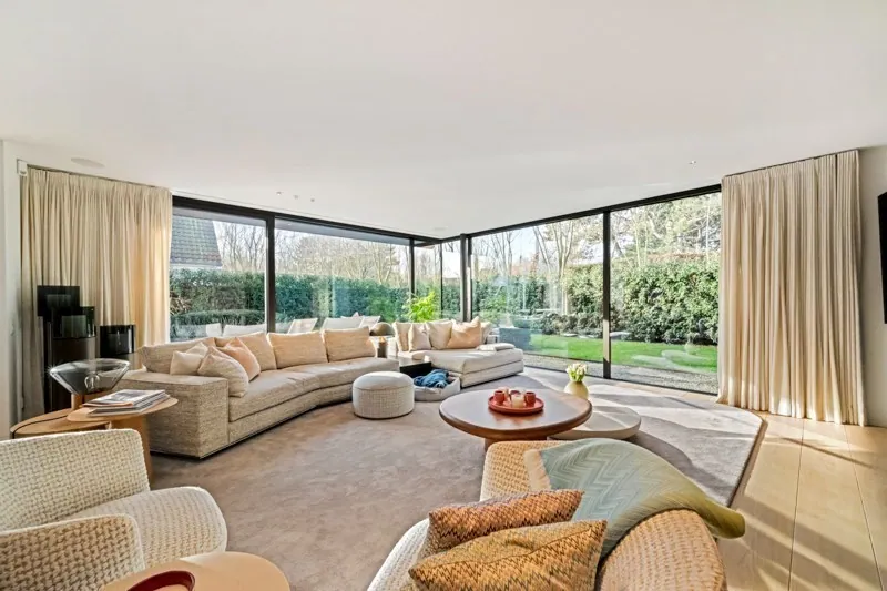Indeling: Inkom met mooie vestiaire en gastentoilet. Zéér lichtrijke leefruimte met veel glaspartijen met eetplaats en zithoek met gashaard en toegang via schuifraam naar terras en tuin. Volledig ingerichte keuken. Bijkeuken met koelcel / wasplaats.