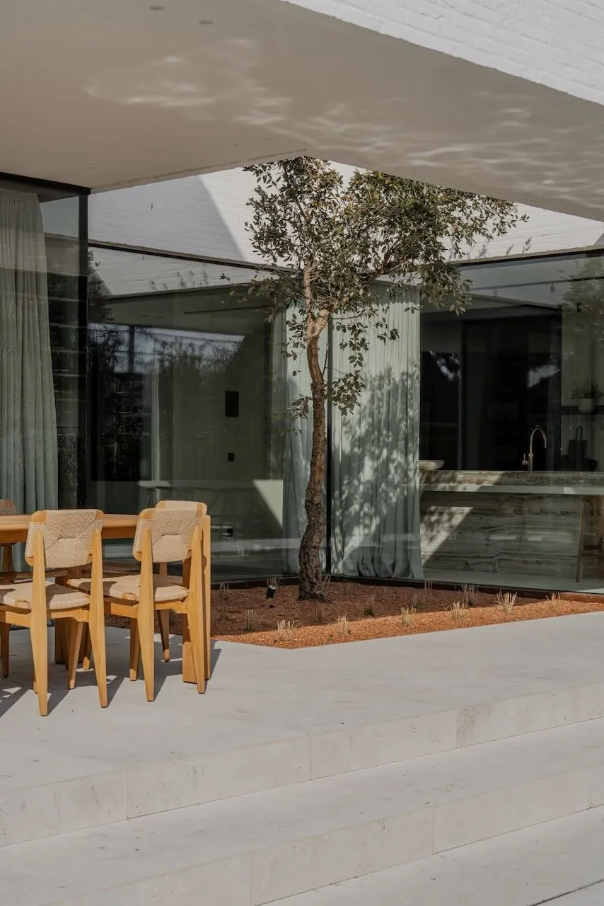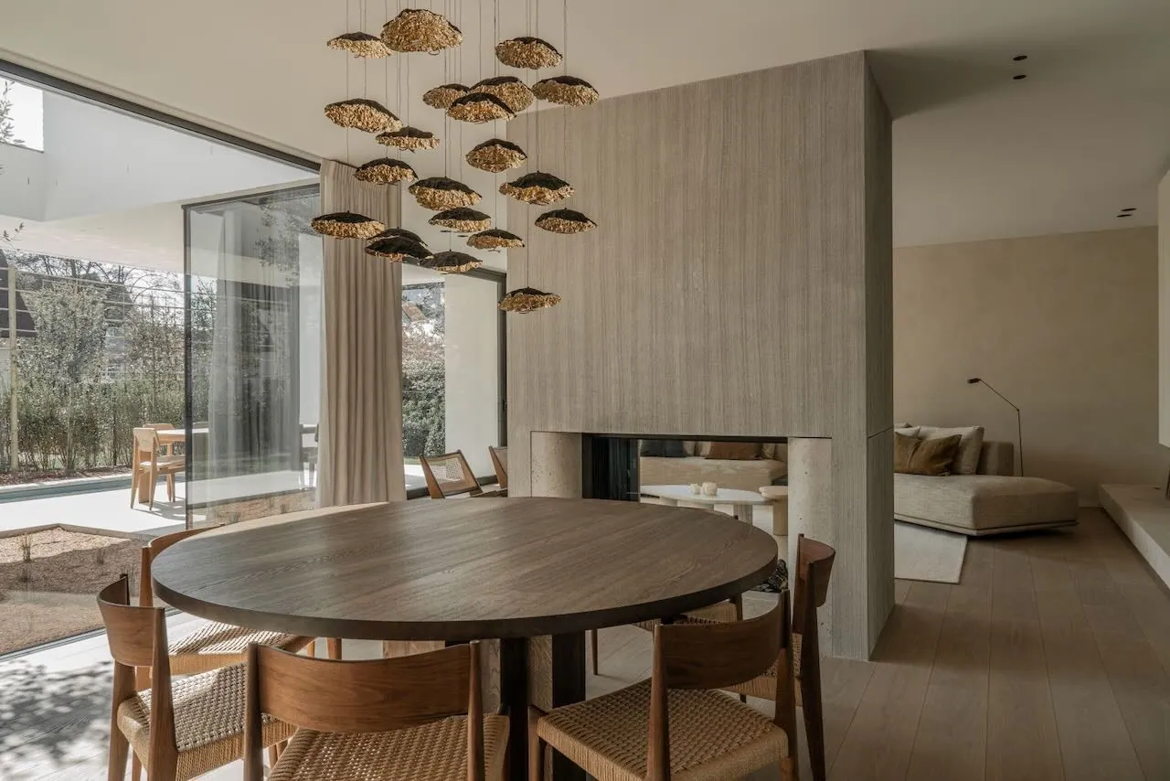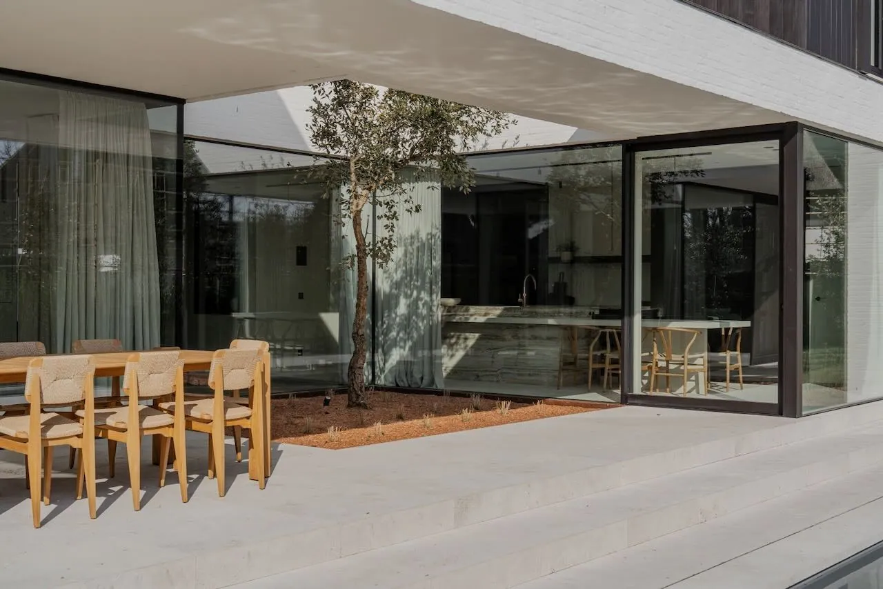 Bij het betreden van de woning wordt u verwelkomd in een stijlvolle inkomhal met vestiaire en gastentoilet. De ruime eet- en leefruimte geniet van een overvloed aan natuurlijk licht en geeft uit op een prachtig aangelegd terras. De open keuken is volledig uitgerust met kwalitatieve toestellen en biedt alle hedendaagse comfort.