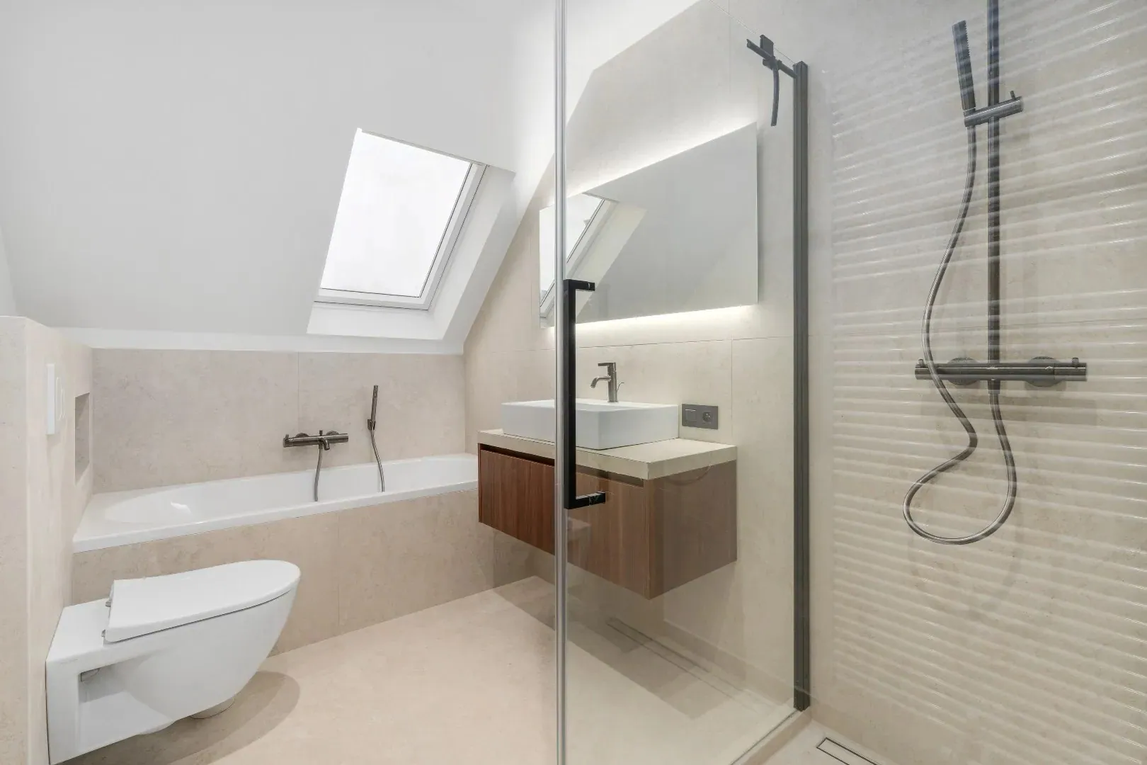 - Recent gerenoveerde badkamer met toilet, inloopdouche, wastafel en ligbad,