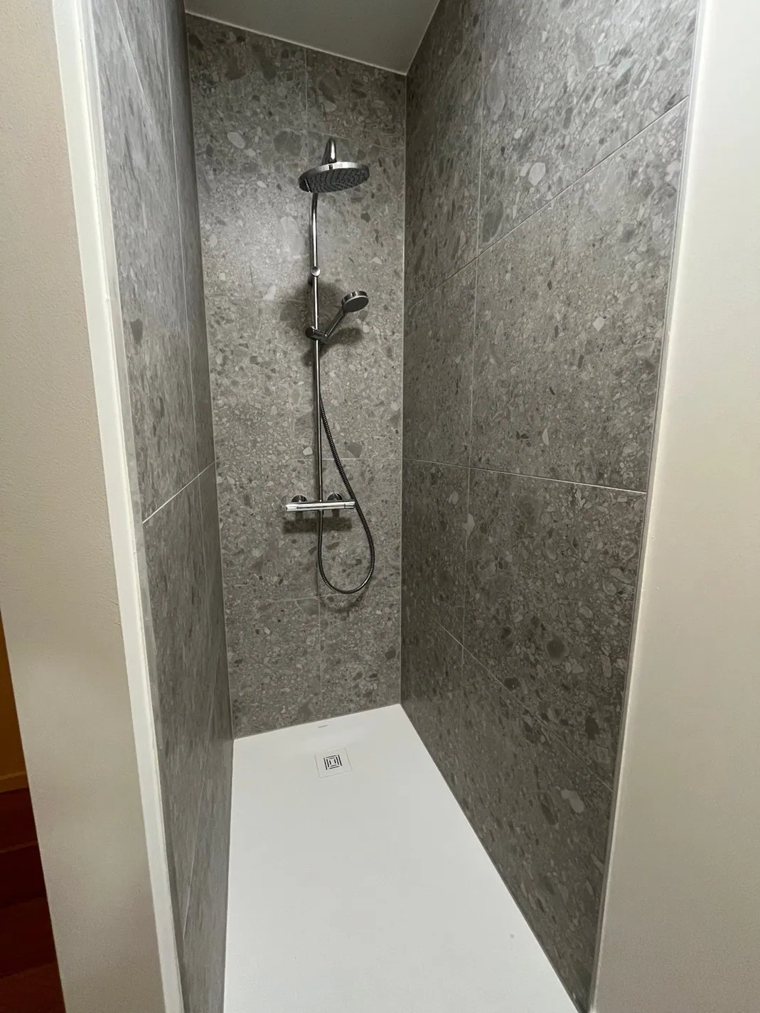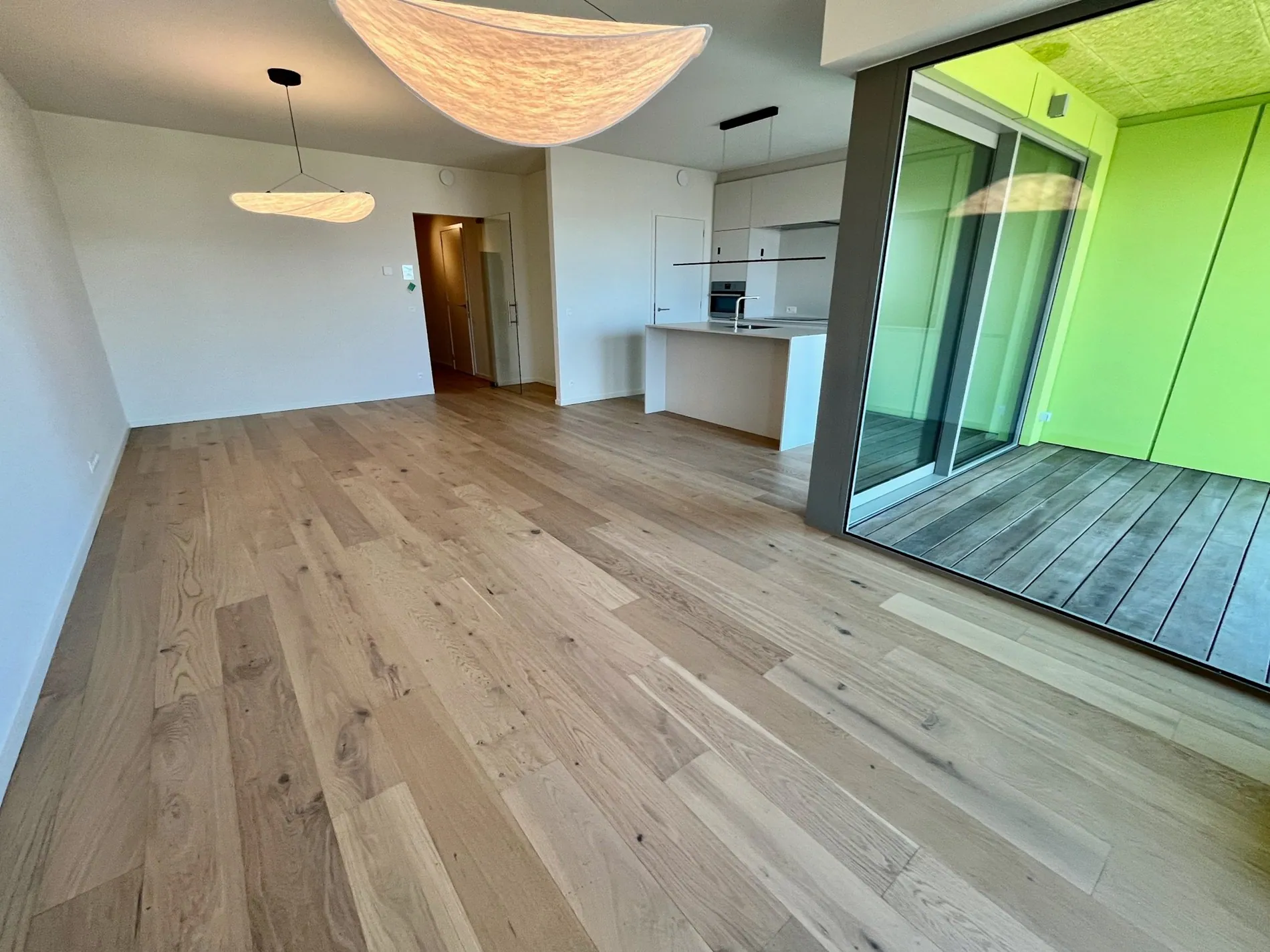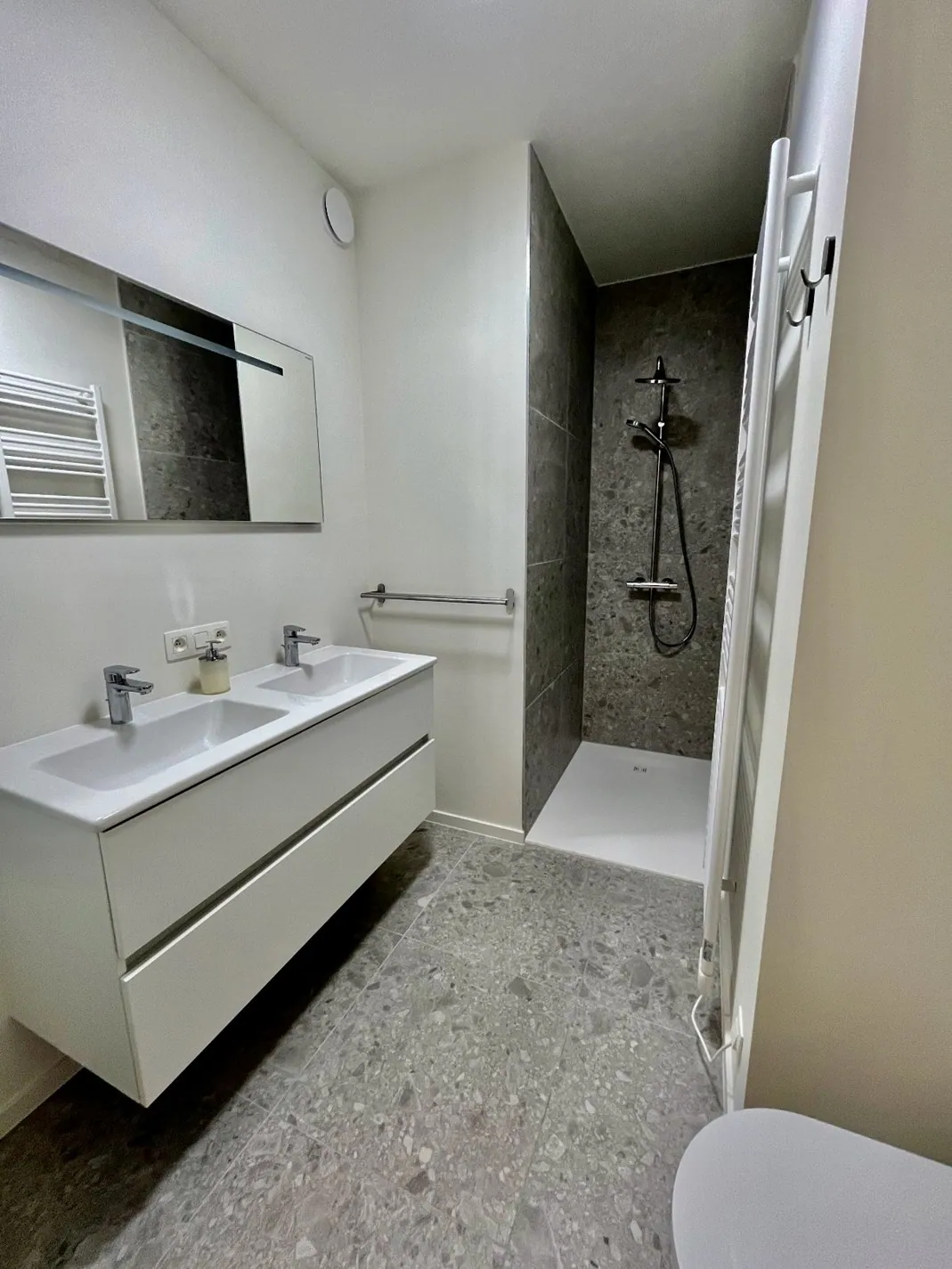 Disposition : hall d'entrée, toilettes invités, salon, cuisine ouverte, débarras, terrasse, débarras technique (avec raccordement pour machine à laver), 2 chambres à coucher, chacune avec une salle de douche attenante.