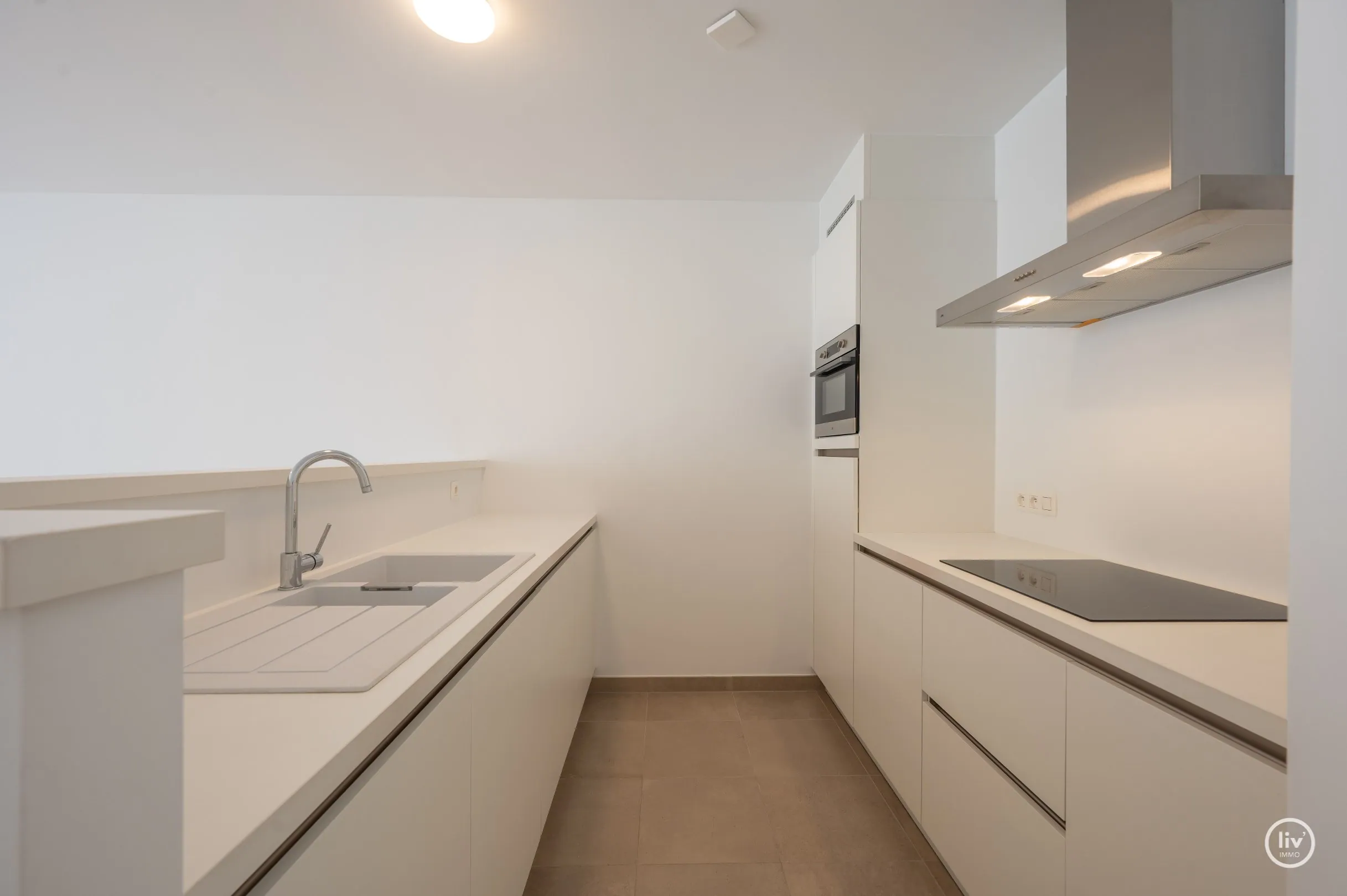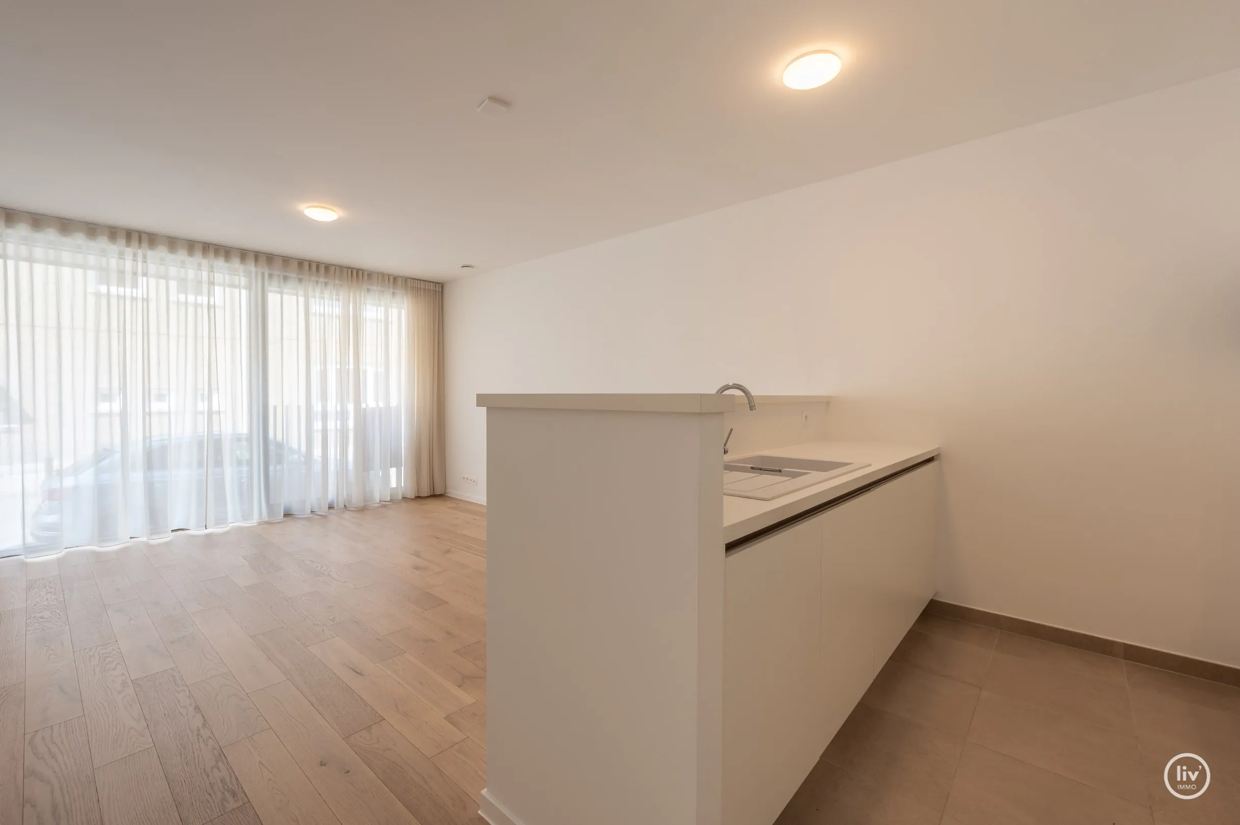 NON MEUBLÉ - appartement de plain-pied avec 1 chambre et terrasse, à proximité du centre commercial de Knokke. AMÉNAGEMENT: Hall d'entrée avec salon en parquet stratifié; cuisine ouverte équipée, espace de rangement séparé (connexion machine à laver); toilettes invités, chambre avec salle de bains attenante. Accès à la grande terrasse.