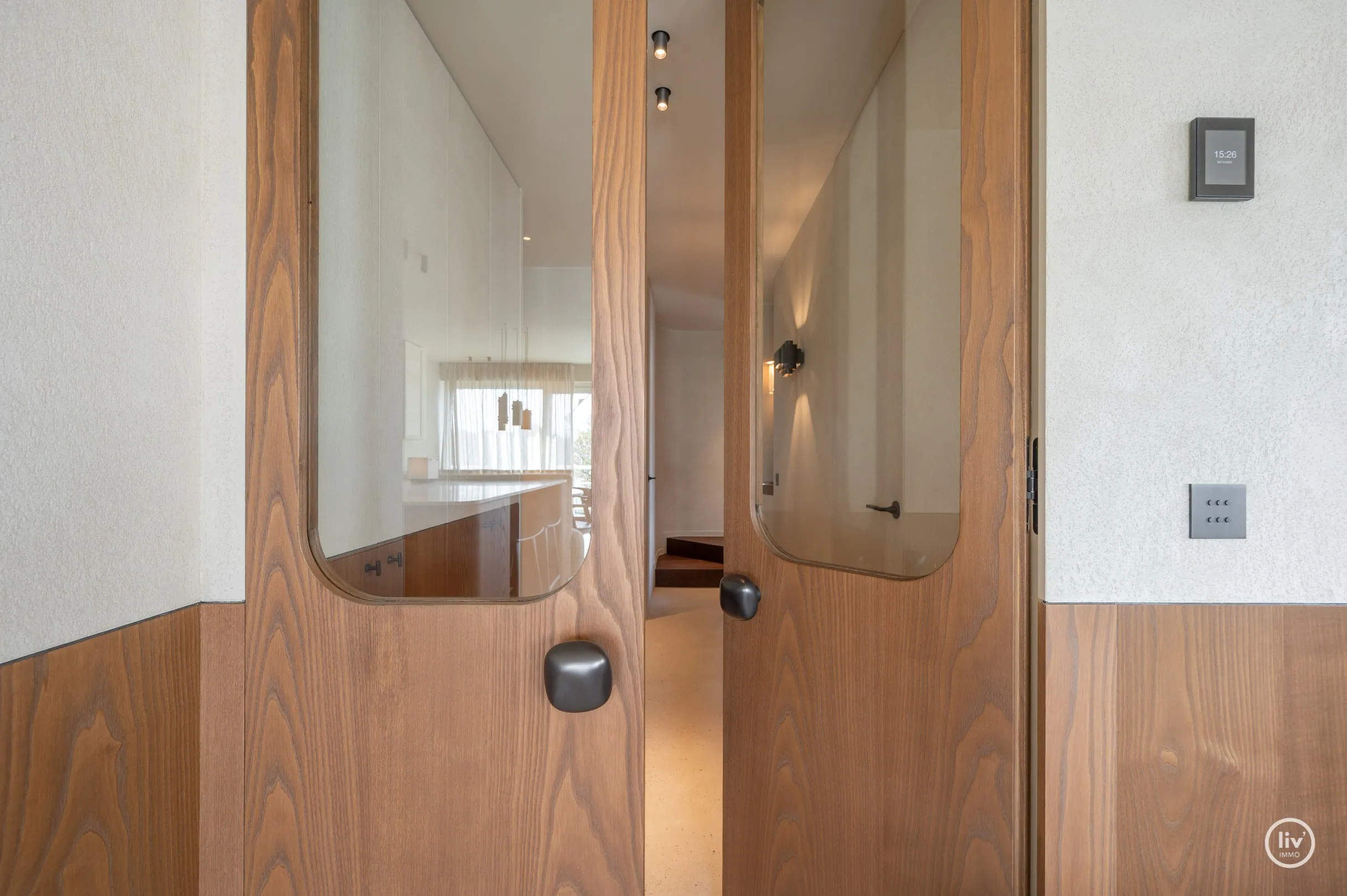 Hall d'entrée élégant avec vestiaire et toilettes d'invités. Le salon spacieux avec salle à manger et cuisine ouverte entièrement équipée baigne dans la lumière naturelle et offre un accès direct à la terrasse agréable.