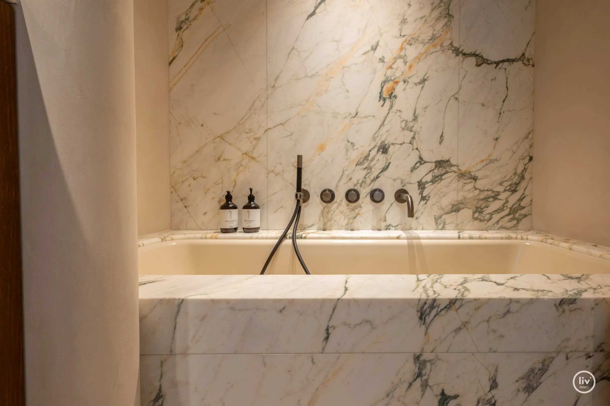 La finition en marbre Calacatta, magnifiquement arrondie et présente dans toutes les pièces, respire la classe pure et l'élégance intemporelle.