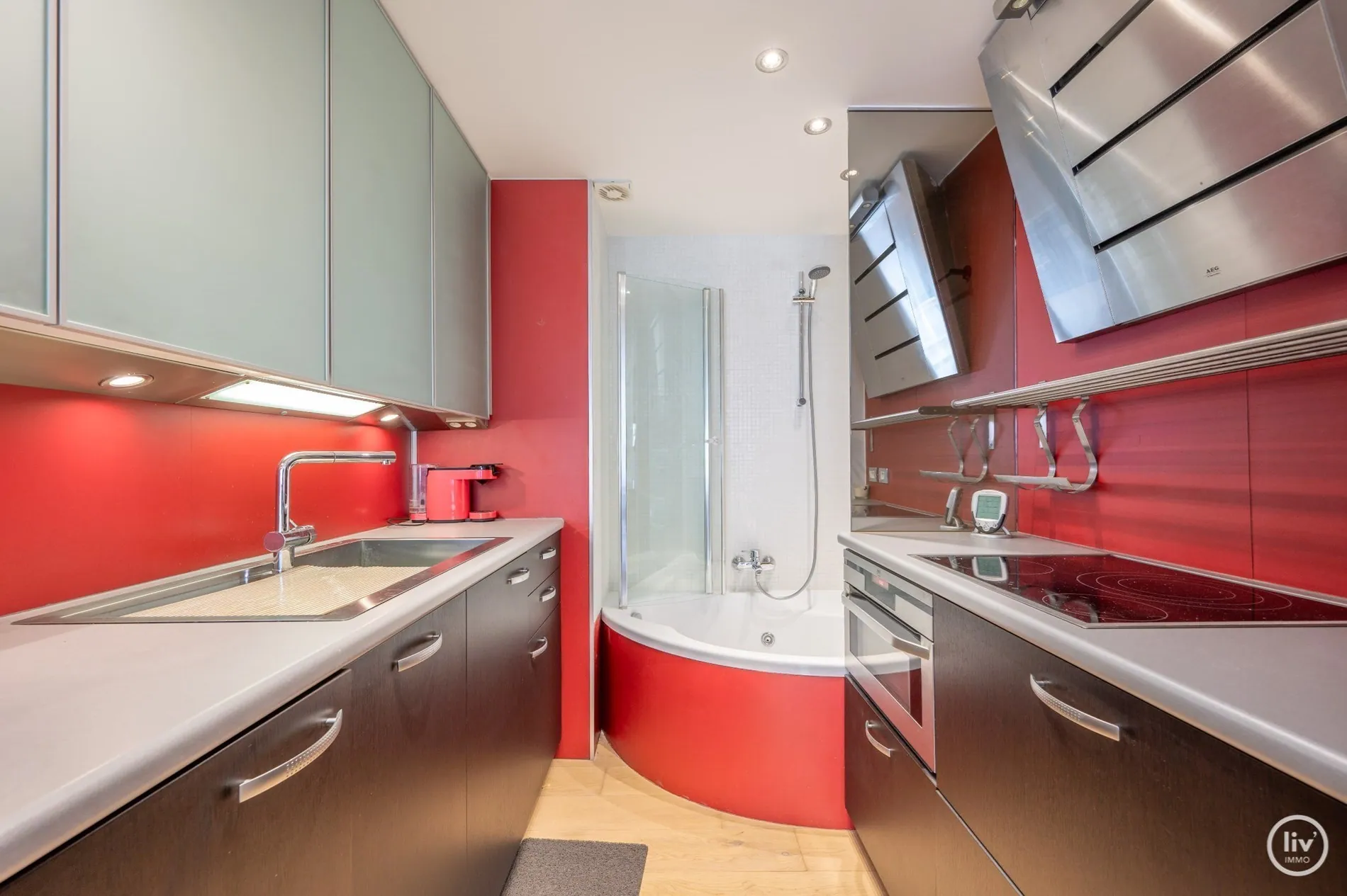 Disposition : hall d'entrée, toilettes séparées avec lavabo, séjour avec placards intégrés, cuisine moderne semi-ouverte avec hotte professionnelle, réfrigérateur américain encastré, lave-vaisselle, four combiné. Baignoire jacuzzi.