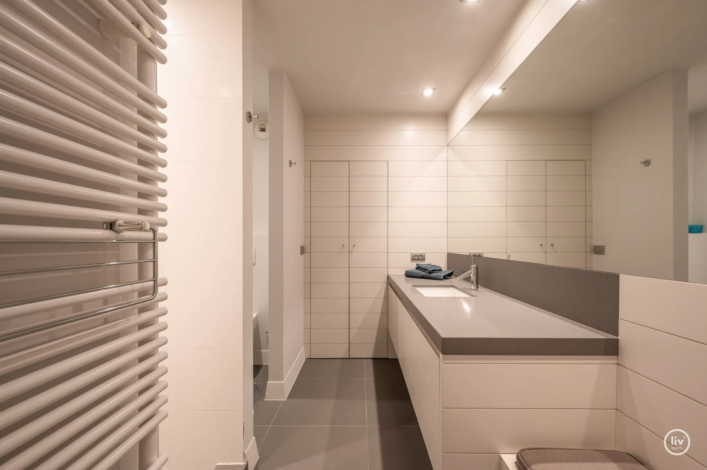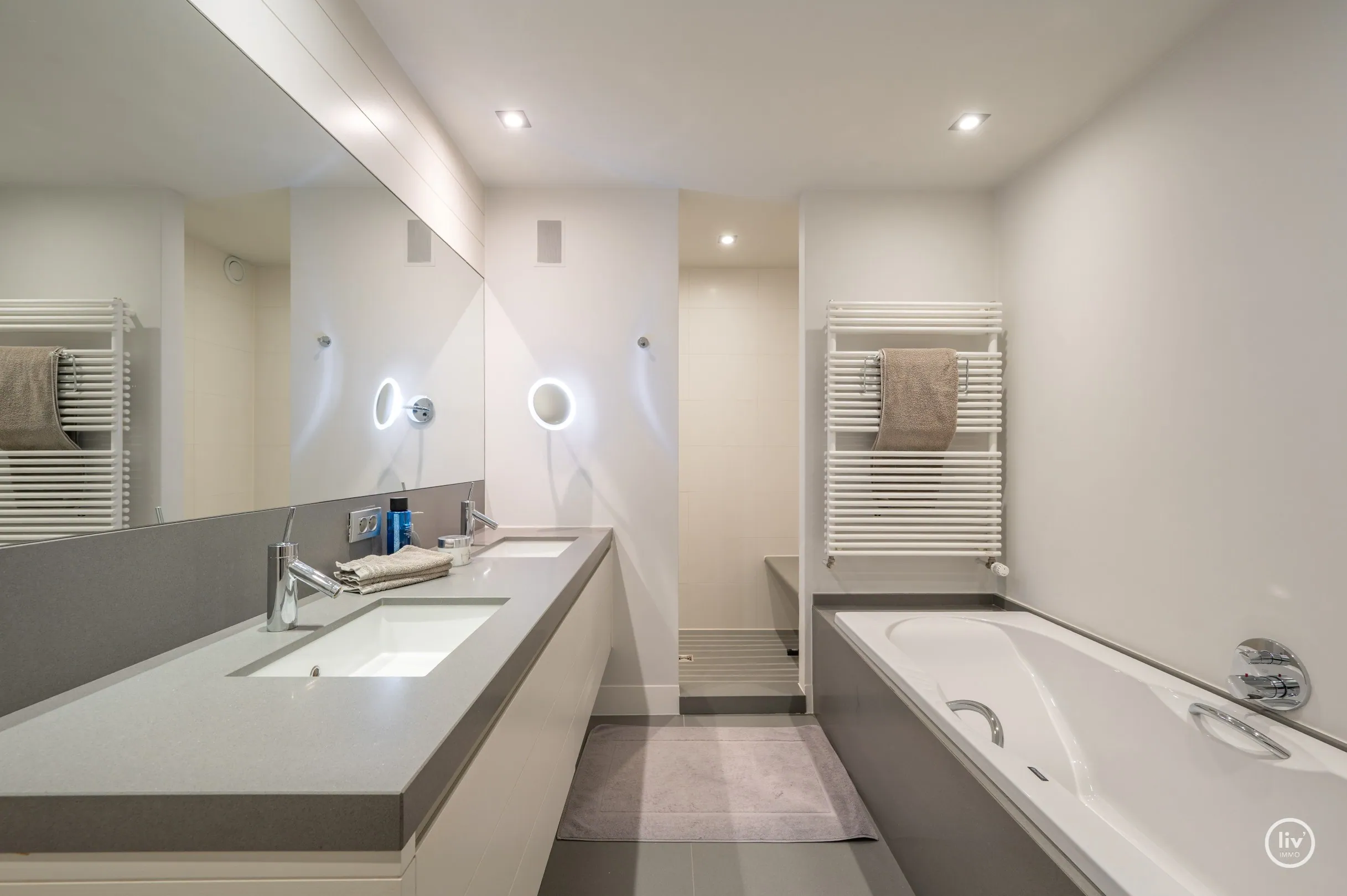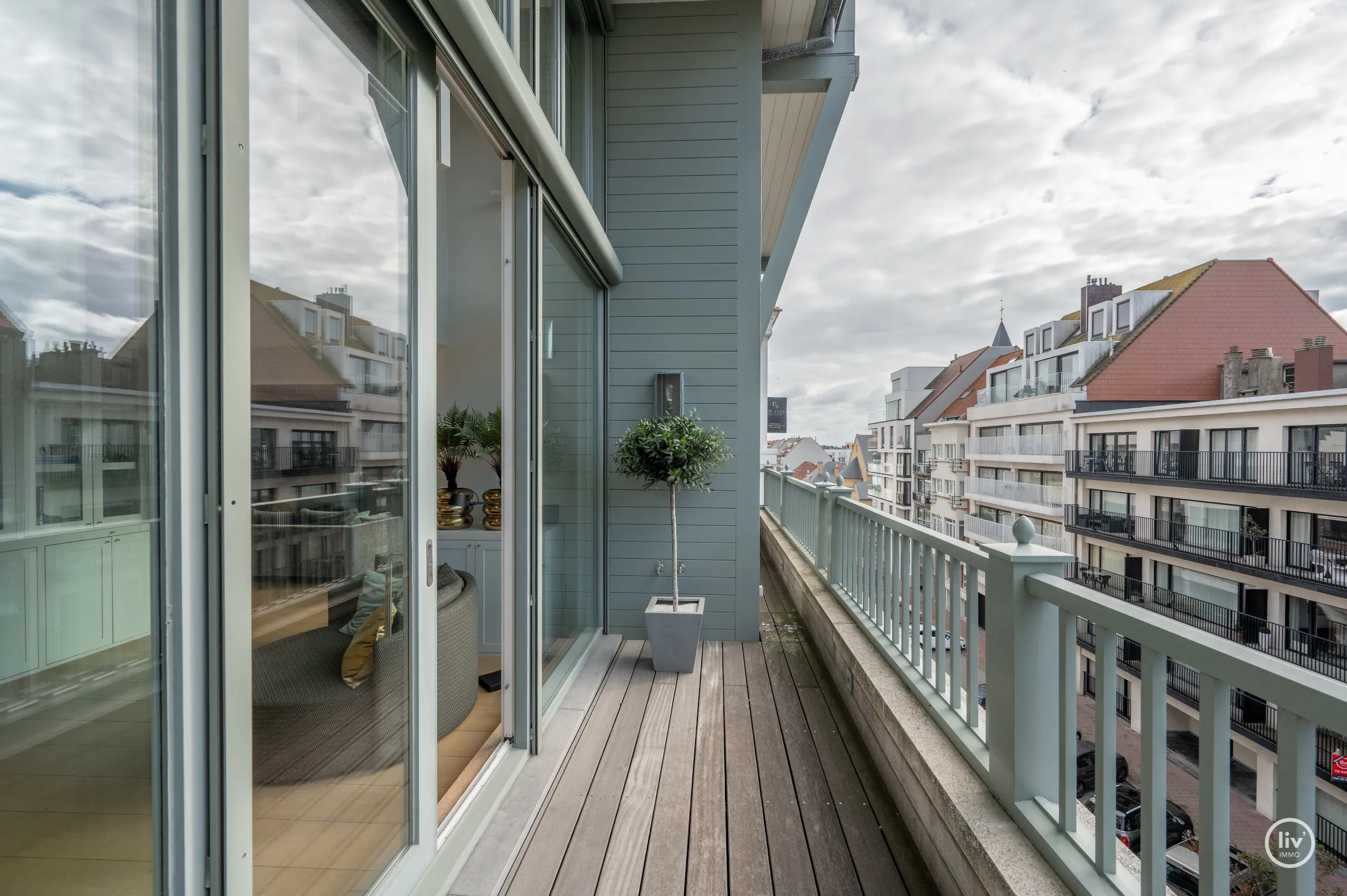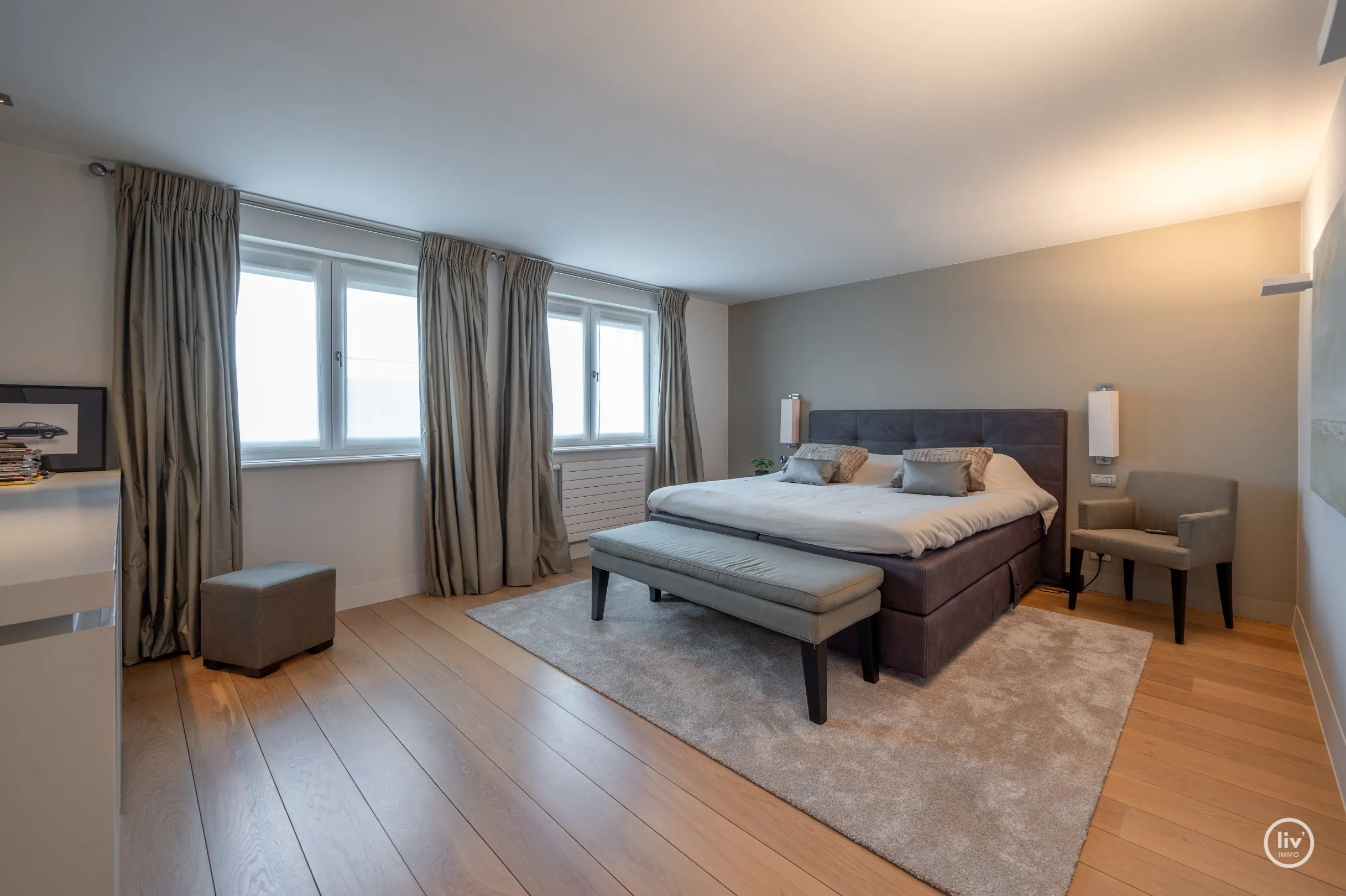 Duplex parfaitement fini de 292 m2 avec 3 chambres et terrasses ensoleillées (25m2) situé au centre de Knokke, à quelques pas de la Dumortierlaan, belles vues dégagées. Parfaitement orienté au sud-ouest.