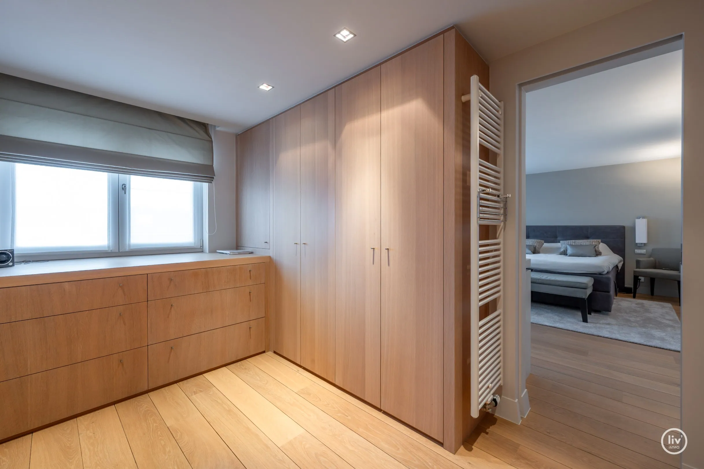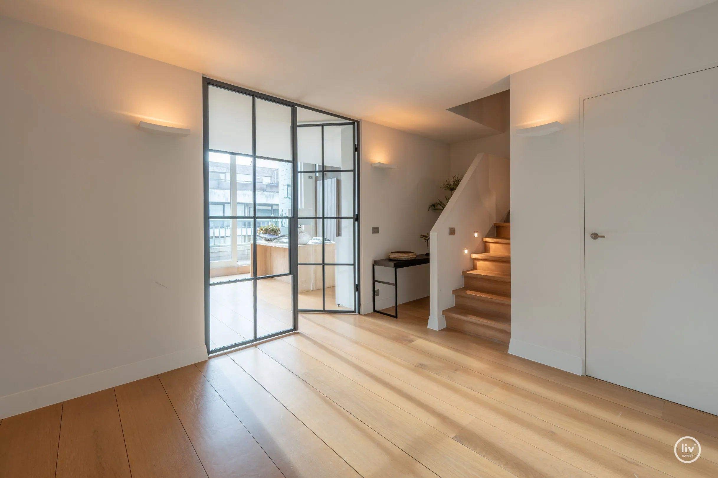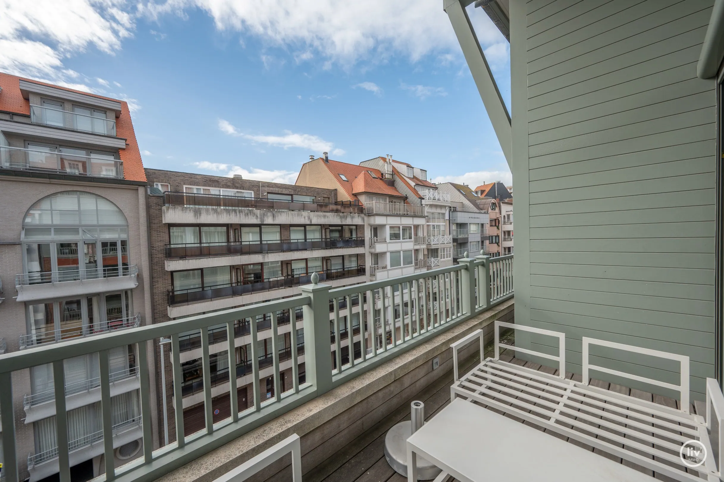 Duplex parfaitement fini de 292 m2 avec 3 chambres et terrasses ensoleillées (25m2) situé au centre de Knokke, à quelques pas de la Dumortierlaan, belles vues dégagées. Parfaitement orienté au sud-ouest.