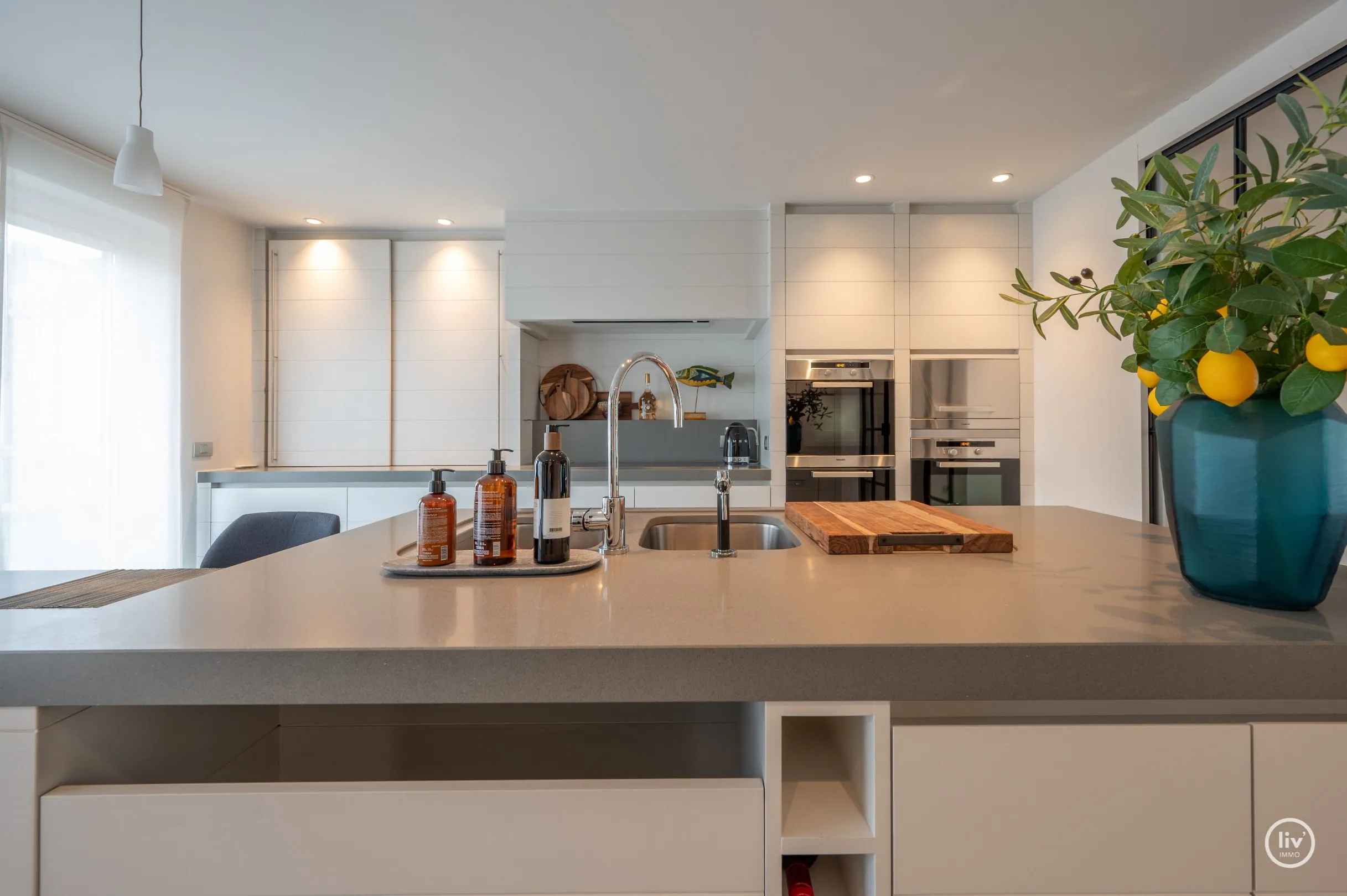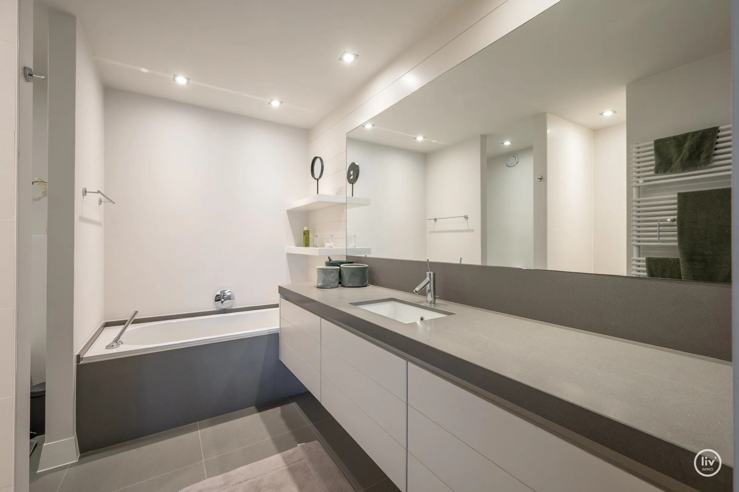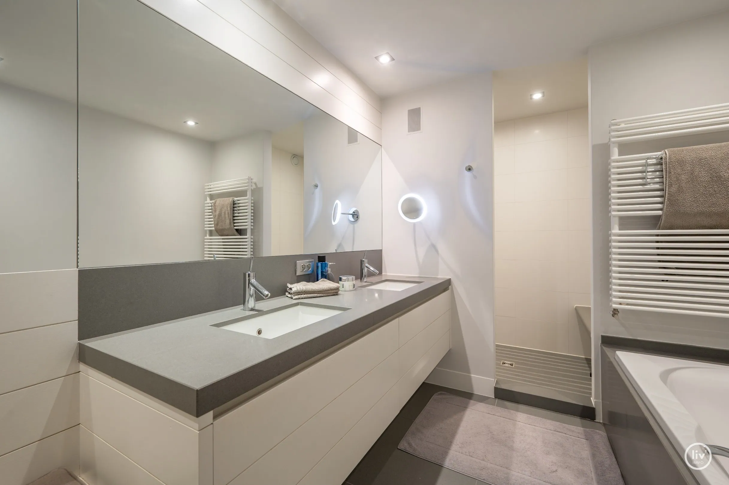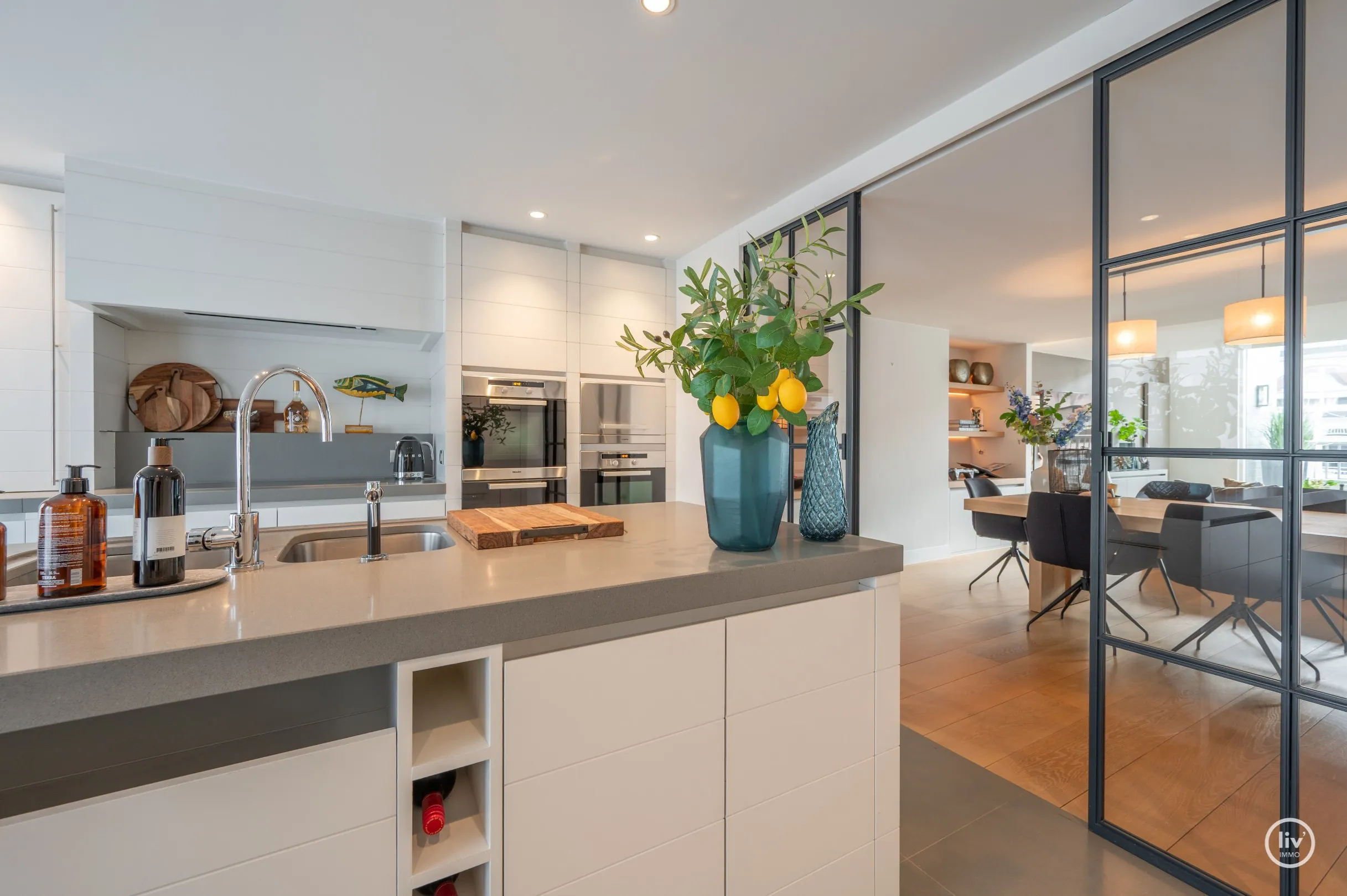 Duplex parfaitement fini de 292 m2 avec 3 chambres et terrasses ensoleillées (25m2) situé au centre de Knokke, à quelques pas de la Dumortierlaan, belles vues dégagées. Parfaitement orienté au sud-ouest.