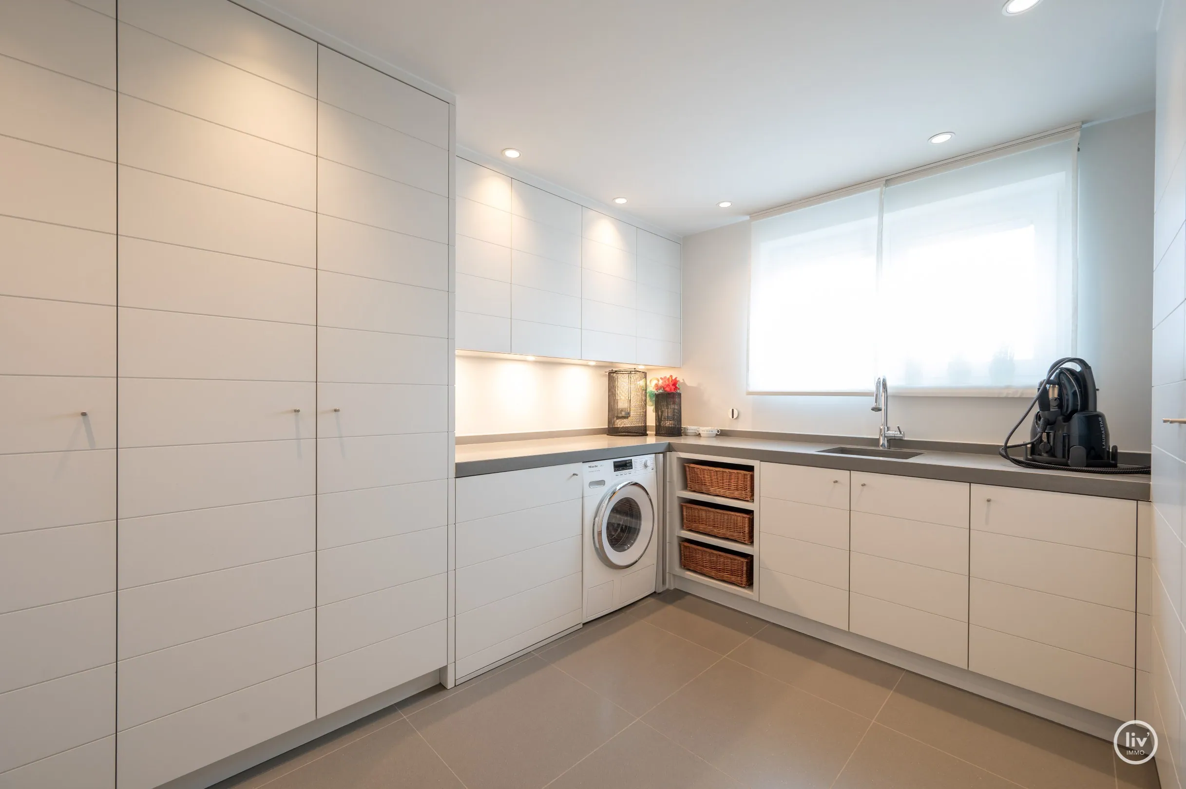 4ème étage : hall d'entrée avec vestiaire et toilettes invités. Salon spacieux et lumineux avec salon confortable et coin bureau avec une belle largeur de 11 mètres. Terrasse spacieuse à l'avant avec orientation sud-ouest et belle vue dégagée. Salle à manger agréable. Cuisine magnifique et entièrement équipée avec électroménager de qualité avec îlot/coin petit-déjeuner, buanderie pratique.